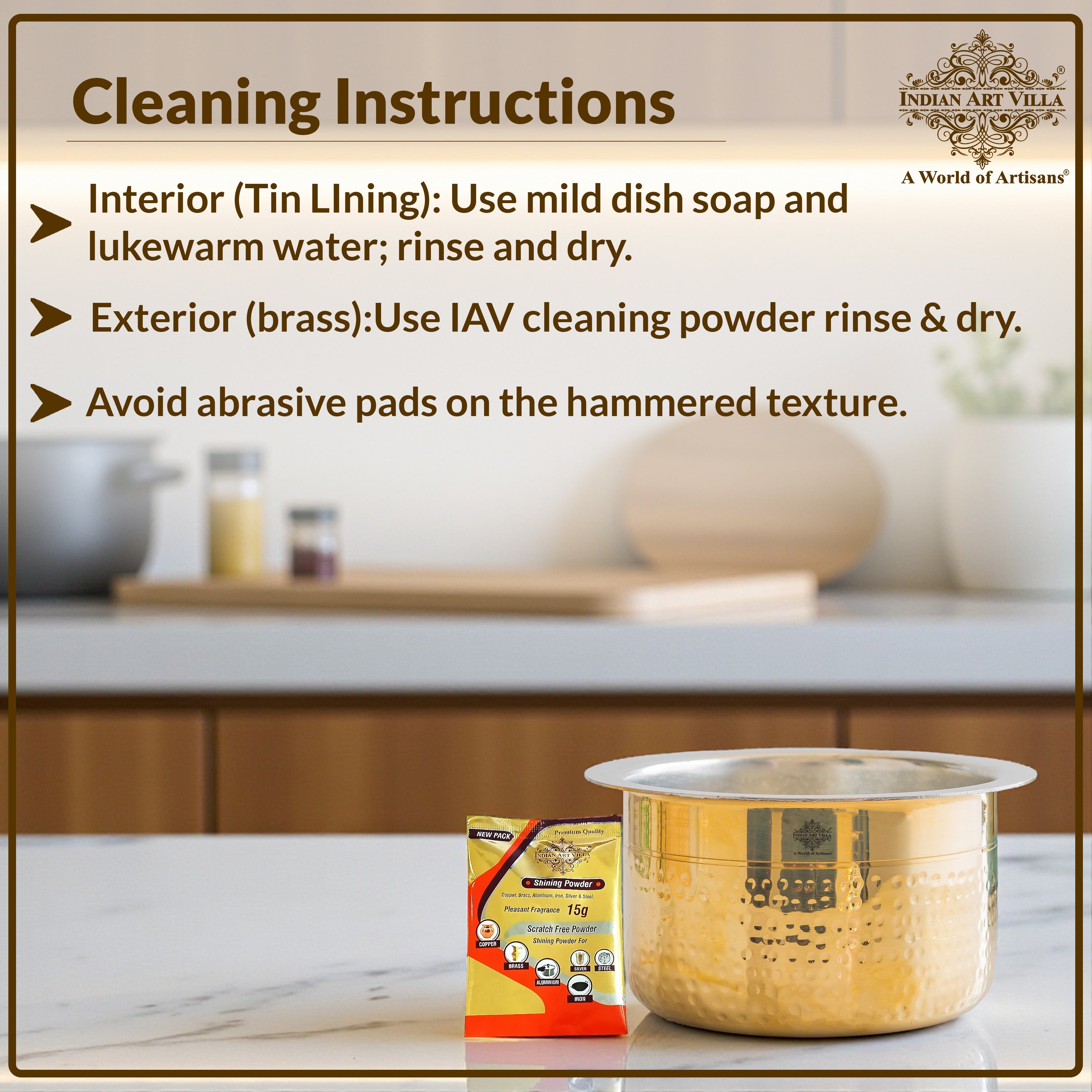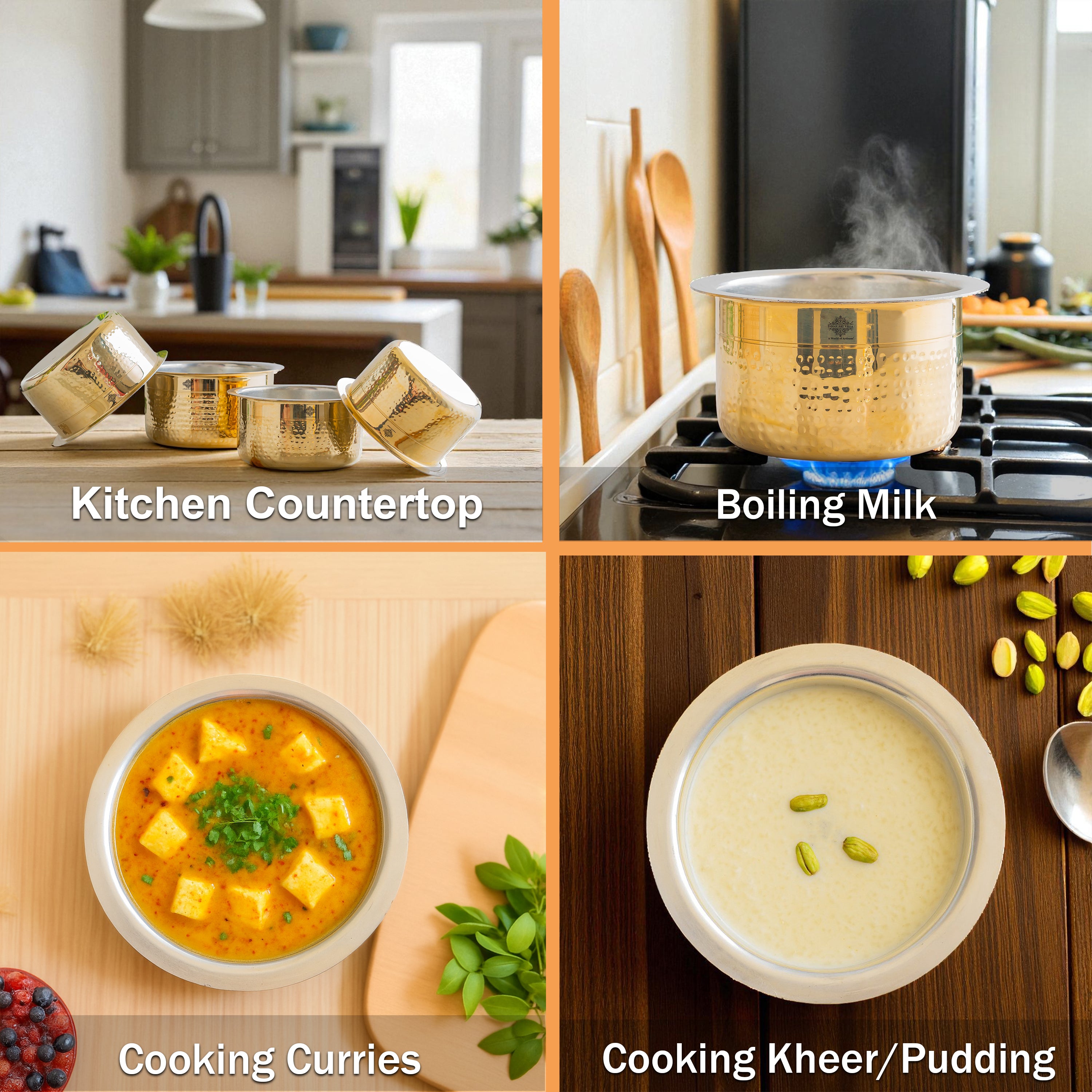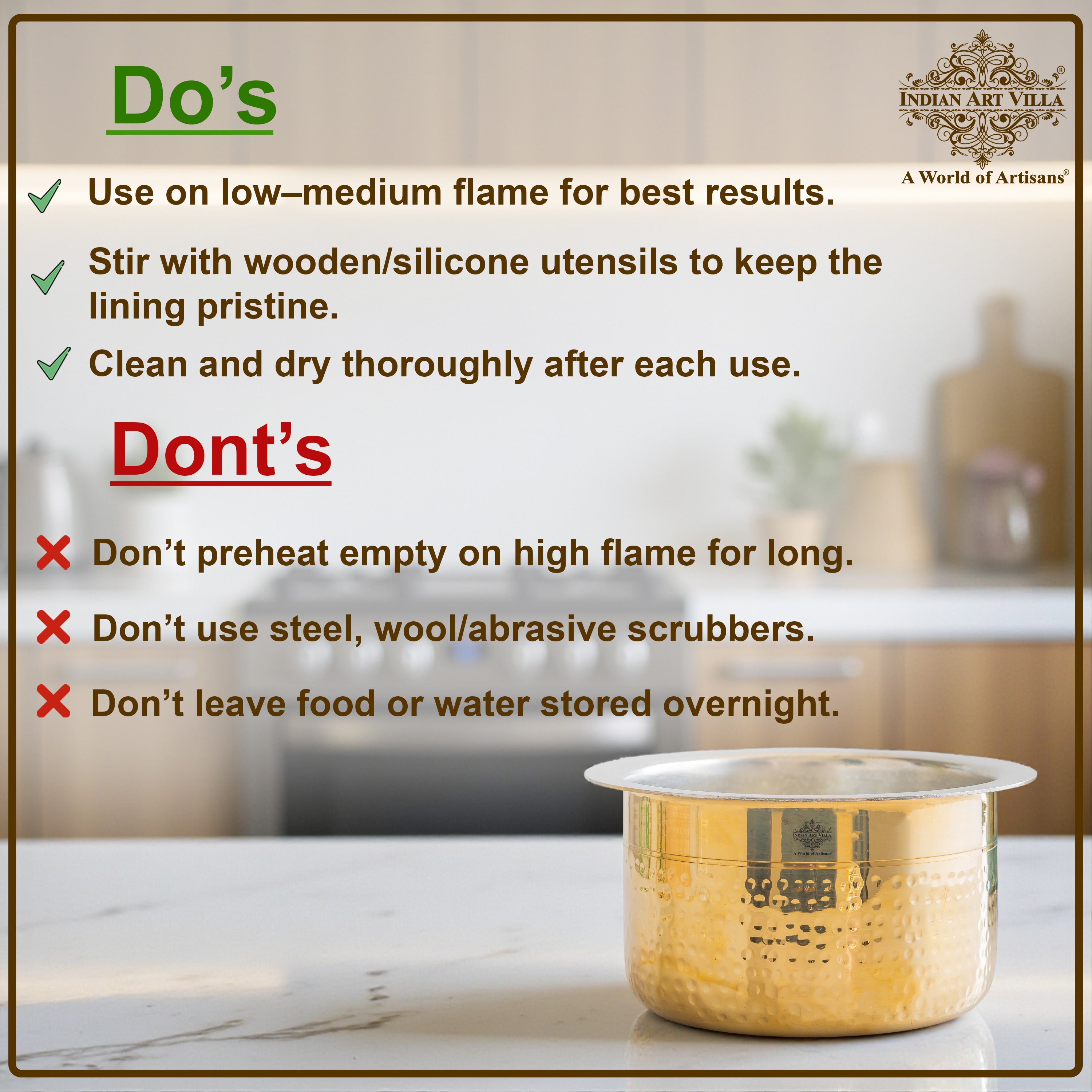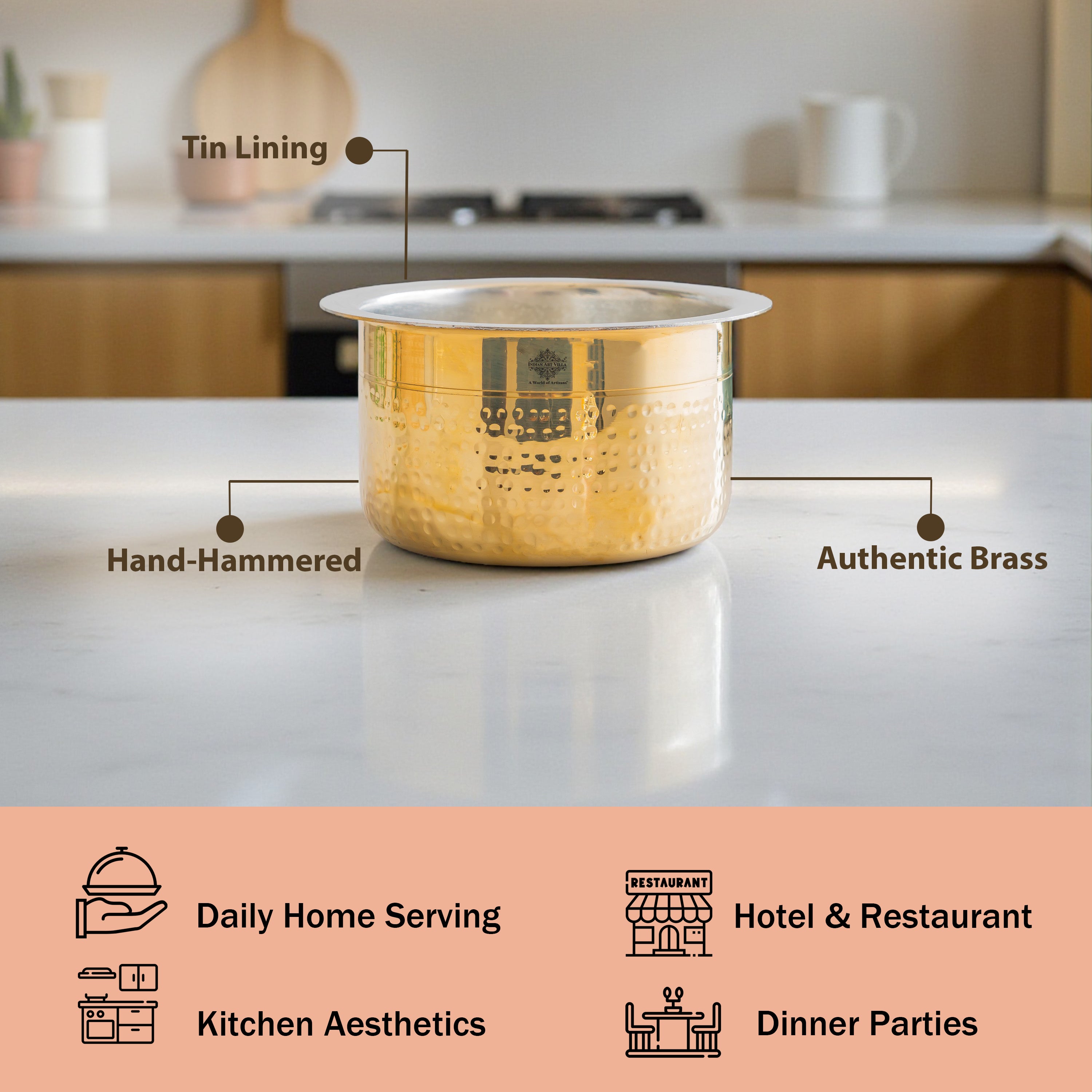 Benefits : Brass has antimicrobial properties, and the tin lining ensures food safety by preventing reactions between brass and acidic foods. Brass is highly durable and long-lasting kitchenware solution. Made from sustainable materials, it is an environmentally friendly alternative to plastic or other synthetic containers.