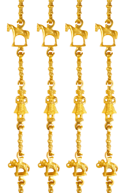 Brass Swing Jhula Chain with the captivating design of Horse, Men Guard, and Elephant embodies the essence of traditional Indian craftsmanship and cultural symbolism. Crafted meticulously from premium brass, each swing chain is a testament to the skilled artisans who have infused their expertise into every detail. At its core, this swing chain showcases three iconic motifs: the majestic Horse, the vigilant Men Guard, and the wise Elephant, each carrying profound significance in Indian culture and mythology. The Horse symbolizes power, freedom, and elegance, evoking a sense of grace and strength. The Men Guard stands as a symbol of protection, valor, and duty, embodying the noble qualities of guardianship and bravery. Meanwhile, the Elephant, revered for its wisdom, prosperity, and benevolence, adds a regal touch to the design, symbolizing stability, intellect, and good fortune. Indian Art Villa