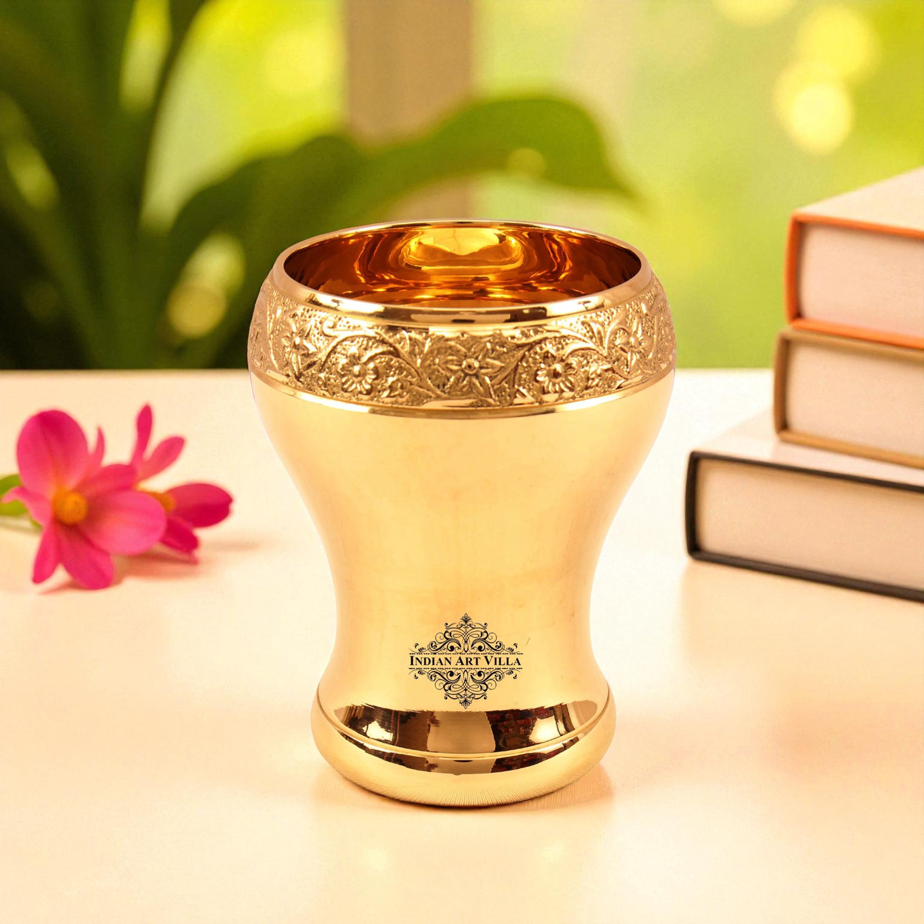 Indian Art Villa Pure Brass Designer Glass, a magnificent piece of craftsmanship that seamlessly blends functionality with aesthetic appeal. This exquisite glass is perfect for serving and drinking water, elevating your dining experience to new heights. Made from high-quality brass, this designer glass showcases intricate detailing and a captivating design that adds an element of elegance to any table setting. The golden hue of the brass radiates warmth, creating a luxurious ambiance. With its sturdy construction, this glass is built to withstand daily use and is easy to clean. Its generous capacity ensures that you can enjoy a refreshing drink without the need for constant refills. Whether you're hosting a formal gathering or simply enjoying a quiet moment at home, the Indian Art Villa Pure Brass Designer Glass is a timeless addition to your drinkware collection. Indulge in the beauty of traditional Indian artistry while savoring your favorite beverages in style.