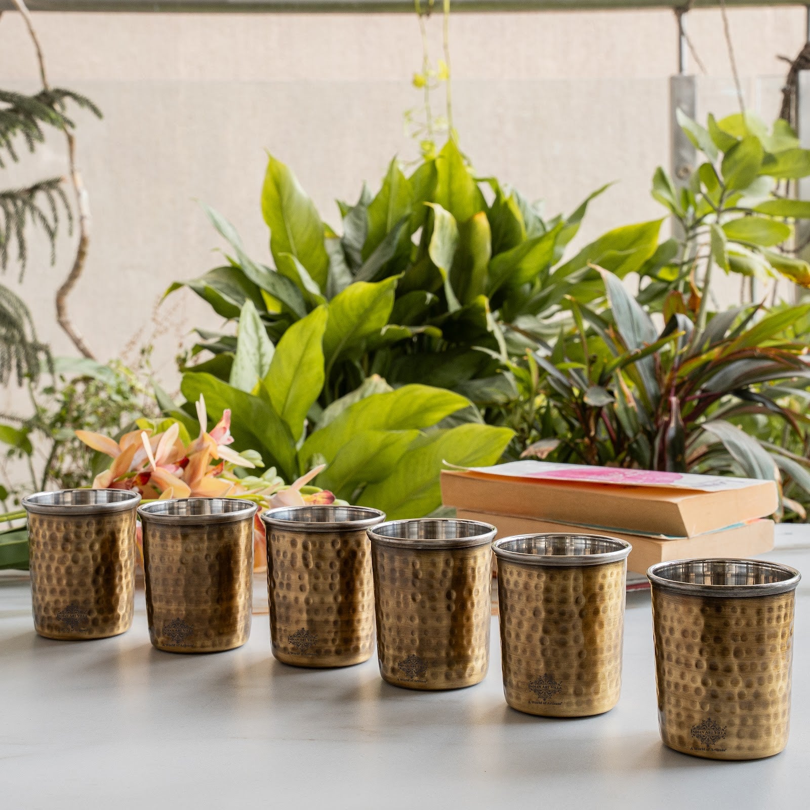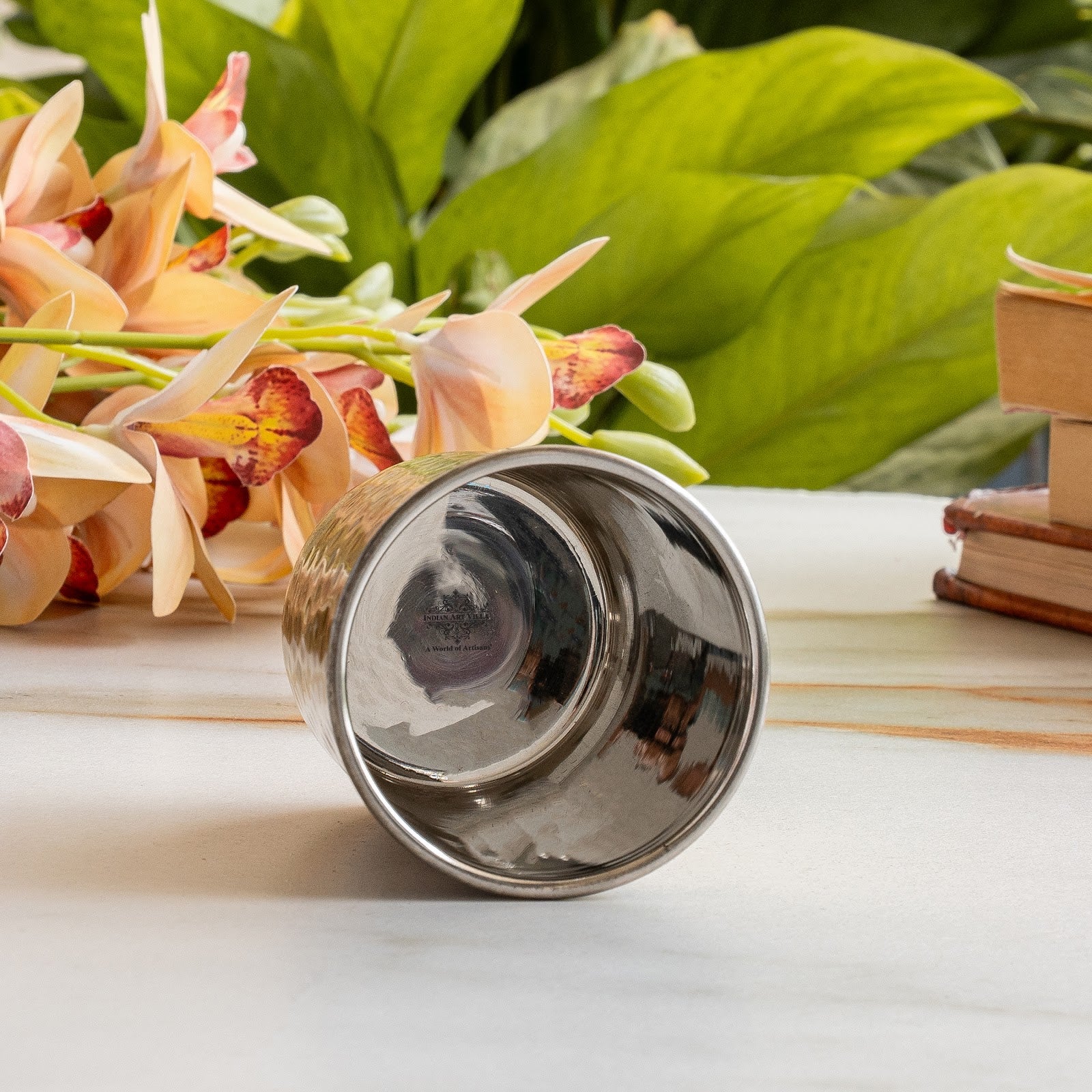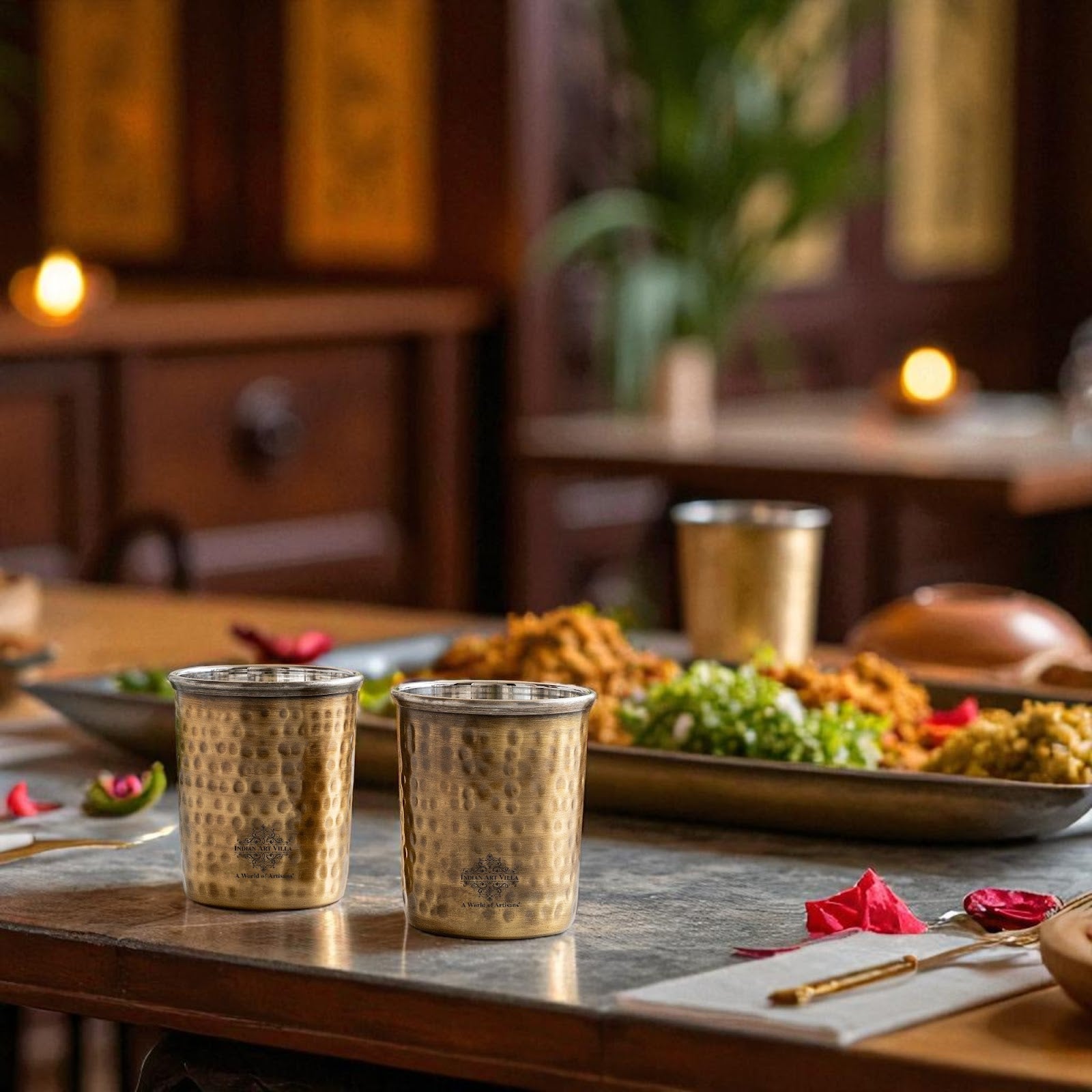 • Indian Art Villa Brass Steel Glass Tumbler. Make your home more lively and cheerful with this brilliant decor piece. Designed to accentuate the beauty and ambiance it brings soothing vibes to your abode and raises its contemporary look manifolds.