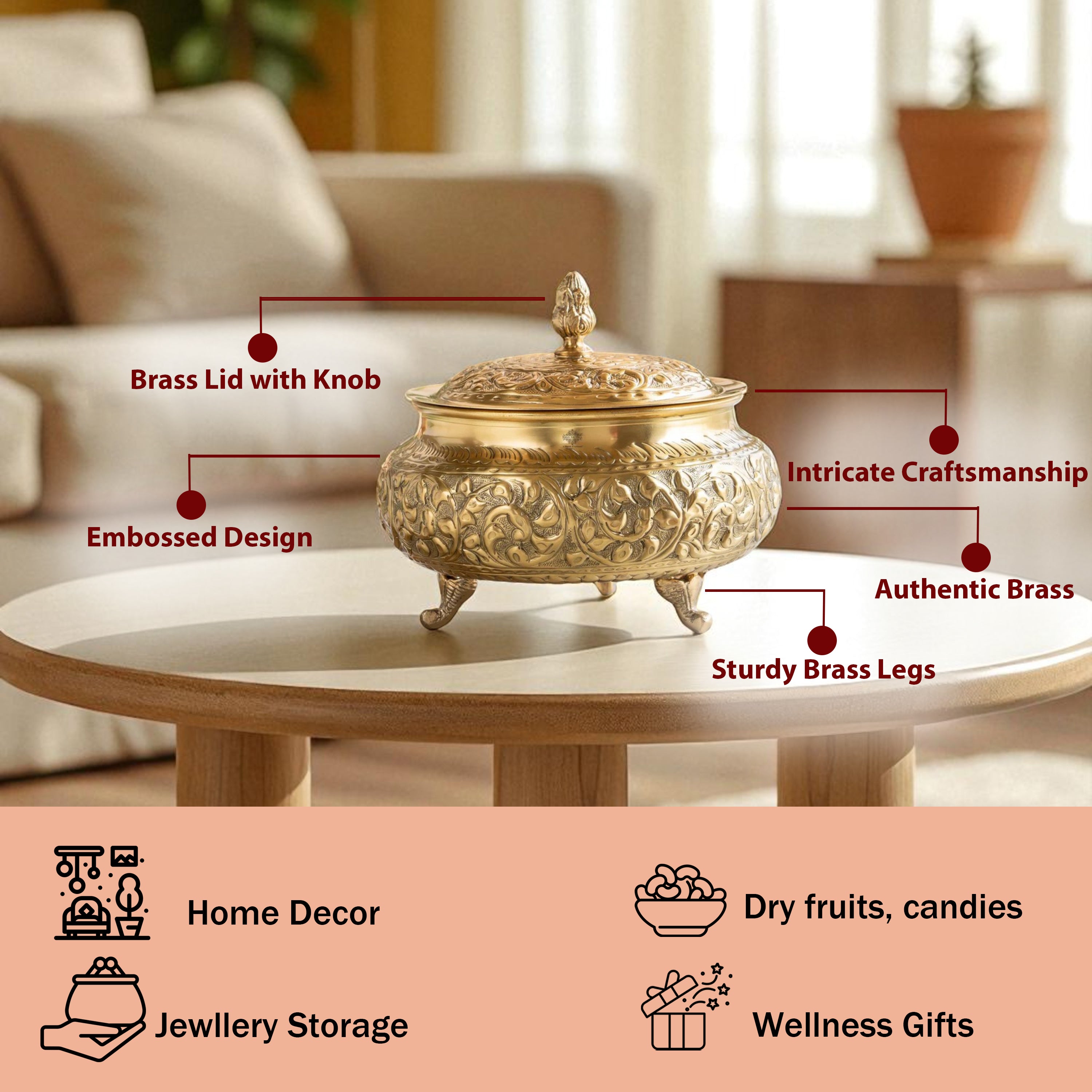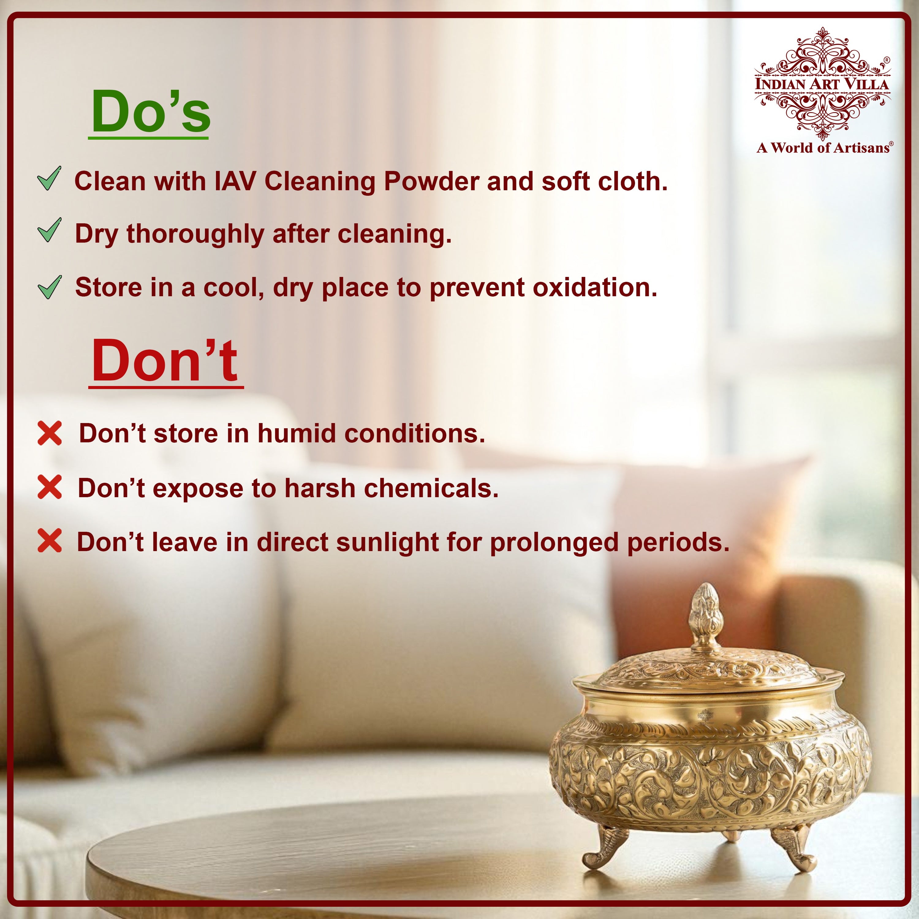 This Pure Brass Design Handi with an elegant embossed design is a stunning addition to your home decor or dinner table. Handcrafted with the finest brass, it features a beautifully detailed embossed floral pattern that brings a traditional and luxurious touch to any setting. The handi comes with a well-fitted lid to keep the contents secure, making it ideal for serving food or storing items. Available in two sizes—800 ml for smaller servings and 2000 ml for larger portions—this versatile handi can be used for cooking, serving, or as a gift for special occasions. Whether you’re hosting a traditional gathering or looking for an exquisite gift, this brass handi is the perfect choice for both functionality and elegance.