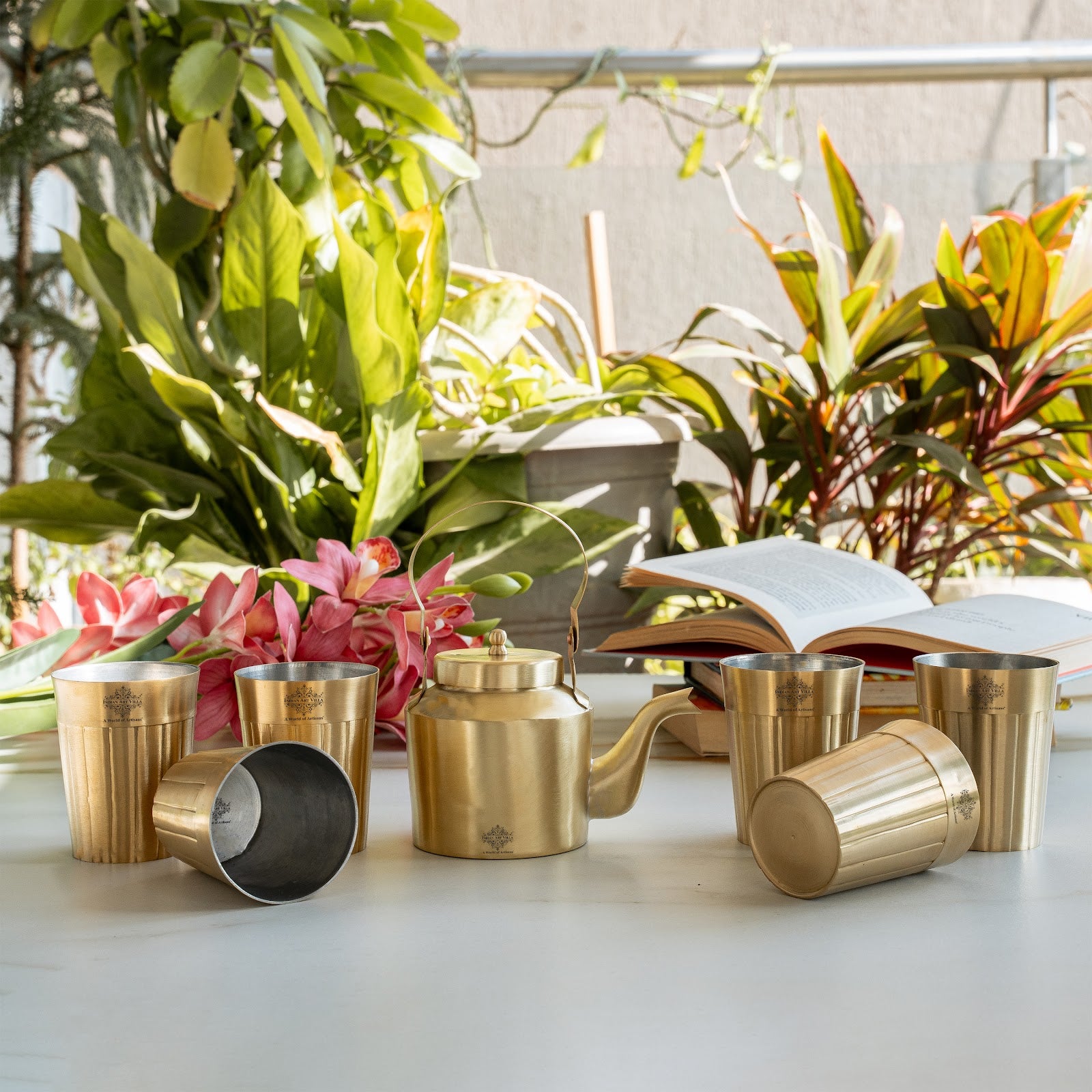 - These Pure Brass Tea Kettle with glass also have Trendy looks for better ergonomics. You can add Royal Vintage Look to your Kitchen & Dining by using these Set as your Drinkware/Serveware Purpose.