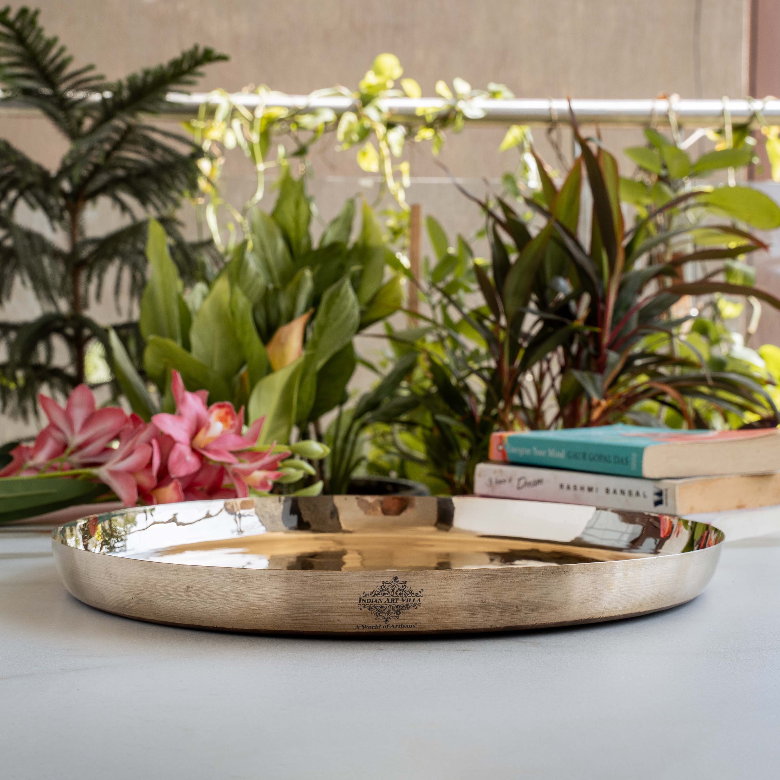 Bring home the essence of Indian tradition and wellness with the Indian Art Villa Pure Bronze Plate (Kansa Thali) — an elegant piece of handcrafted metal serveware designed for both everyday dining and festive occasions. Each plate is skillfully made by Indian artisans using pure bronze, an alloy of copper and tin, known in Ayurveda for its digestive and healing properties.