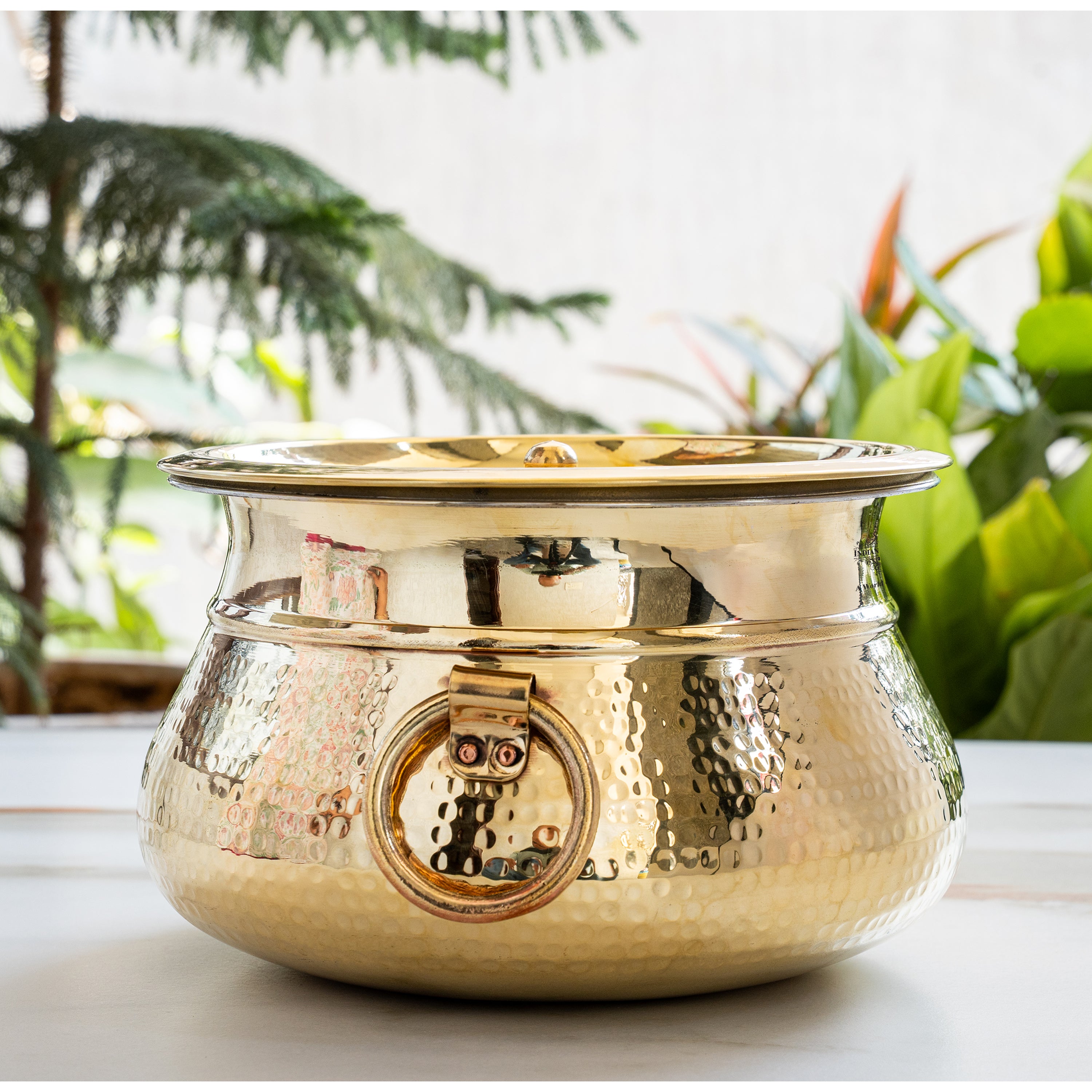 The Brass Hammered Lagan Handi by Indian Art Villa is a timeless piece of cookware, designed for both functionality and style. The hammered brass finish not only gives it an appealing vintage look but also ensures excellent heat retention, making it perfect for slow cooking. The tin lining inside the pot adds an extra layer of protection, preventing any reactions between the brass and your food. The handles are securely attached, providing a safe grip while moving the pot around. The included lid ensures that your food stays warm and flavorful for longer periods. Available in three different sizes – 3400ml, 4500ml, and 6500ml – this Lagan Handi can meet the needs of both small and large gatherings. With Indian Art Villa’s signature craftsmanship, this cookware adds elegance and tradition to your kitchen.