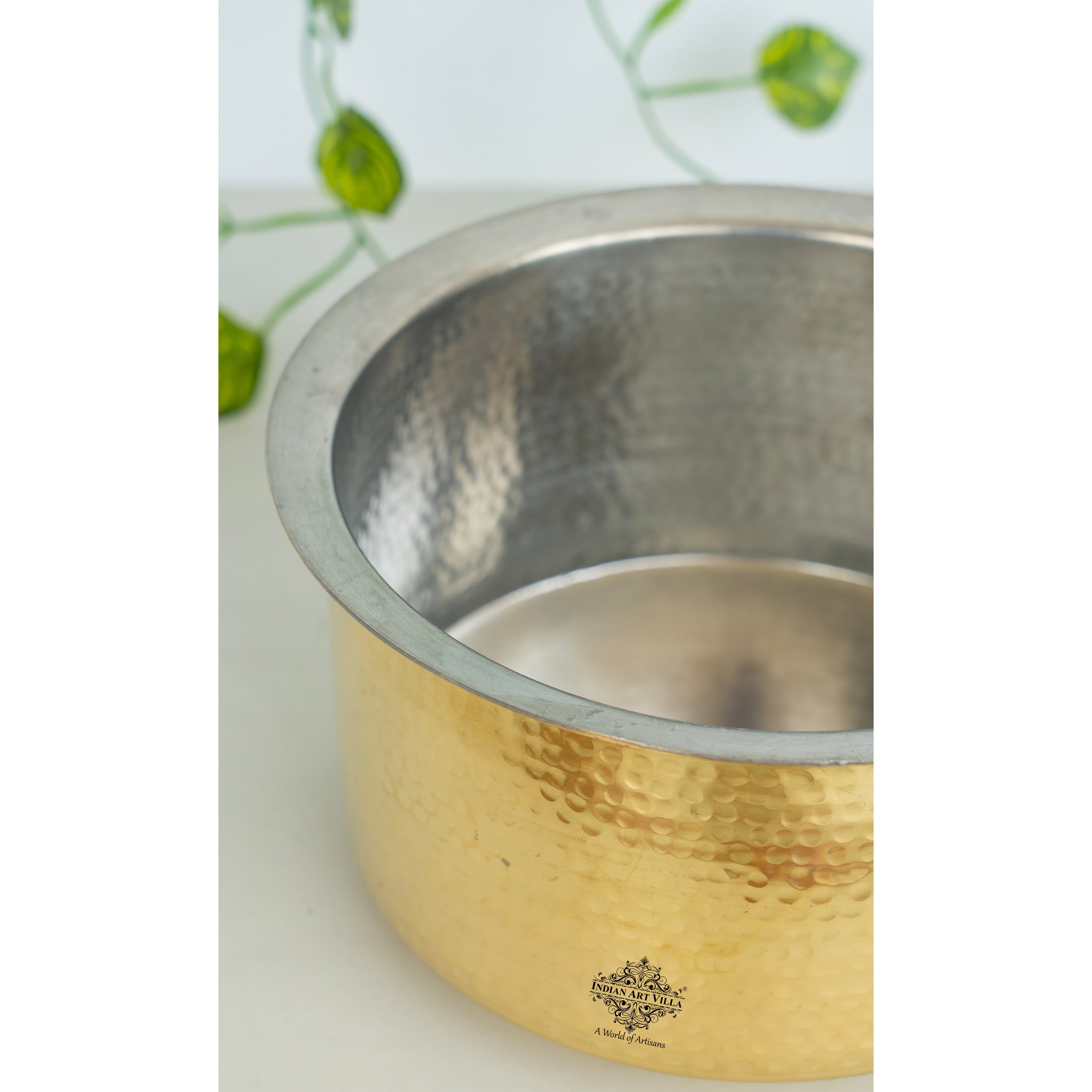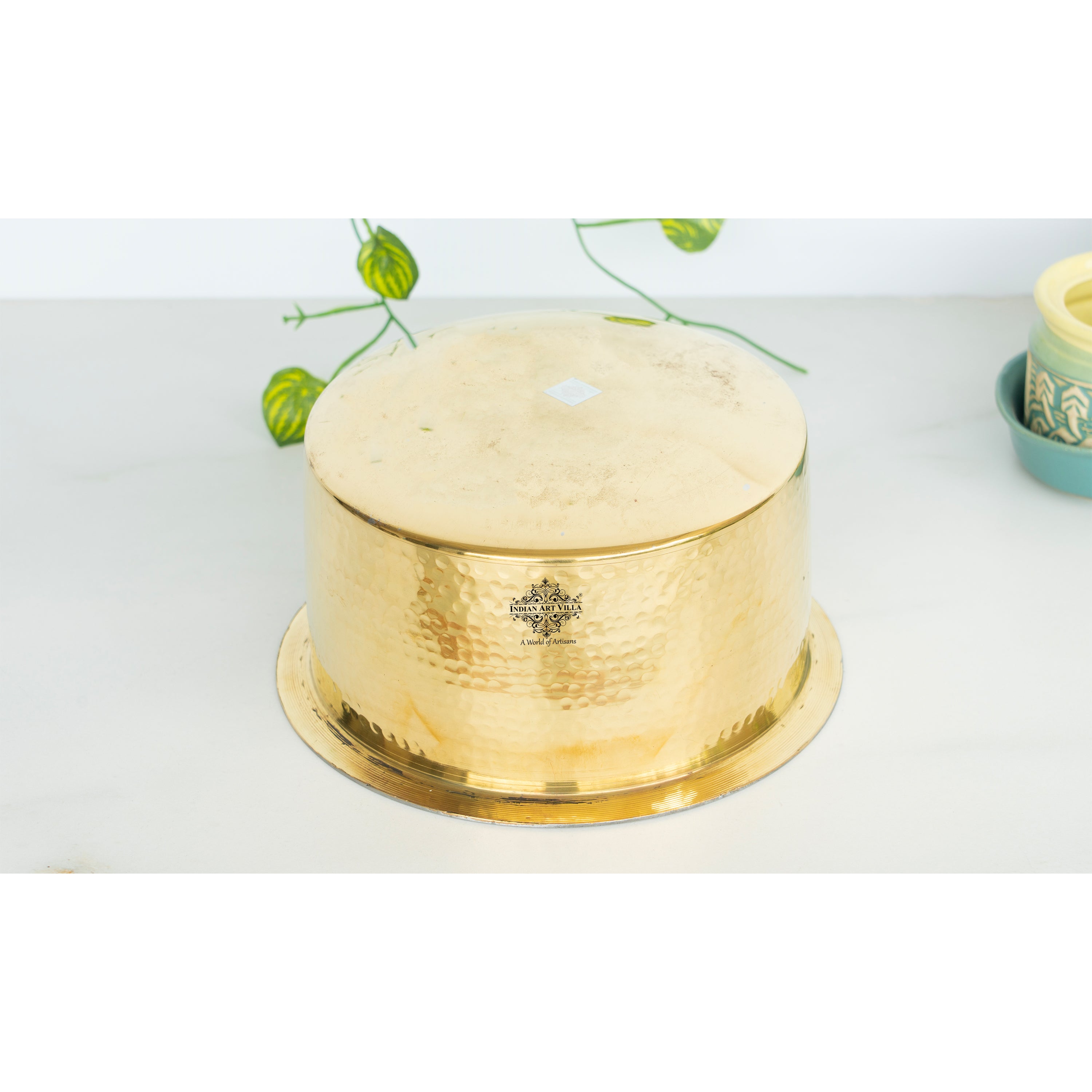Indian Art Villa Pure Brass Bhagona/Patila with Lid, a perfect blend of traditional craftsmanship and modern functionality. This exquisite cookware is crafted from 100% pure brass, ensuring exceptional durability and longevity. The elegant hammered design adds a touch of sophistication, making it an attractive addition to any kitchen or dining table. The bhagona/patila features an inside tin lining, which prevents direct contact of food with brass, ensuring safe and healthy cooking. This lining helps retain the natural taste and nutritional value of your food, making every meal a delightful experience. The generous size is ideal for preparing a variety of dishes, from rich curries and hearty soups to flavorful stews. Included with the bhagona/patila is a matching lid that helps retain heat and moisture, ensuring your dishes stay warm and delicious for longer periods. Each piece is meticulously handcrafted by skilled artisans, ensuring superior quality and unique craftsmanship. brass naturally tarnishes over time but can be easily cleaned with lemon and salt to restore its original shine. This cookware is not only functional but also eco-friendly, made from recyclable materials, promoting a sustainable lifestyle. Perfect for everyday use and special occasions, the IndianArtVilla Pure Brass Bhagona/Patila with Lid is a must-have for anyone who values tradition, quality, and style in their kitchen.