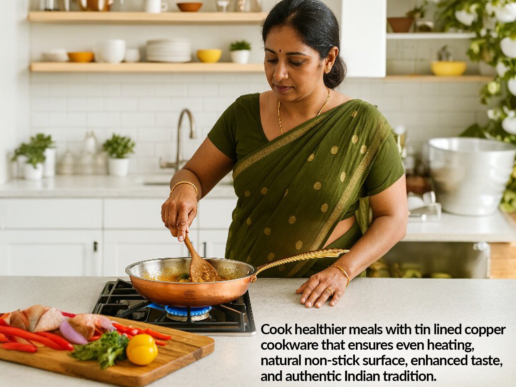 Traditional Tin Lining Inside – Food-safe tin (Kalai) coating ensures your food doesn't react with copper while retaining the classic flavor and nutrients of Indian cuisine.