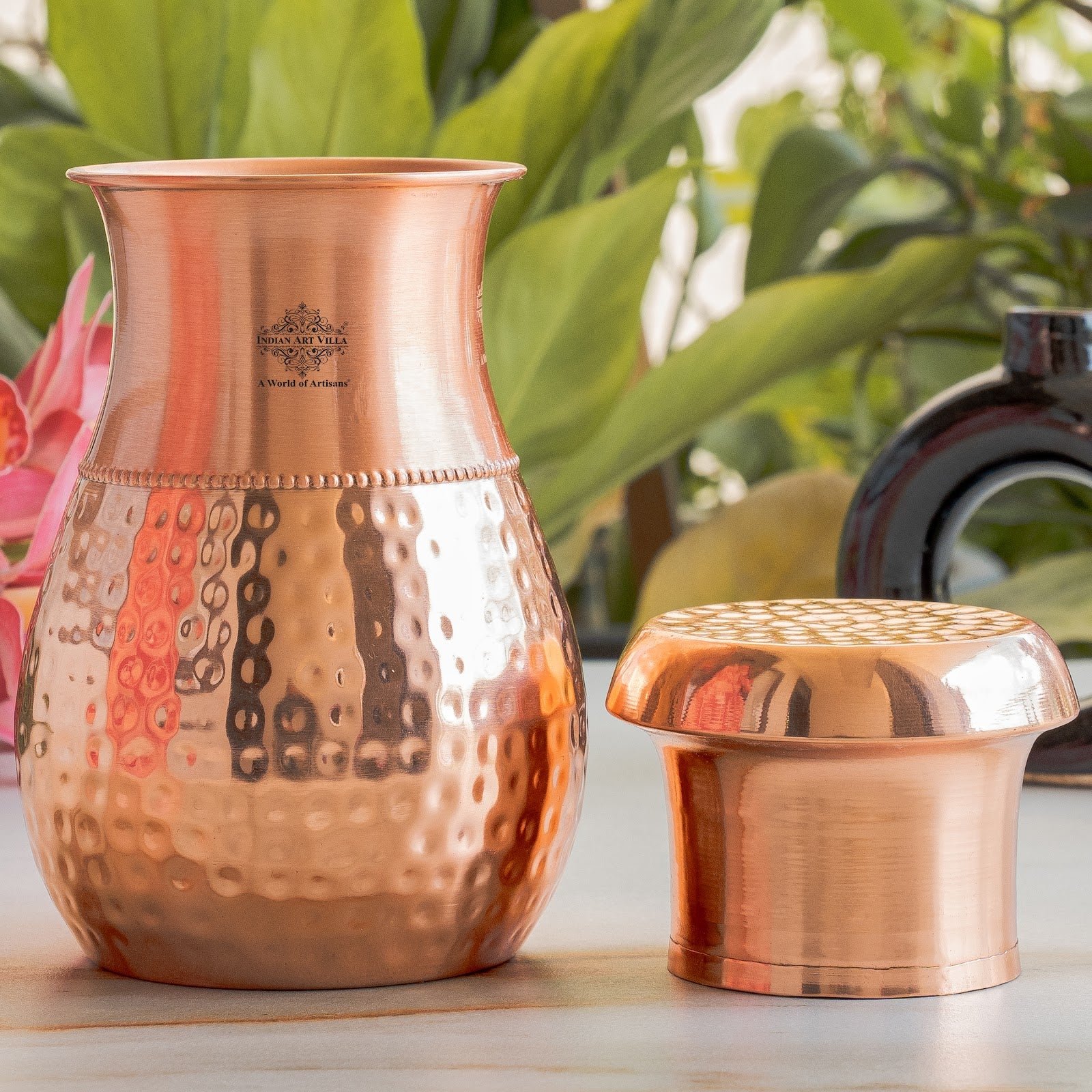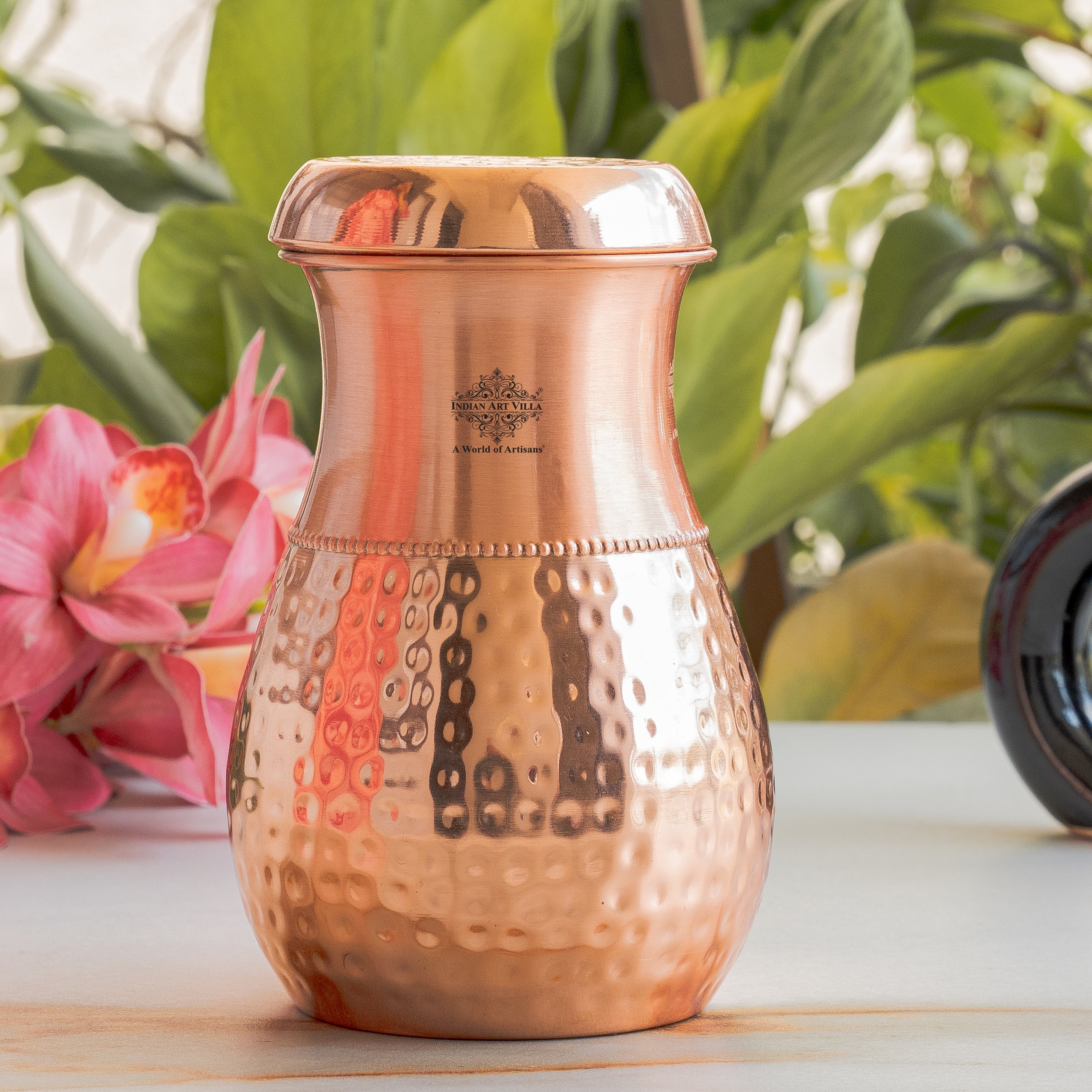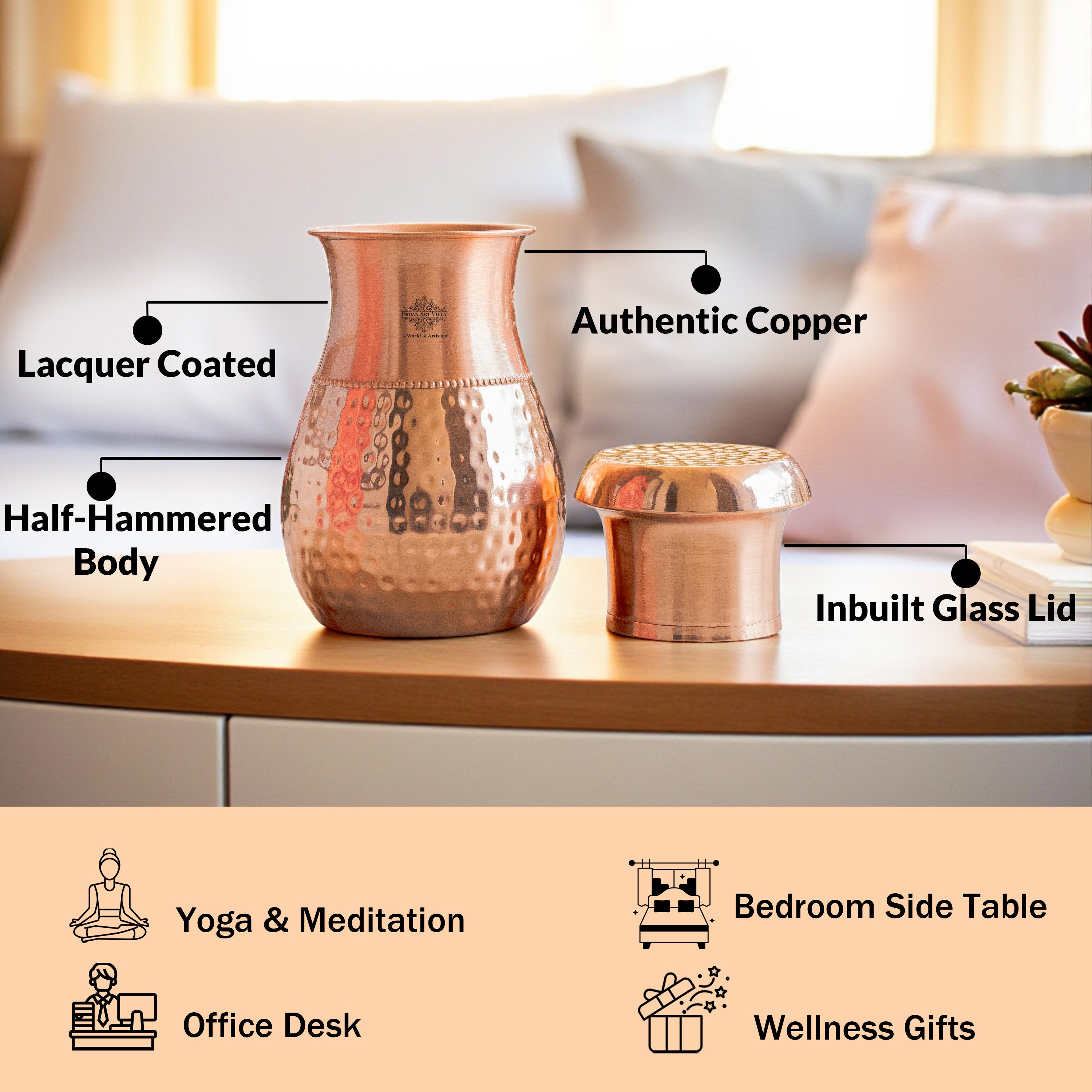 Pure Copper Bedroom Water Bottle with Inbuilt Glass-750 ML