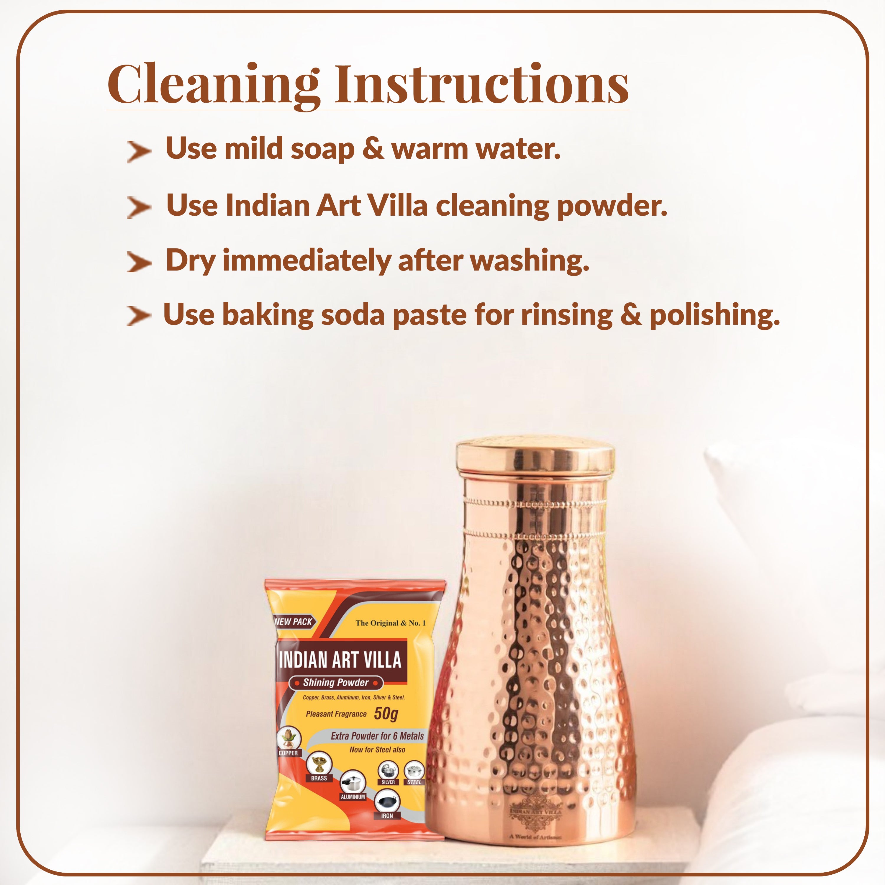 Every product comes with Indian Art Villa’s sample cleaning powder and a How-to-Use & Care Instruction Booklet, ensuring long-lasting shine and proper maintenance.