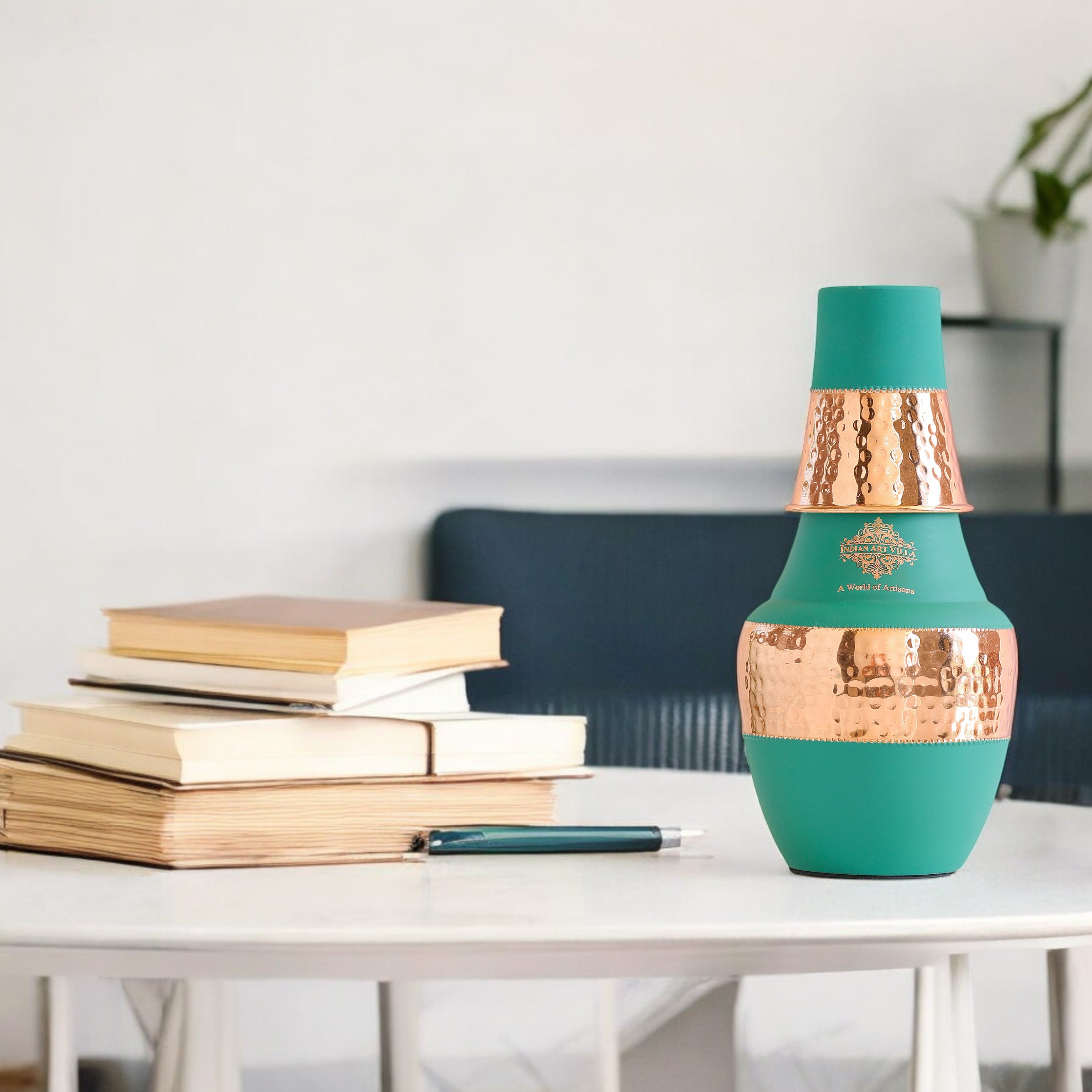 Add elegance and wellness to your daily routine with the Indian Art Villa Pure Copper Hammered Silk Finish Surahi Shape Bedroom Bottle – 1250 ML. Designed in a classic surahi silhouette with a modern matte-silk exterior, this bottle combines traditional copper craftsmanship with a stylish contemporary look.