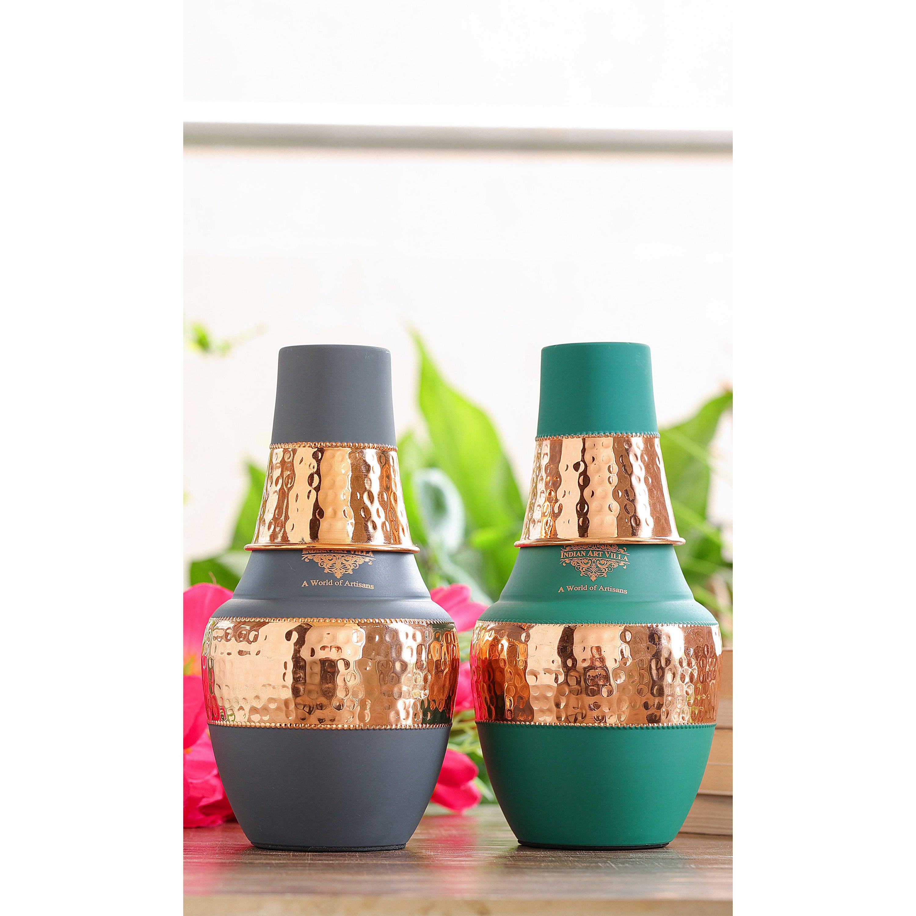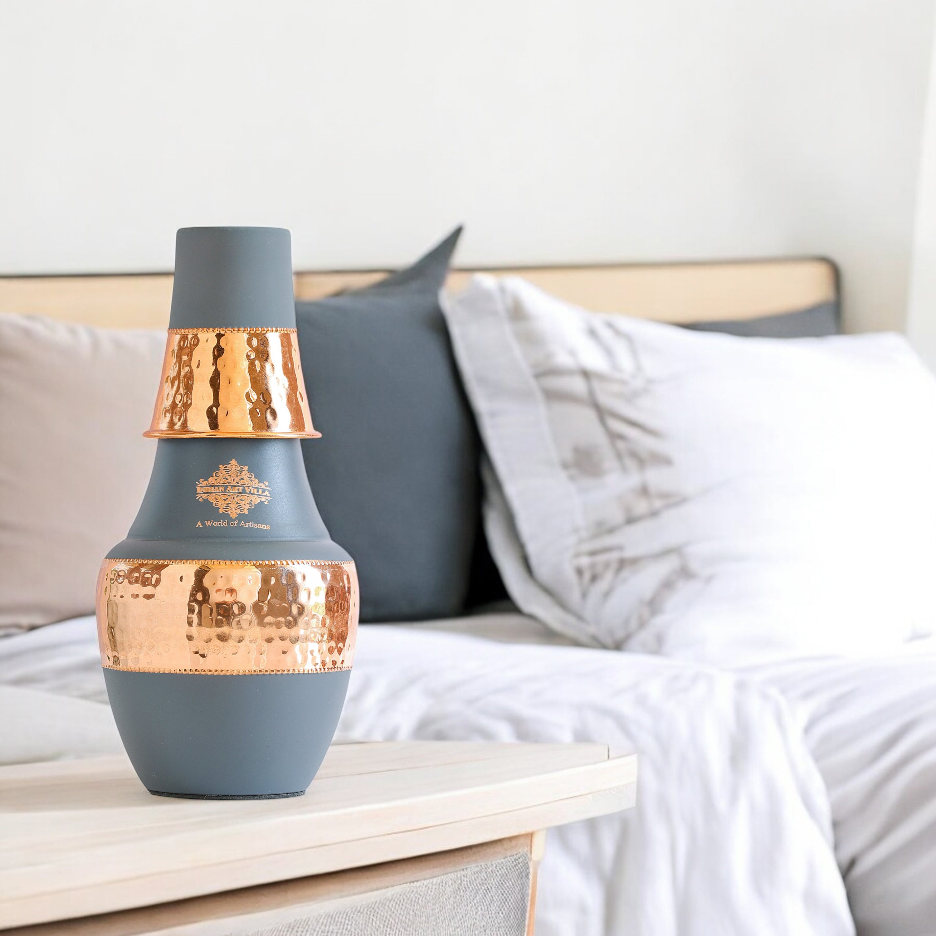 Handcrafted from 99.99% pure copper, it features a hammered copper band detailing that enhances both beauty and durability. The matte silk coating gives the bottle a smooth premium feel, available in three beautiful colors – Grey, Green, and Gold. Perfect for bedside hydration, this bottle helps promote the Ayurvedic benefits of drinking copper-charged water, known to support better digestion, immunity, and overall well-being.