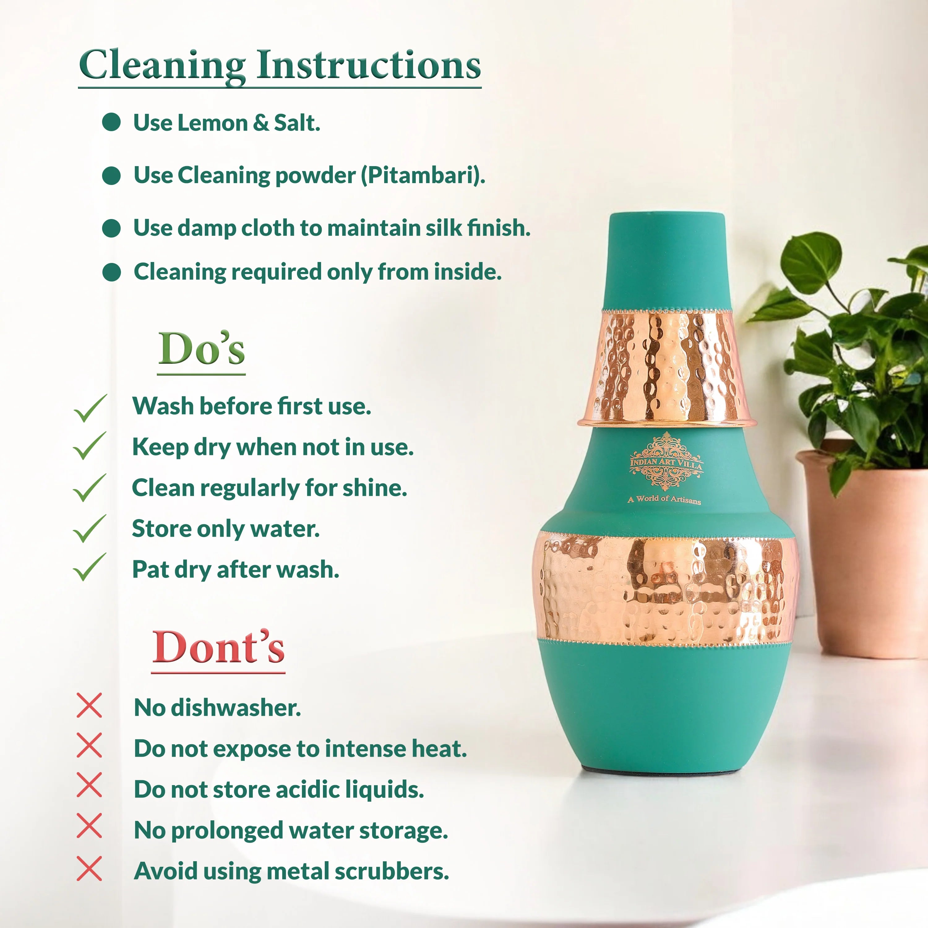 Each bottle comes with Indian Art Villa’s cleaning powder and a How-to-Use & Care Instruction Booklet, ensuring easy maintenance and long-lasting shine.