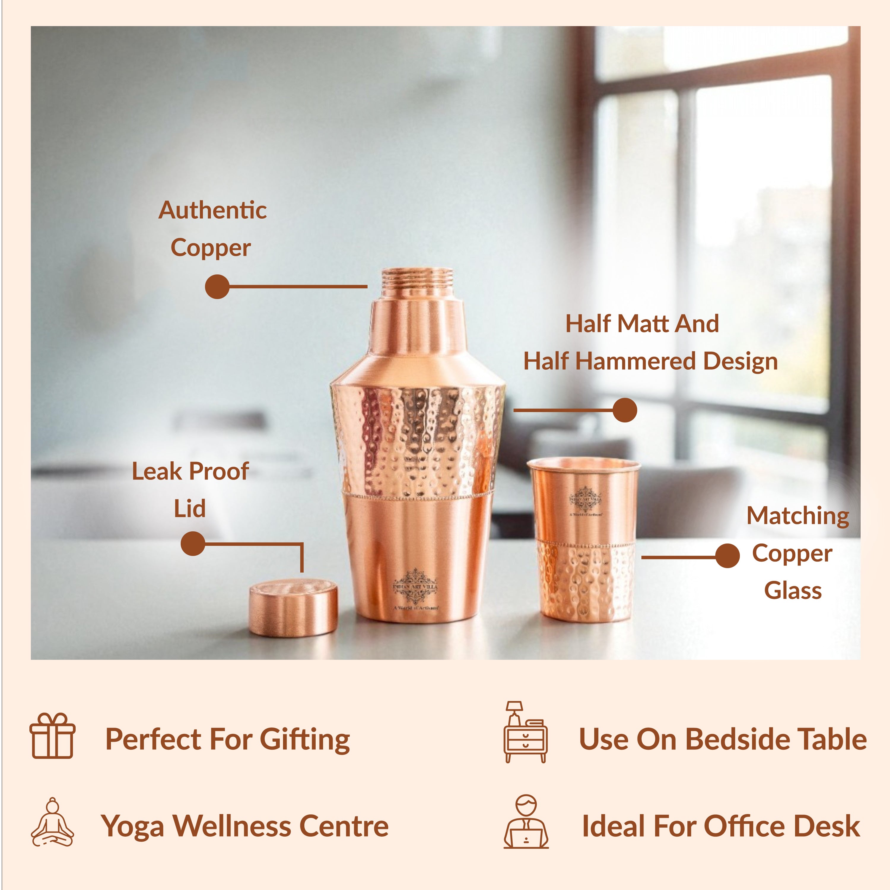 • Pure Copper Construction: Made from 100% high-grade copper ensuring durability and authentic Ayurvedic health benefits.
