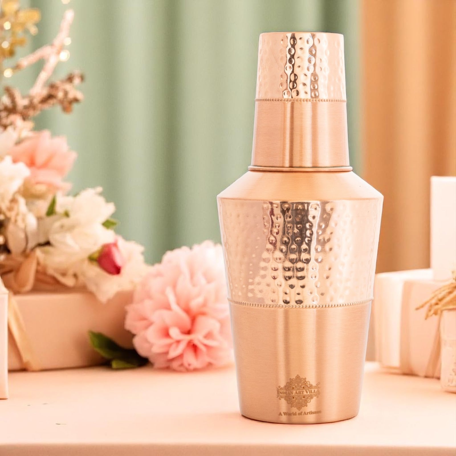 Elevate your wellness routine with the Indian Art Villa Copper Matt Hammered Jar with Glass. Crafted from 100% pure copper, this exquisite jar combines a sleek matt finish with a textured hammered design, offering a touch of luxury to your hydration experience. With a capacity of 1250 ML, it’s ideal for daily water storage, allowing you to enjoy the timeless benefits of Ayurvedic traditions. Copper, revered for its natural properties, helps in boosting immunity, enhancing digestion, and balancing pH levels. This set includes a matching copper glass, making it perfect for serving guests or enjoying a mindful hydration moment. The leak-proof cap ensures safe storage and convenient portability.