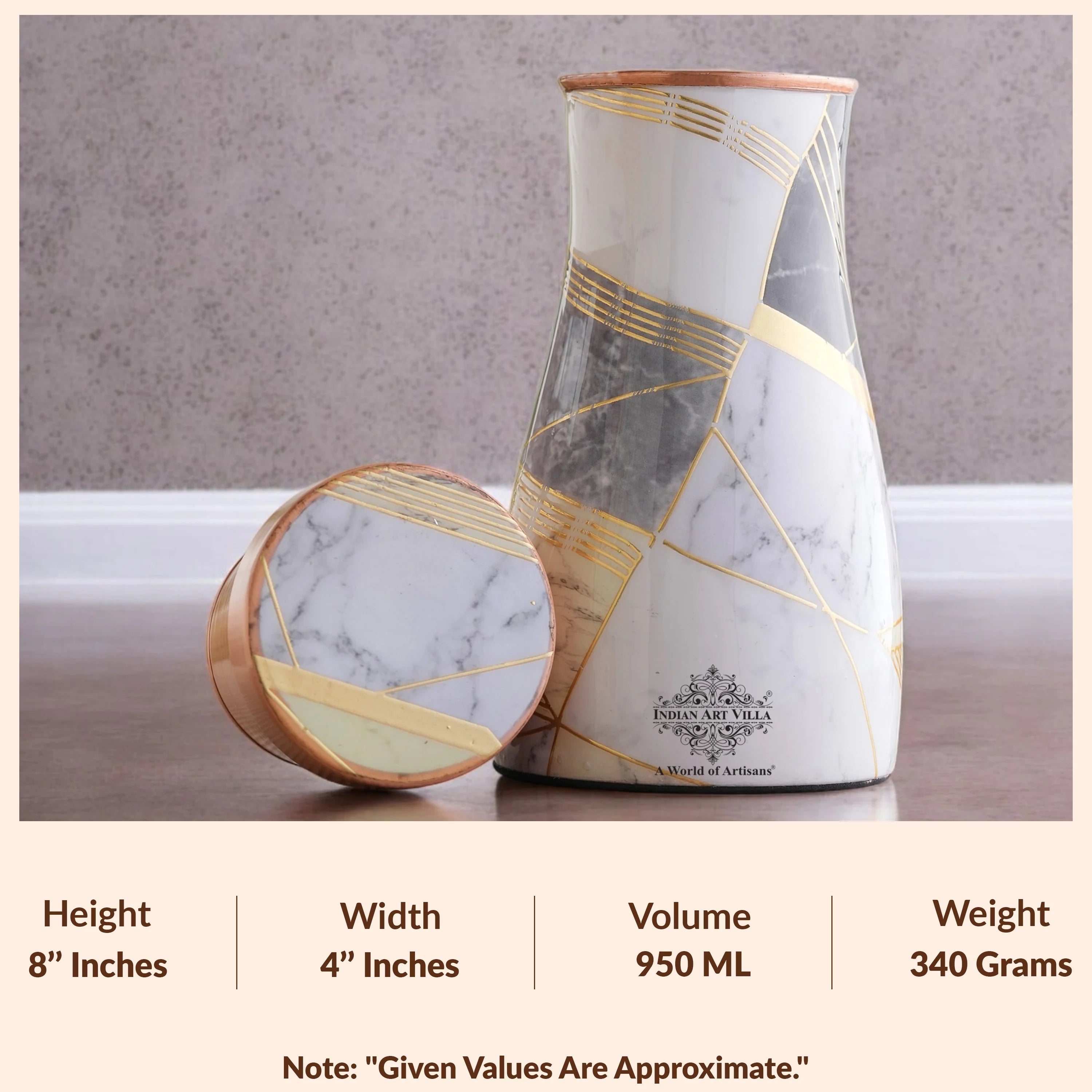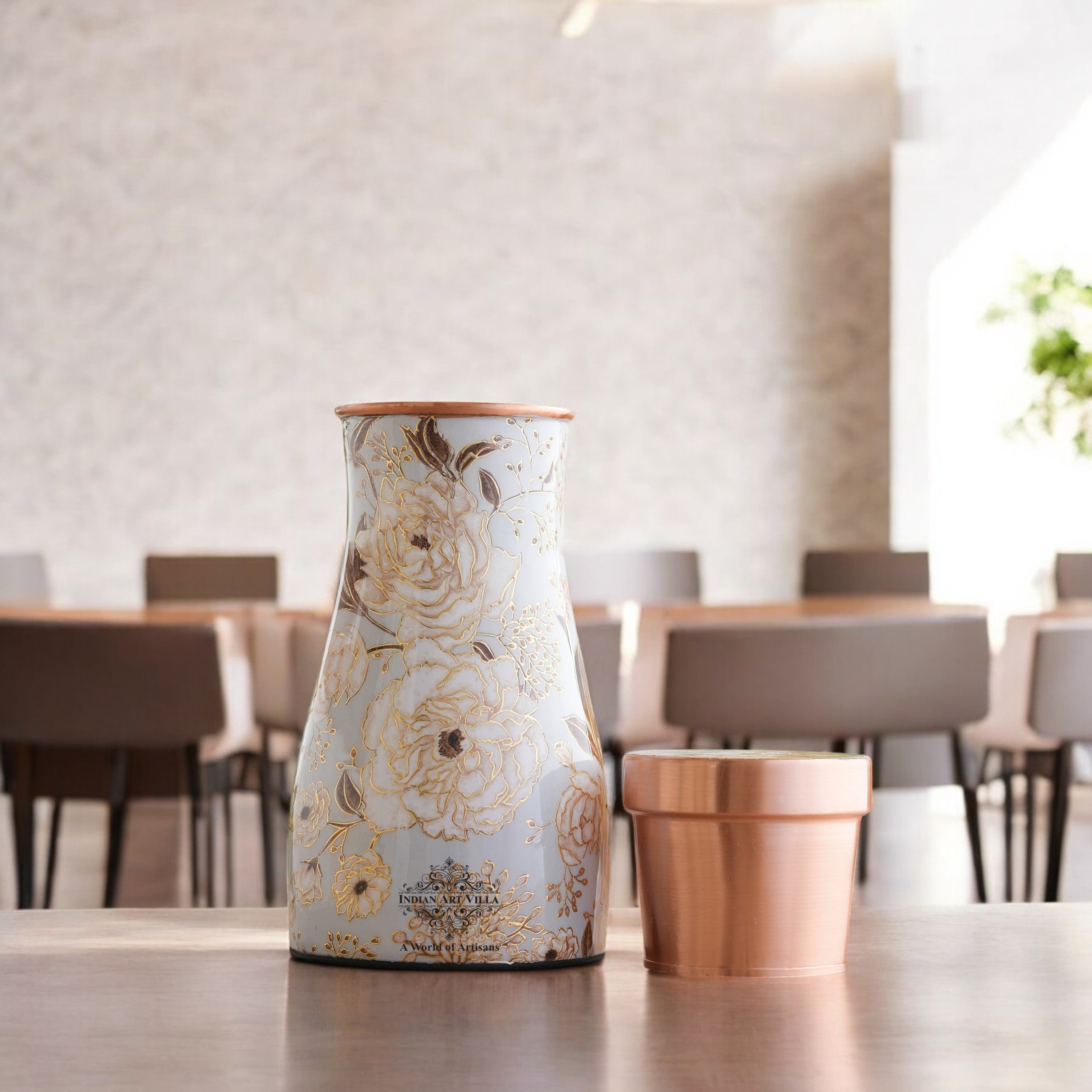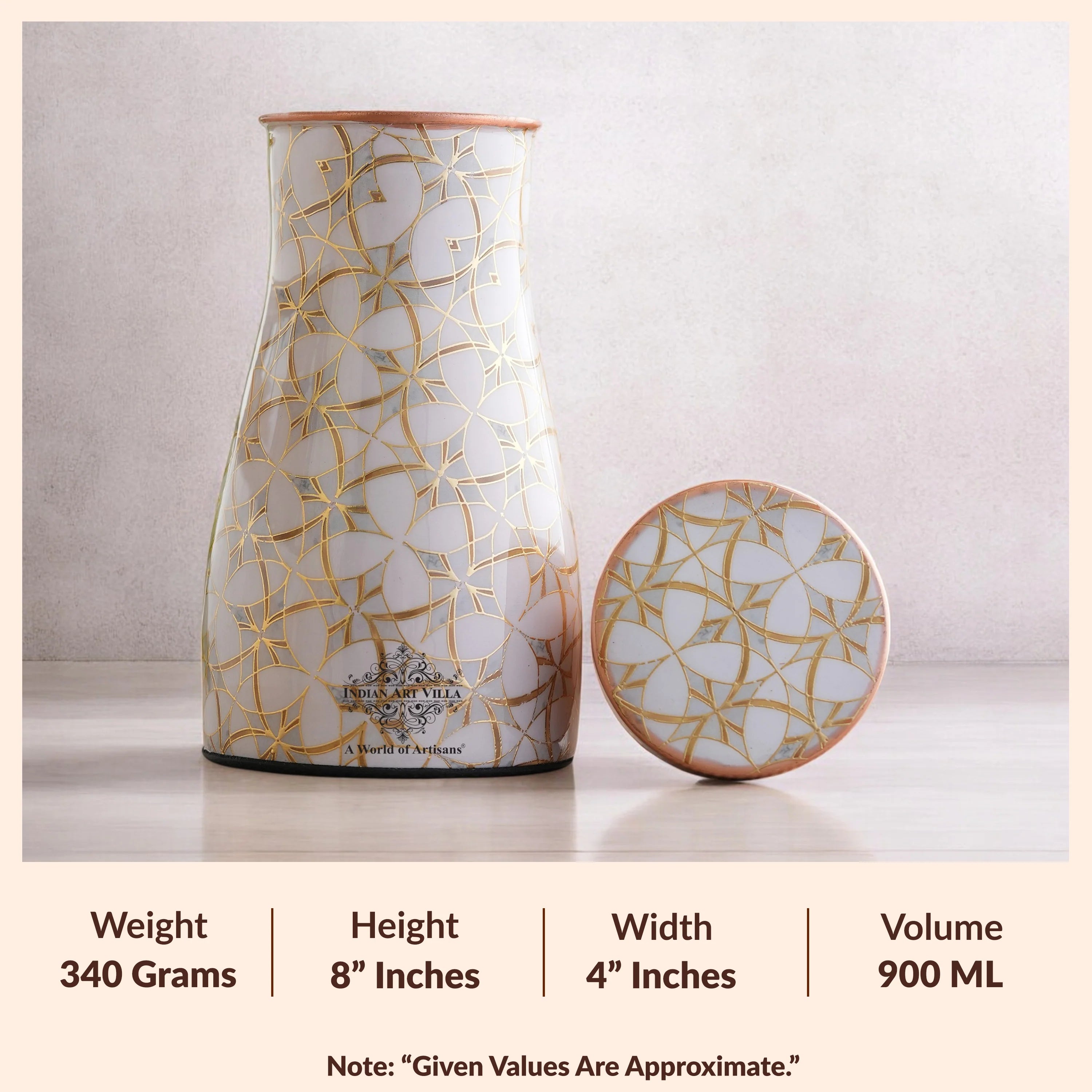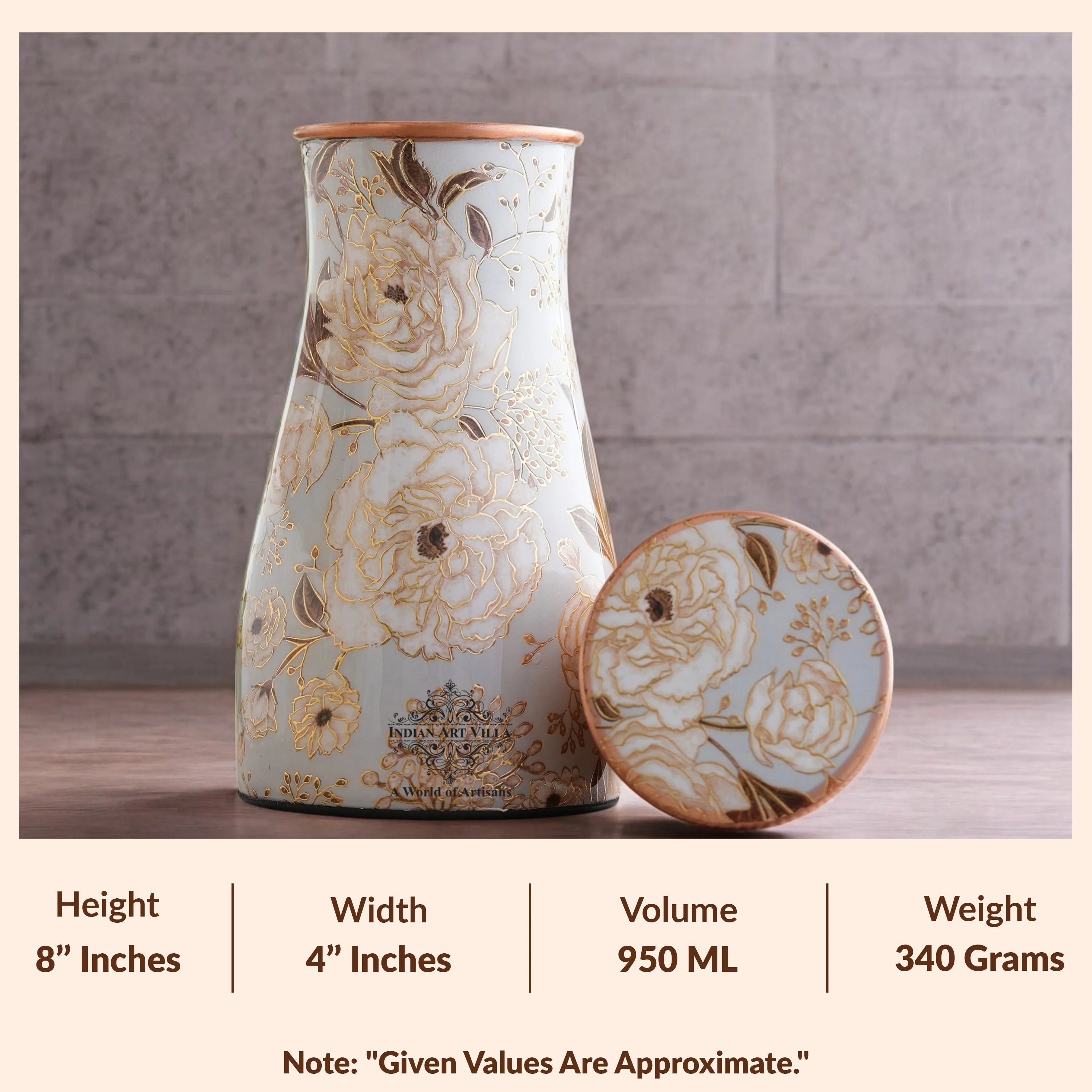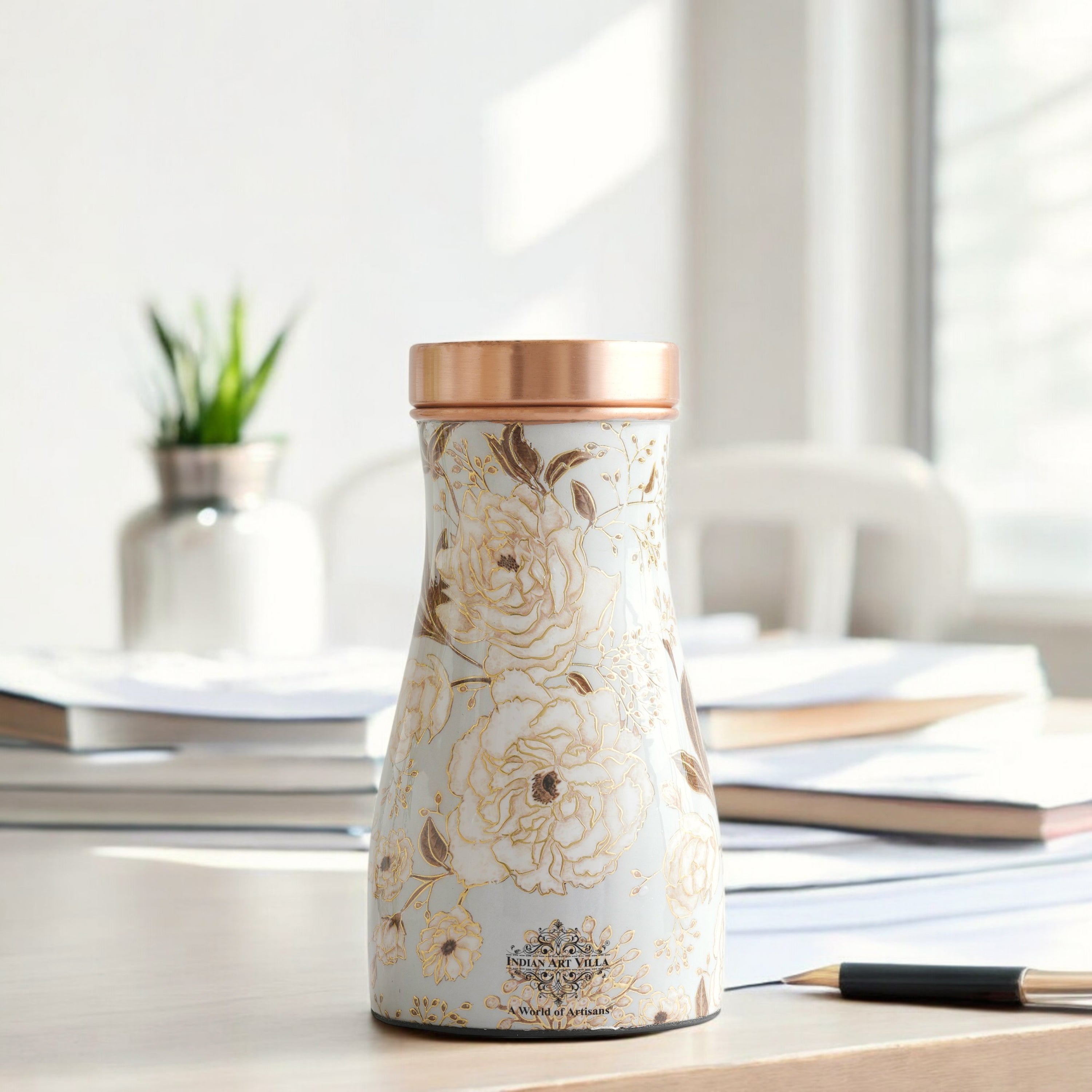 Indian Art Villa Handcrafted Pure Copper Gold Block Print Design Bedroom Bottle is a beautiful blend of traditional craftsmanship and modern utility. This exquisite bottle is crafted from 100% pure copper, known for its numerous health benefits and its prominent place in Ayurveda. The 850 ml capacity makes it the perfect companion for daily hydration, whether kept by your bedside, on your desk, or carried with you throughout the day. One of the standout features of this copper bottle is its stunning design. Handcrafted with meticulous attention to detail, it features a gold flower print that adds an element of elegance and sophistication to any space. The design not only enhances its aesthetic appeal but also reflects the rich cultural heritage of traditional Indian artistry, making it a unique piece of decor as well as a functional item. Drinking water from a copper vessel has long been recommended in Ayurveda for its health benefits. Copper is believed to purify water, aid digestion, boost immunity, and balance the body's doshas. This bottle makes it easy to incorporate these ancient wellness practices into your modern lifestyle. Indian Art Villa Pure Copper Bottle is not just a health-conscious choice but also an eco-friendly one, offering a sustainable alternative to plastic bottles.