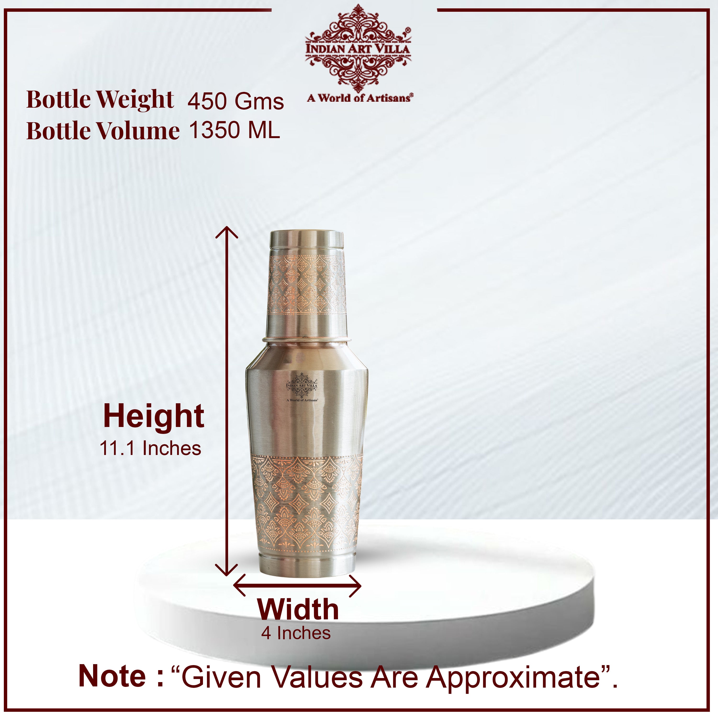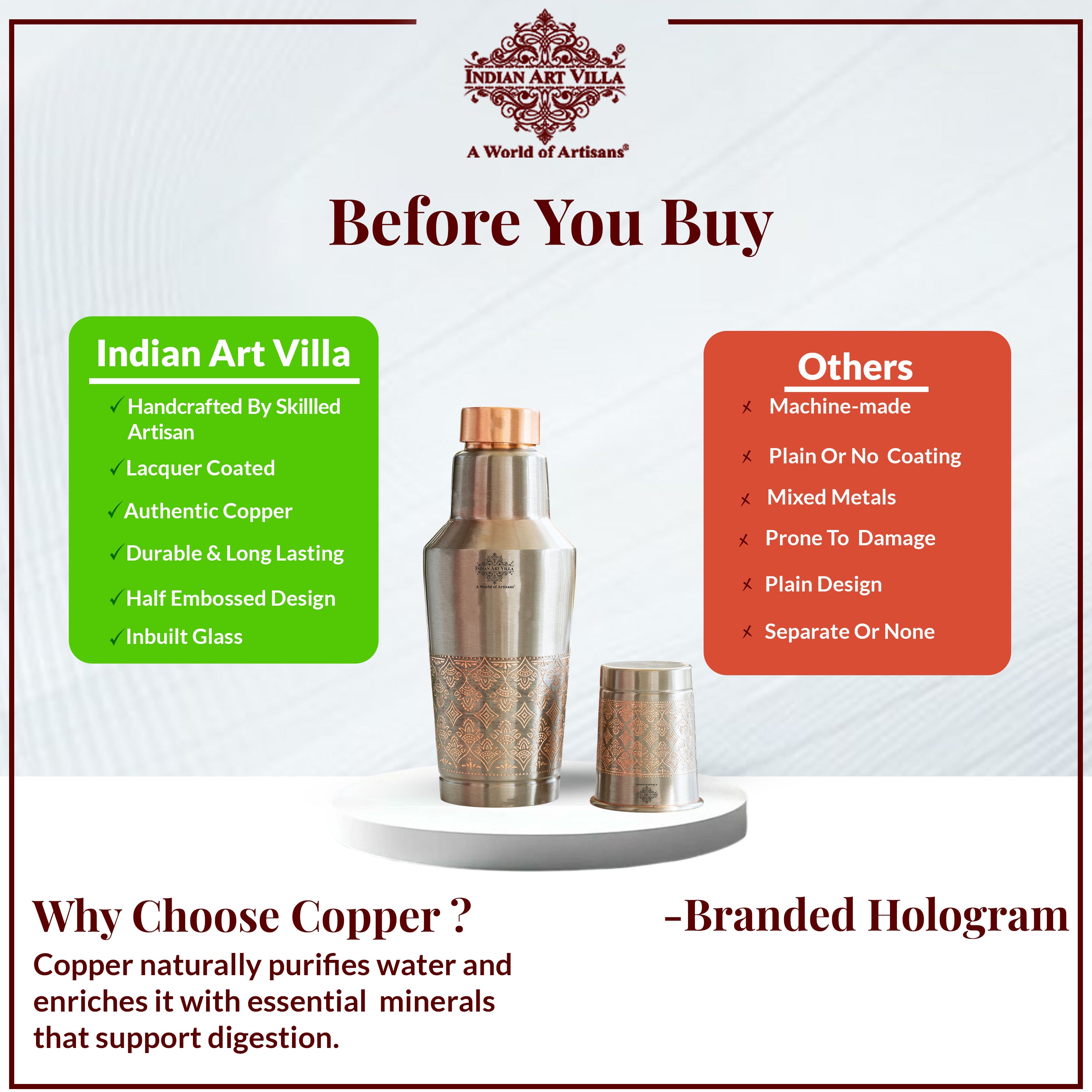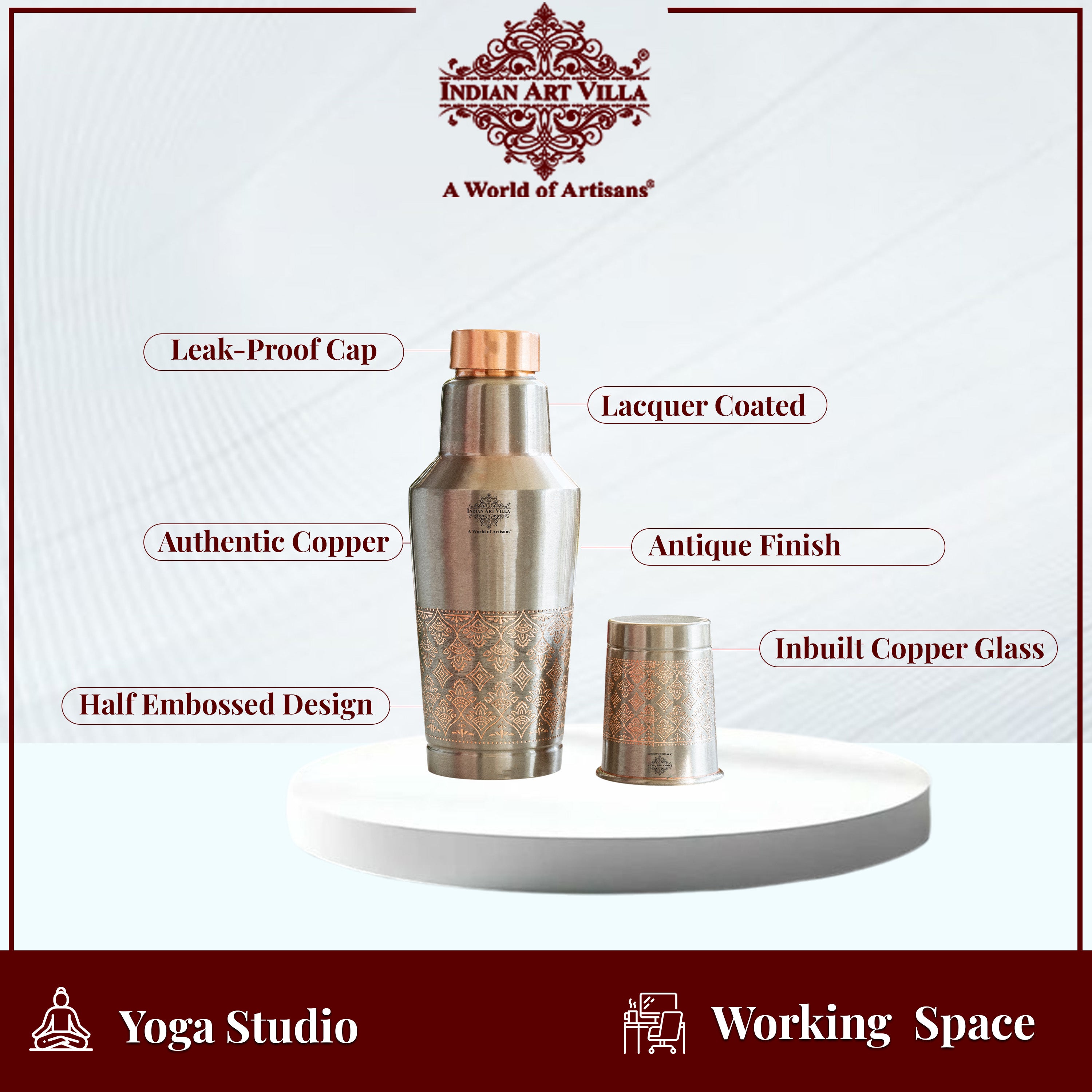 Antique Finish Half Embossed Copper Bottle with Inbullt Glass - 1350 ML