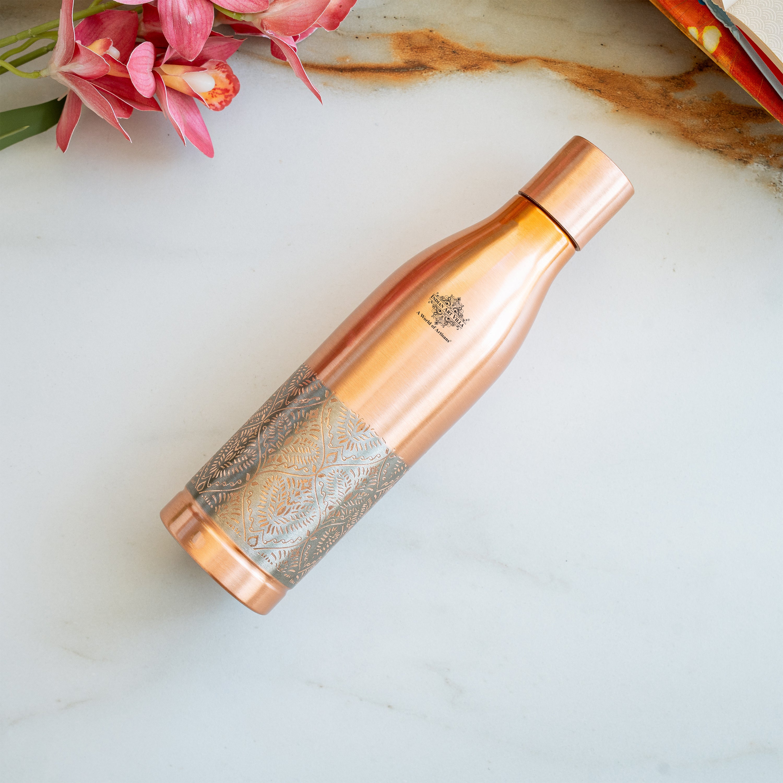 Bring home a touch of timeless elegance with the Indian Art Villa Pure Copper Hammered Water Bottle with Inbuilt Glass Lid with fully lacquer coating, a beautiful fusion of traditional Indian craftsmanship and modern functionality. Expertly handcrafted from 100% pure copper by skilled artisans of India, this bottle features a half-hammered and half-silk finish design that reflects both heritage and style. Its innovative lid can be used as a drinking glass, making it a perfect choice for bedroom, office, or travel use.