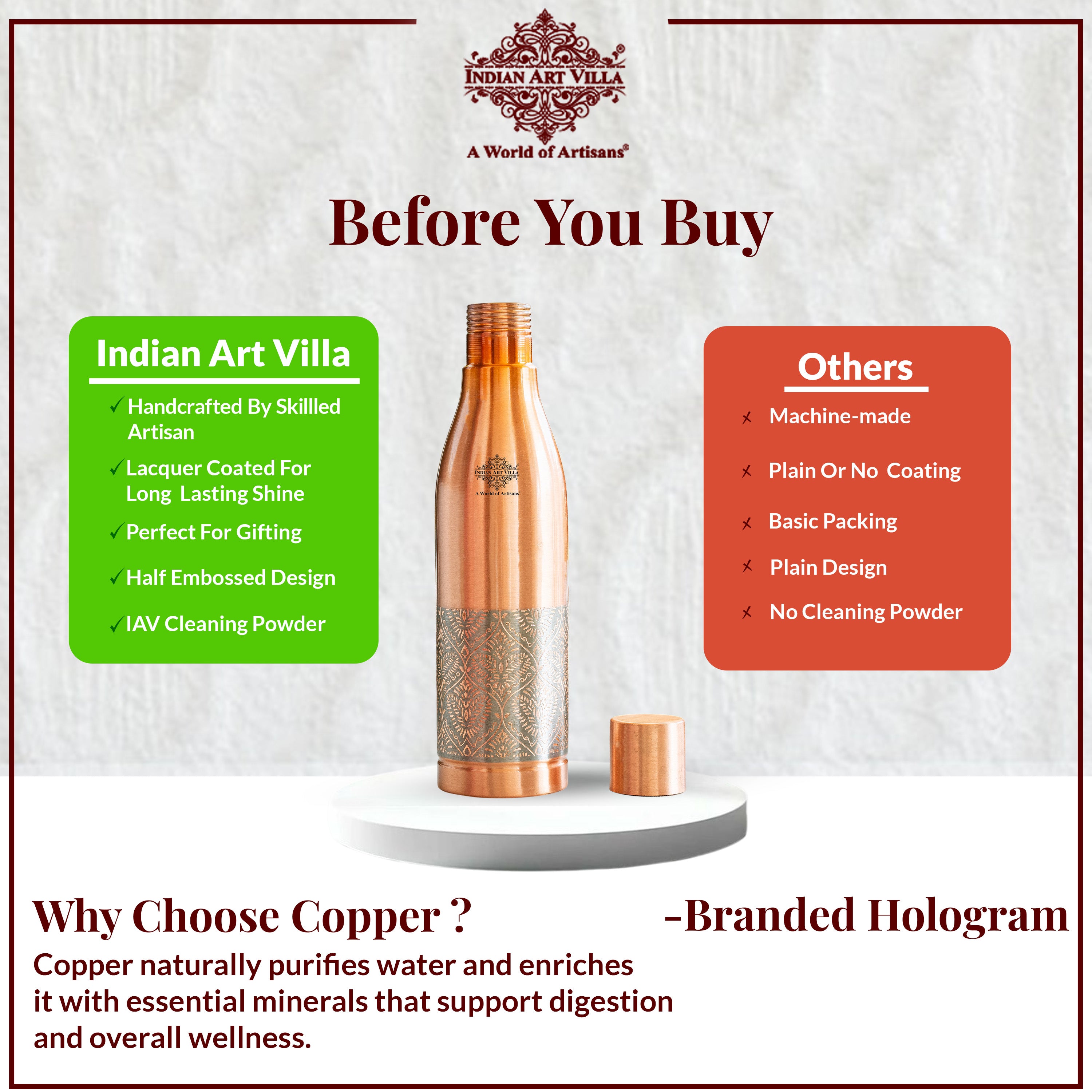 Ayurvedic Health Benefits: Storing water in a copper bottle naturally infuses it with antioxidant and anti-bacterial properties that promote digestion and overall well-being.