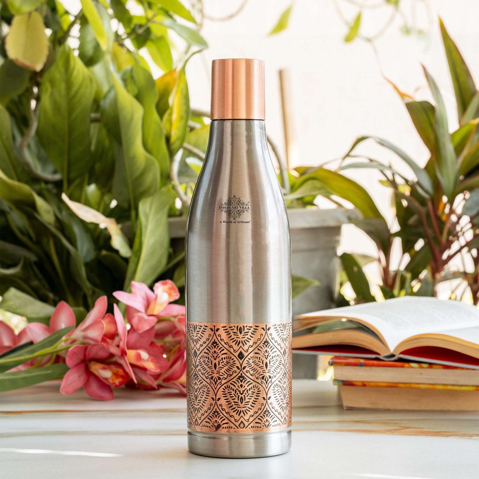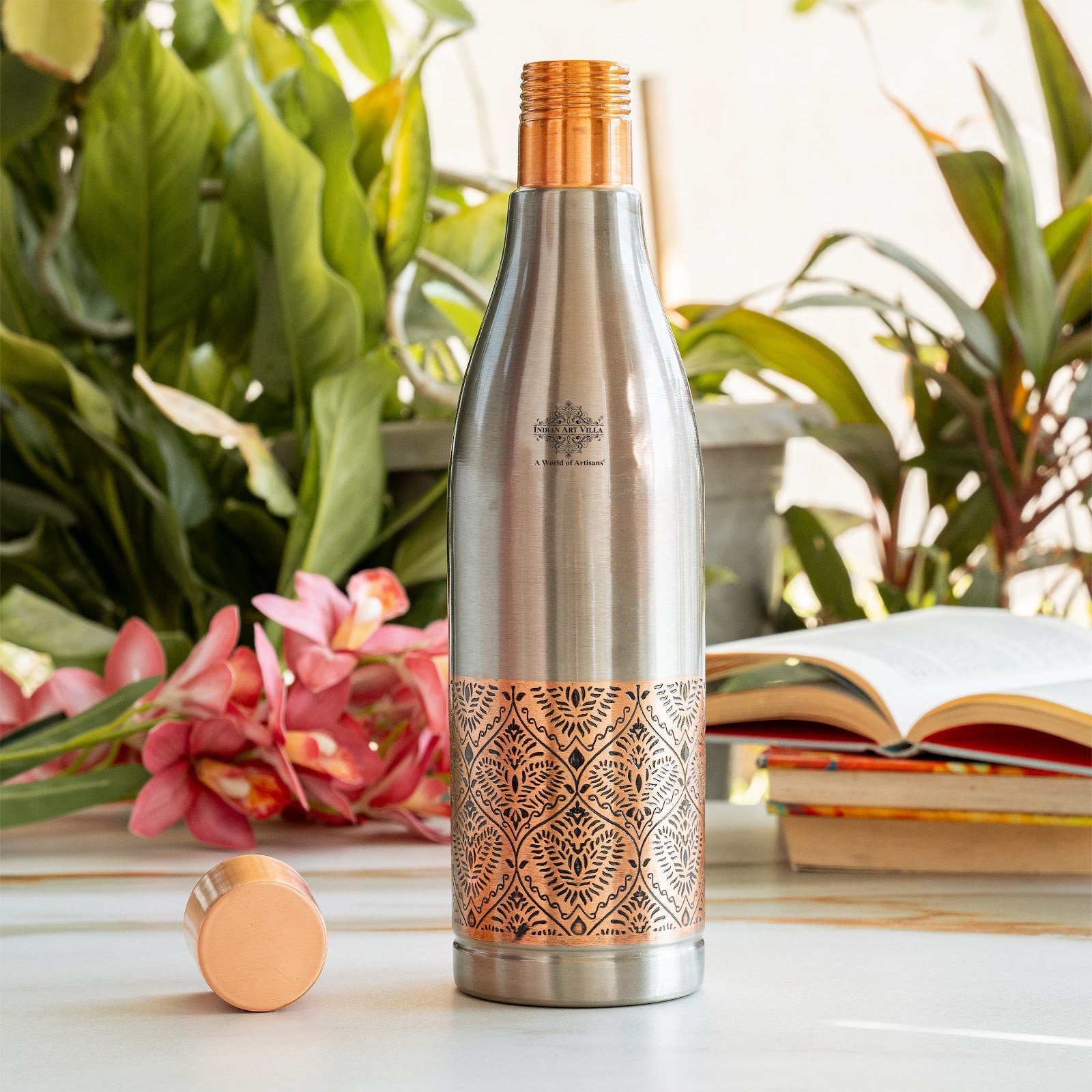 Bring home a touch of timeless elegance with the Indian Art Villa Pure Copper Hammered Water Bottle with Inbuilt Glass Lid with fully lacquer coating, a beautiful fusion of traditional Indian craftsmanship and modern functionality. Expertly handcrafted from 100% pure copper by skilled artisans of India, this bottle features a half-hammered and half-silk finish design that reflects both heritage and style. Its innovative lid can be used as a drinking glass, making it a perfect choice for bedroom, office, or travel use.