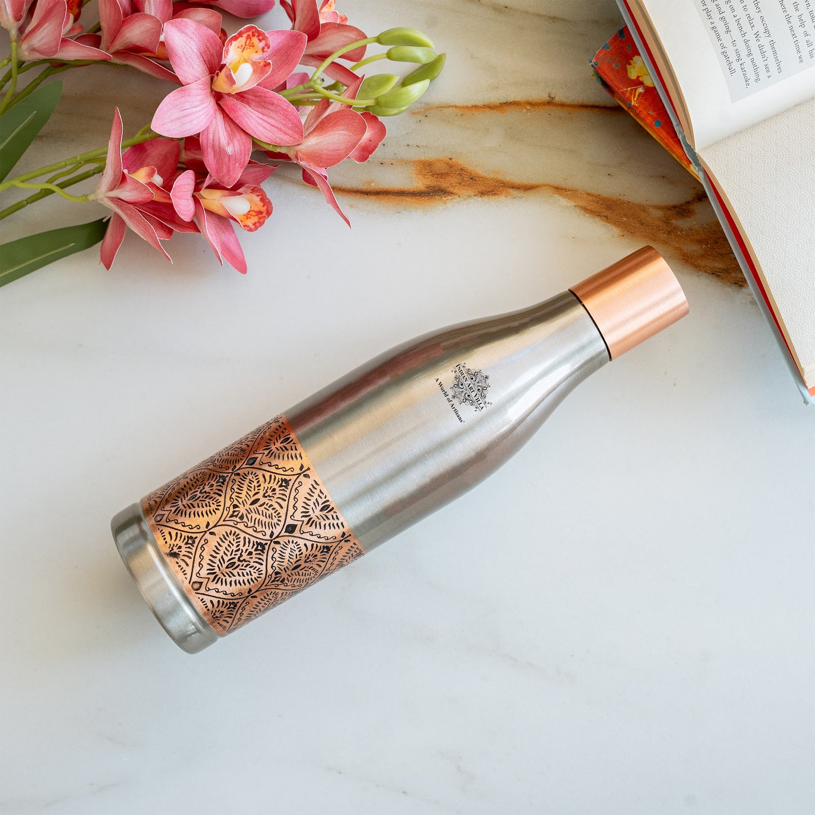 Design: This Bottle features a beautifully handcrafted hammered design at the center, paired with a smooth lacquer-coated finish across the entire body.