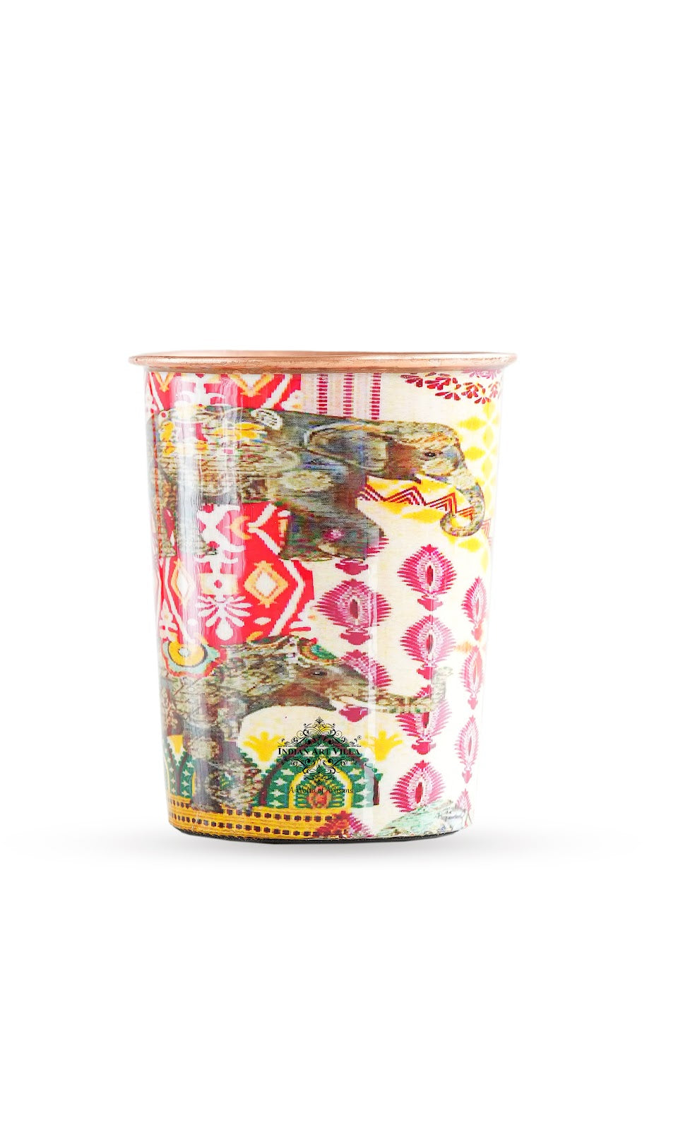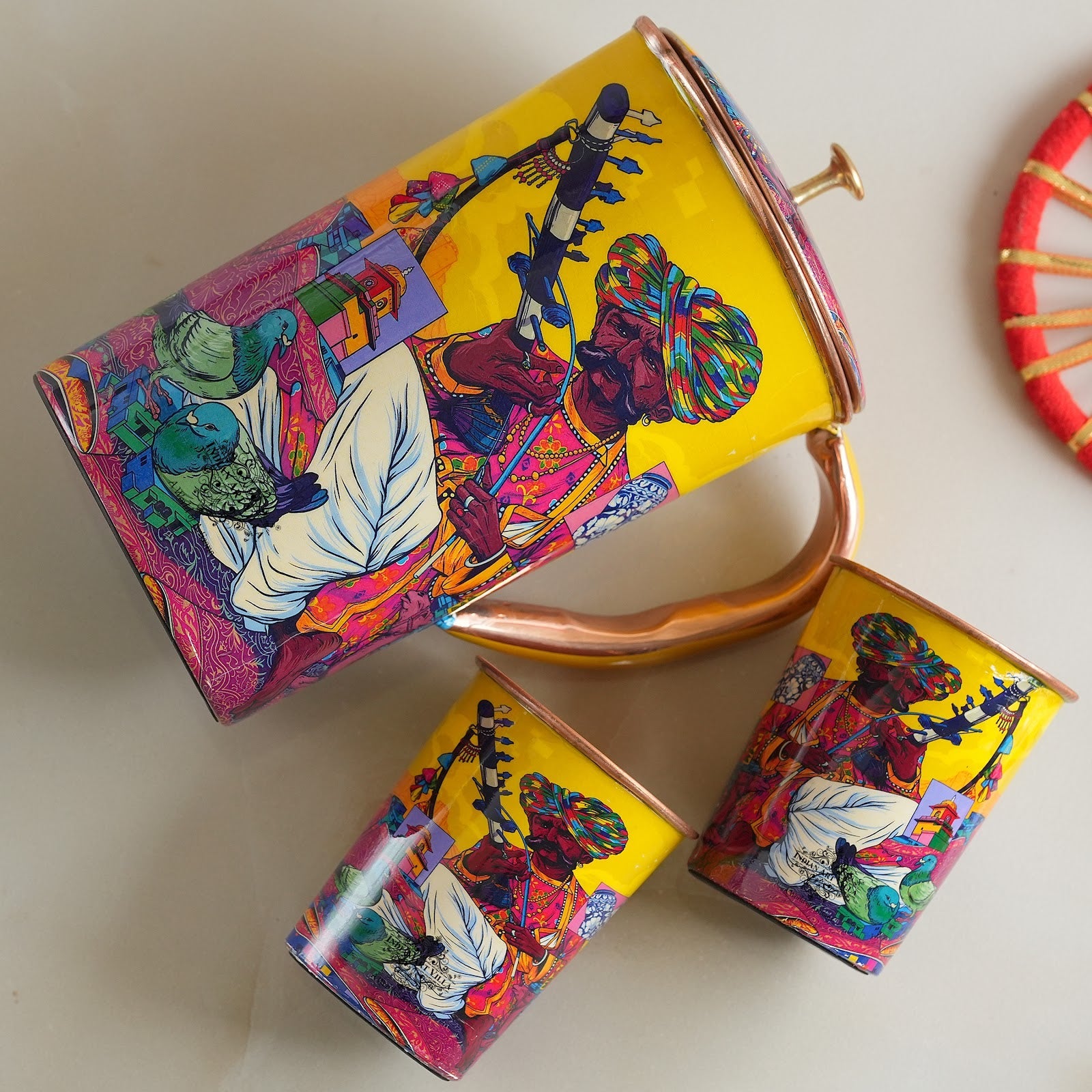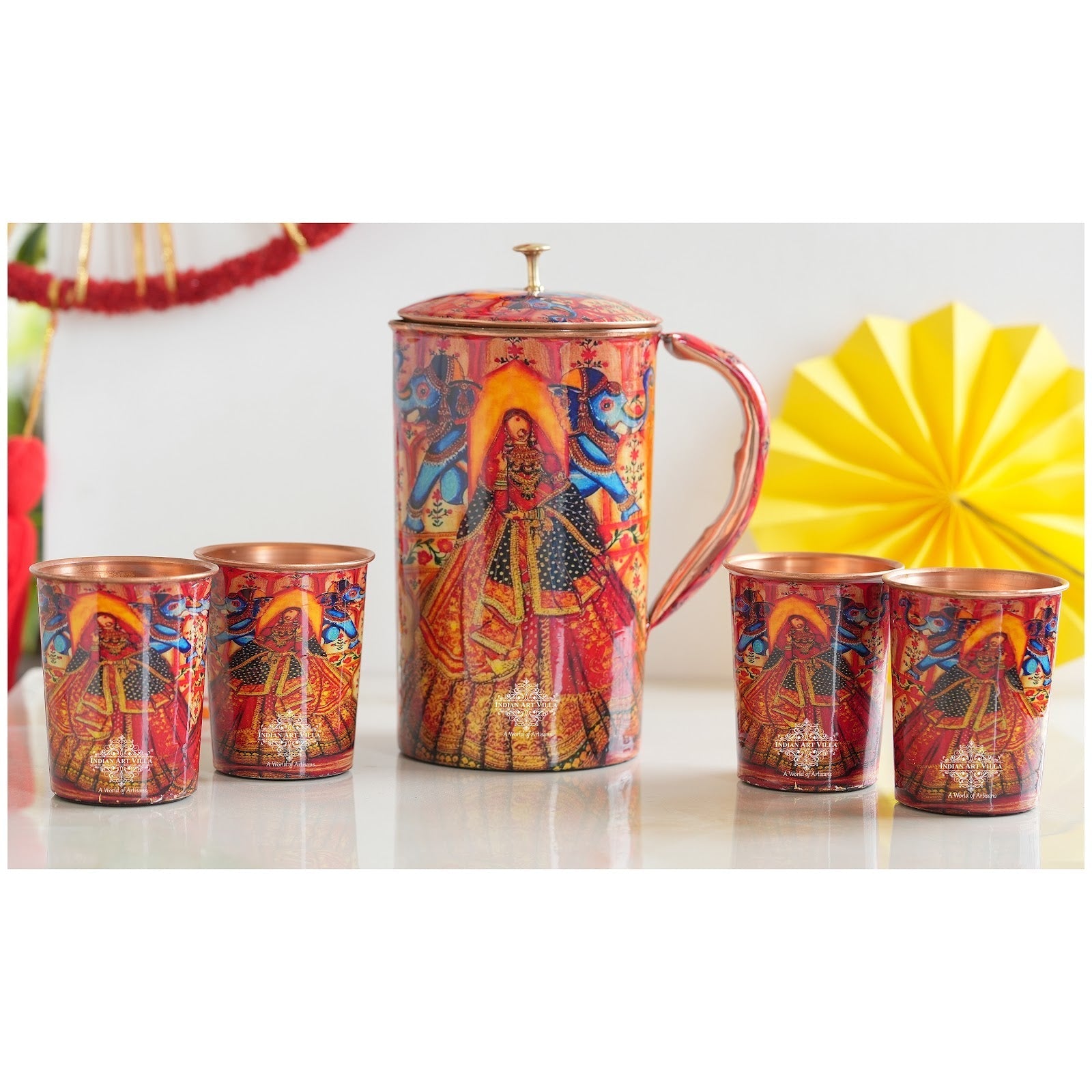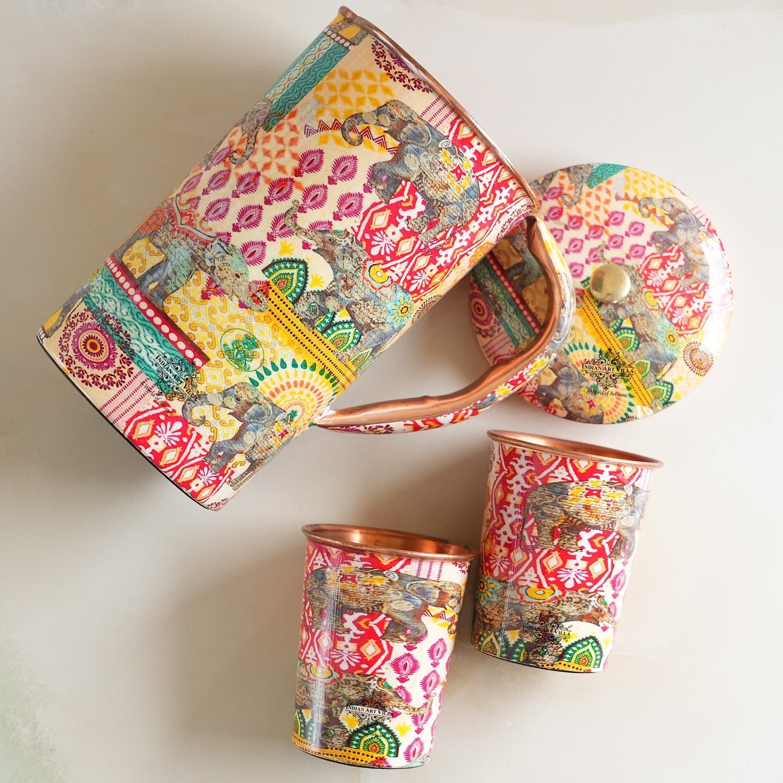 Design The set features a beautifully designed jug with matching glasses, all adorned with intricate ethnic patterns. The design includes vibrant multicolored motifs inspired by traditional Indian art, incorporating elements such as elephants, paisleys, and geometric patterns. The copper material provides numerous health benefits, such as improving digestion and boosting immunity.