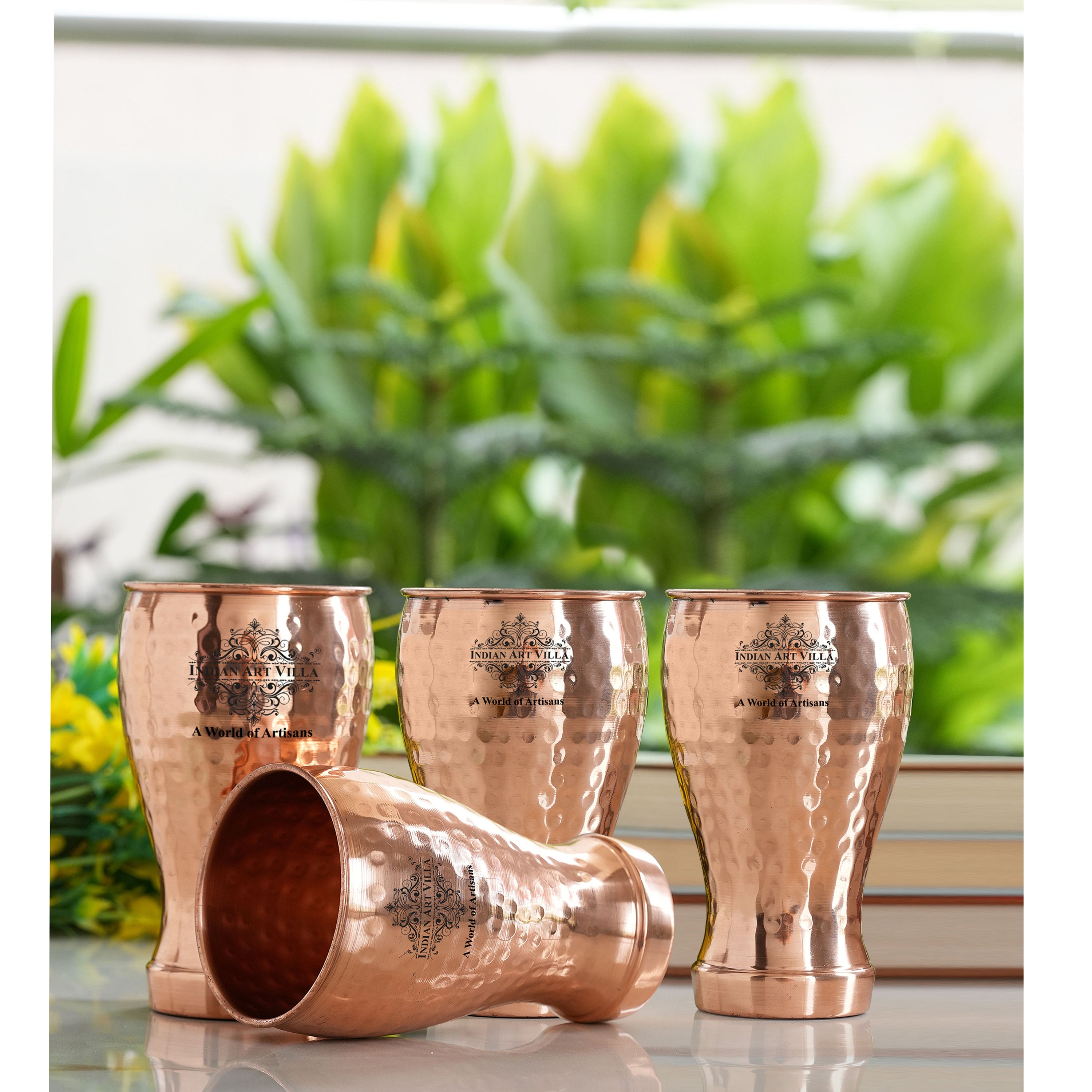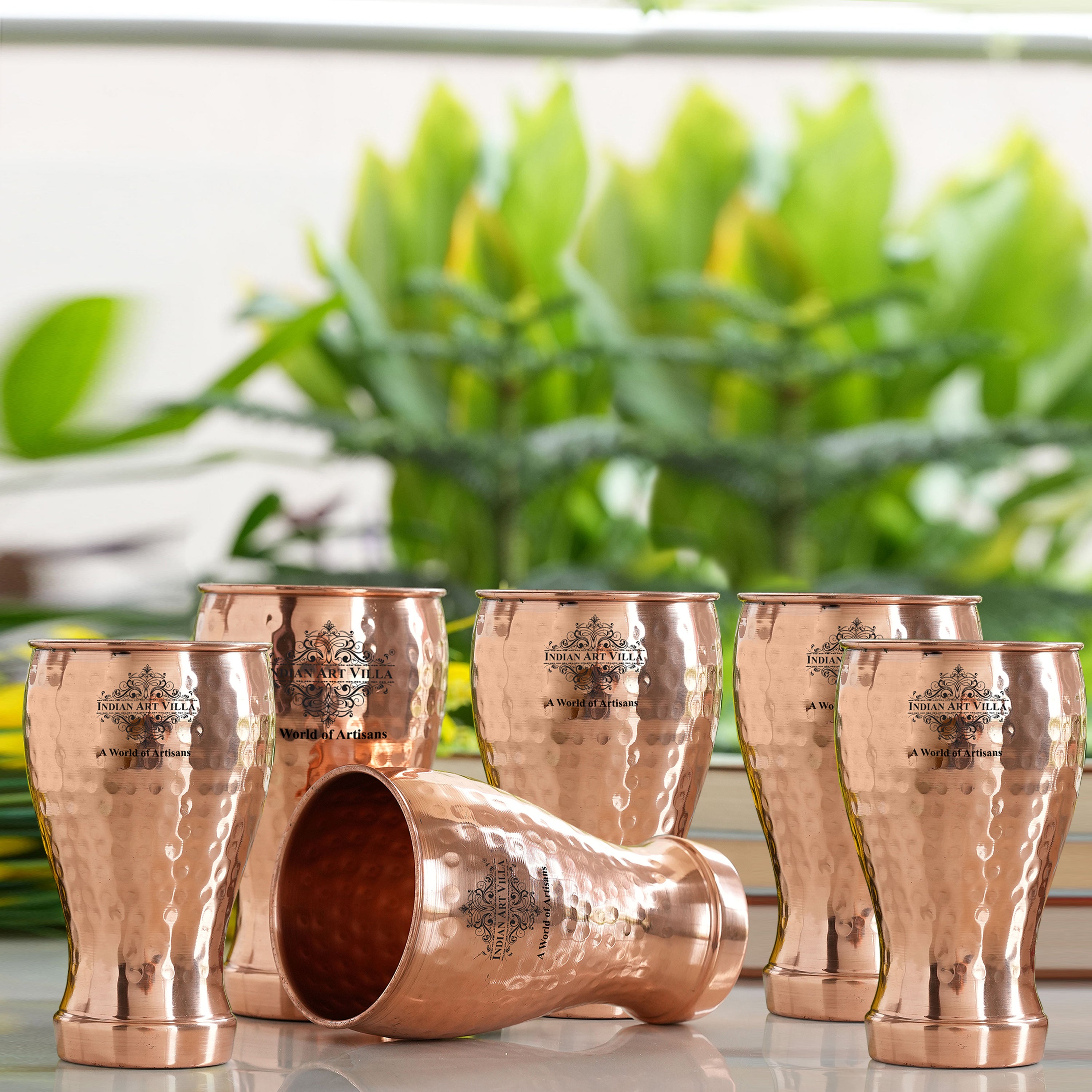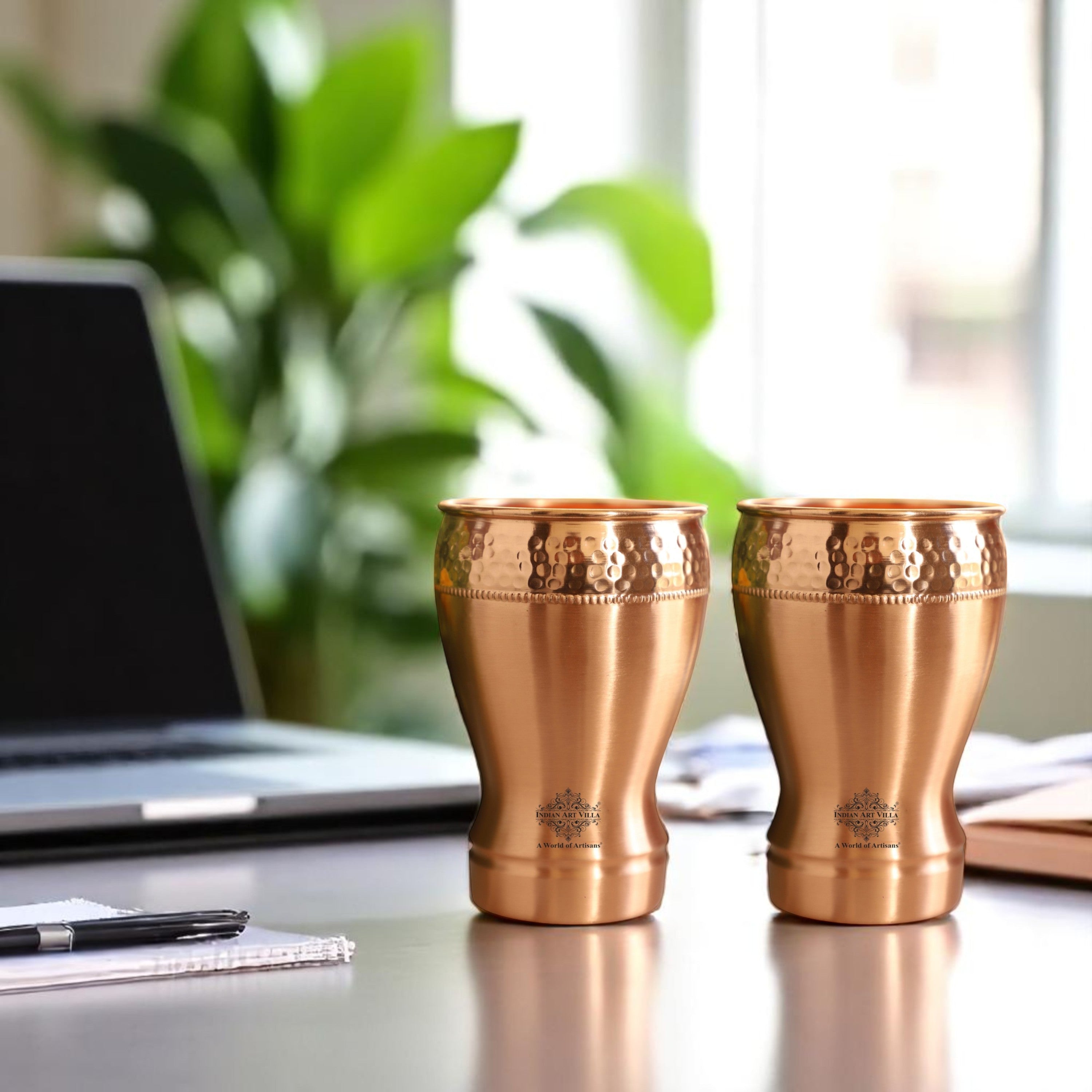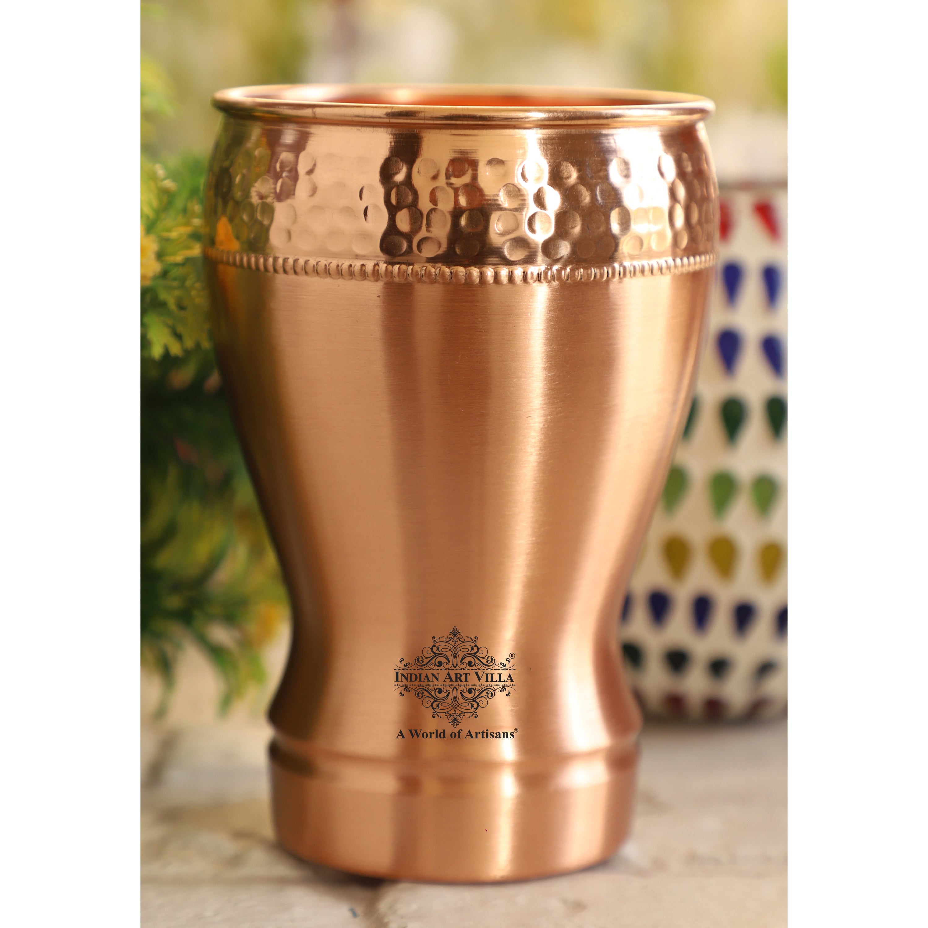 • Indian Art Villa Pure Copper Glass With Half Lecquer Hammered Design. Now the easy and healthy way of living is much easier than expected as genuine copper kills bacteria and is proved to be a remedy for weight, skin, and aging Problems.