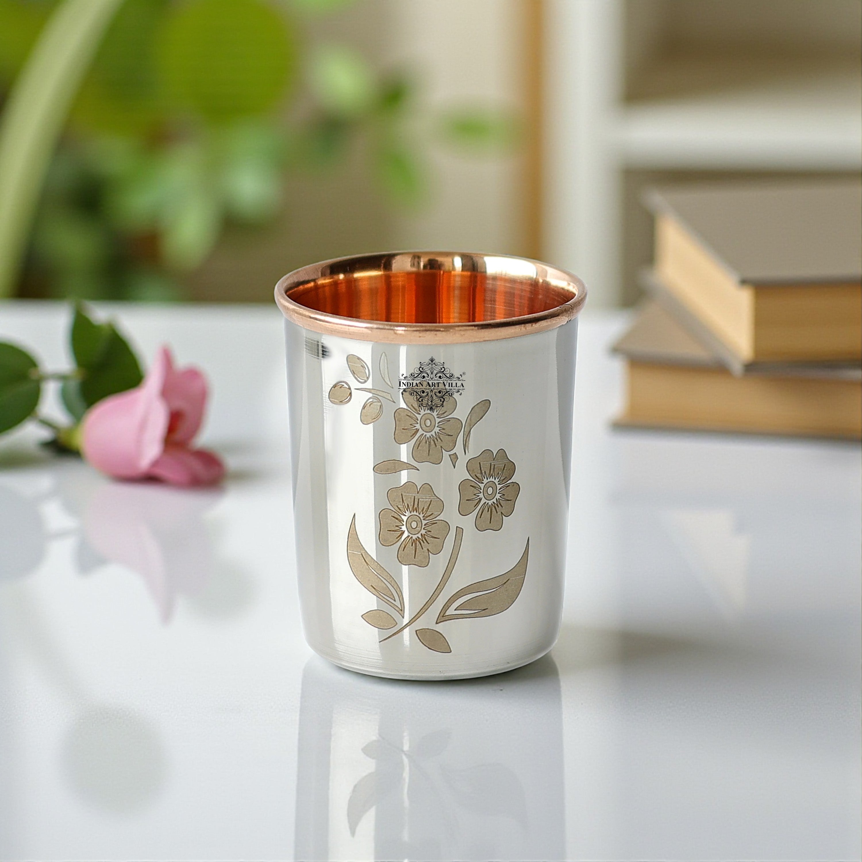 • Indian Art Villa Pure Steel Copper Engraved Floral Design Glass Tumbler. Now the easy and healthy way of living is much easier than expected as genuine copper kills bacteria and is proved to be a remedy for weight, skin, and aging Problems.