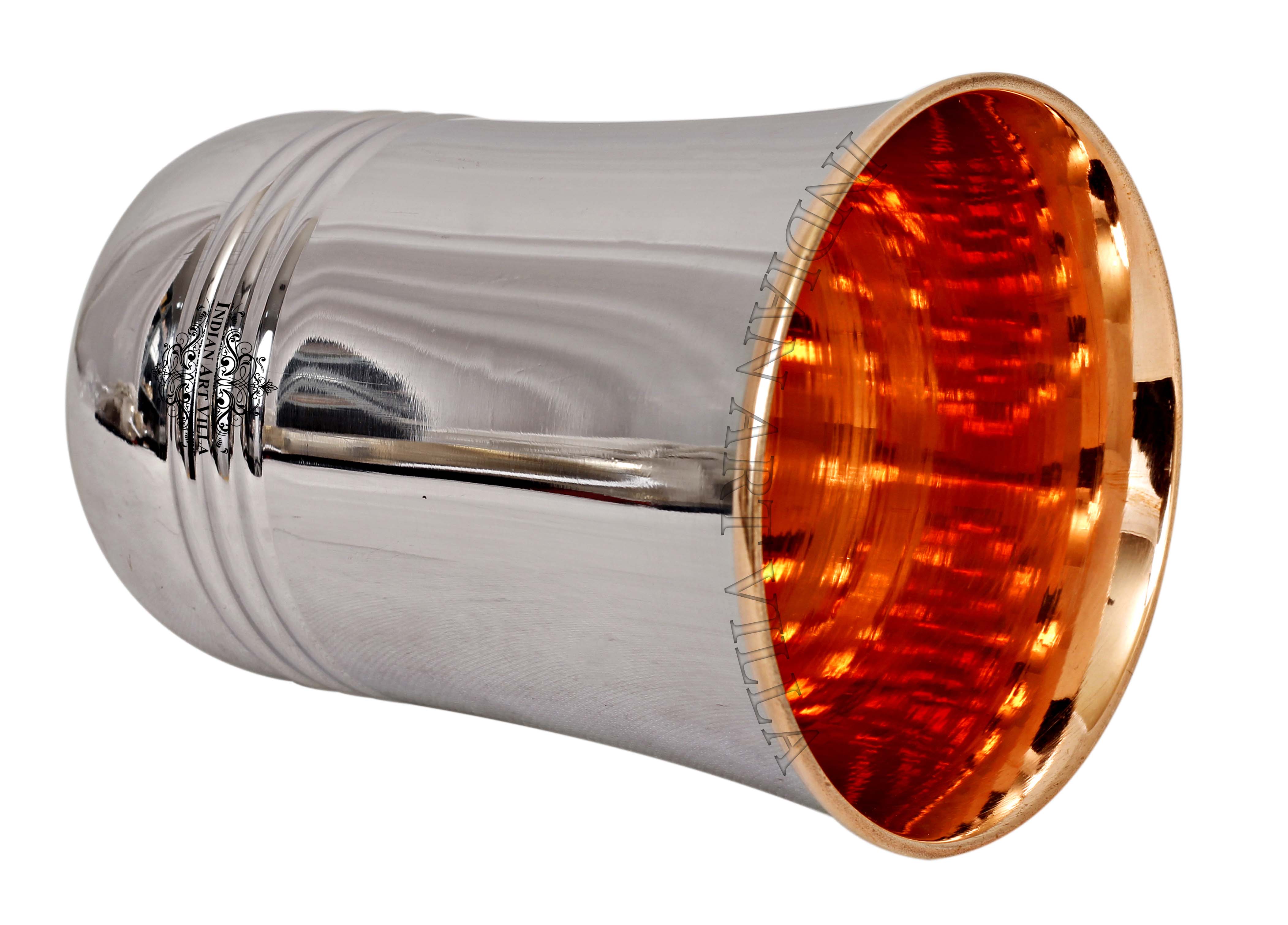 Indian Art Villa Presents Best Quality-Steel Copper Curve Shaped Glass, Tumbler Handcrafted in Luxury Design, that are used as Drinkware, Serveware, with a capacity of 250 ml. We offer the best affordable prices & Free Shipping PAN India. Drinking the Water stored in copper utensils has innumerable health benefits. It has anti-bacterial properties that help purify water & remove toxins. It aids digestion & Weight loss. It protects us from diseases like arthritis, anemia, blood pressure, hyperthyroid, cancer and relieves us of joint pains. It has immense skin benefits too. Copper is an Antioxidant and anti-carcinogenic that prevents cell damage and slows aging. Copper is the primary element to produces melanin (pigmentation of eyes, hair, and skin) in the human body. The easiest and cheapest way to cure the copper deficiency is to drink the water stored in copper vessels. One should make it a habit of drinking water stored in copper utensils so as to keep themselves healthy. We suggest that one should drink this water stored in a copper vessel in copper Tumblers / Glasses only so that the pH level of water doesn't change when filled from the copper vessel into glasses and it stays as healthy as it was for you earlier.