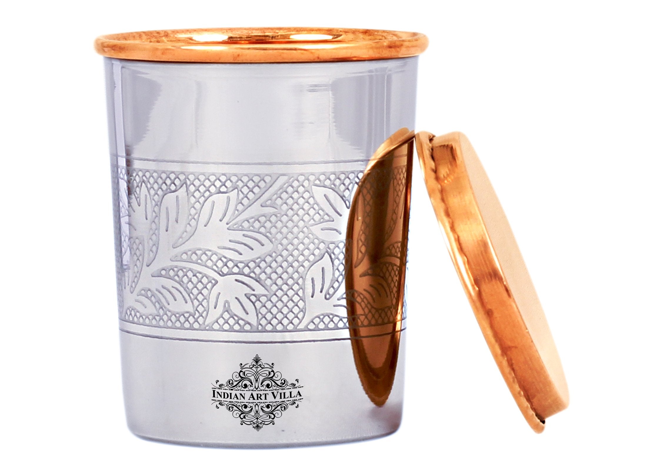 Indian Art Villa Presents Best Quality Steel Copper Designer Tumbler / Glass handcrafted in luxury design & Embossed Design with a lid having a capacity of 250ml. We offer best affordable prices & Free Shipping PAN India. Drinking the Water stored in copper utensil has innumerable health benefits. It has anti bacterial properties that helps purify water & remove toxins. It aids digestion & Mfd. Month/Year : Nov. 2025