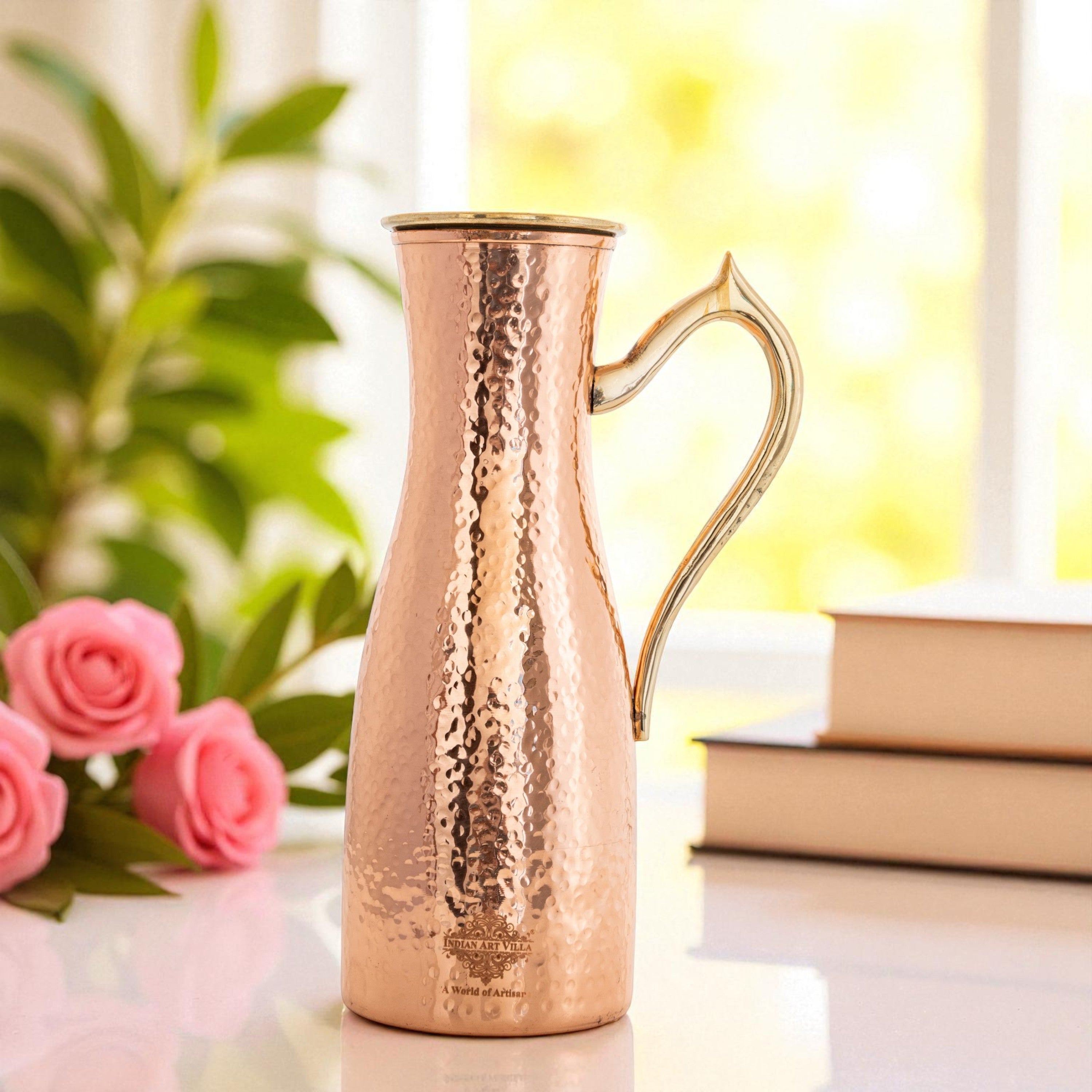 Elegance and wellness to your lifestyle with this Indian Art Villa Copper Jug with Hammered Curve Design, Brass Handle & Lid – 1400 ML. Beautifully handcrafted by skilled Indian artisans, this jug reflects the rich cultural heritage of Indian metalwork. The graceful curve shape is enhanced with a hammered texture, offering both aesthetic appeal and traditional charm. Made from 100% pure copper, this jug is not only a striking serveware piece but also serves as a functional health companion. As per Ayurvedic traditions, storing water in a copper jug helps balance the body’s three Doshas—Vata, Pitta, and Kapha—by infusing the water with natural copper ions. It is known to support digestion, enhance metabolism, and boost immunity when consumed regularly. The jug features a luxurious brass handle and lid, perfectly complementing the copper body with added strength and a comfortable grip. The lid fits securely to prevent spillage and helps preserve the quality of the stored water. With a capacity of 1400 ML, this jug is ideal for home use, office desks, or hospitality settings such as hotels and restaurants.