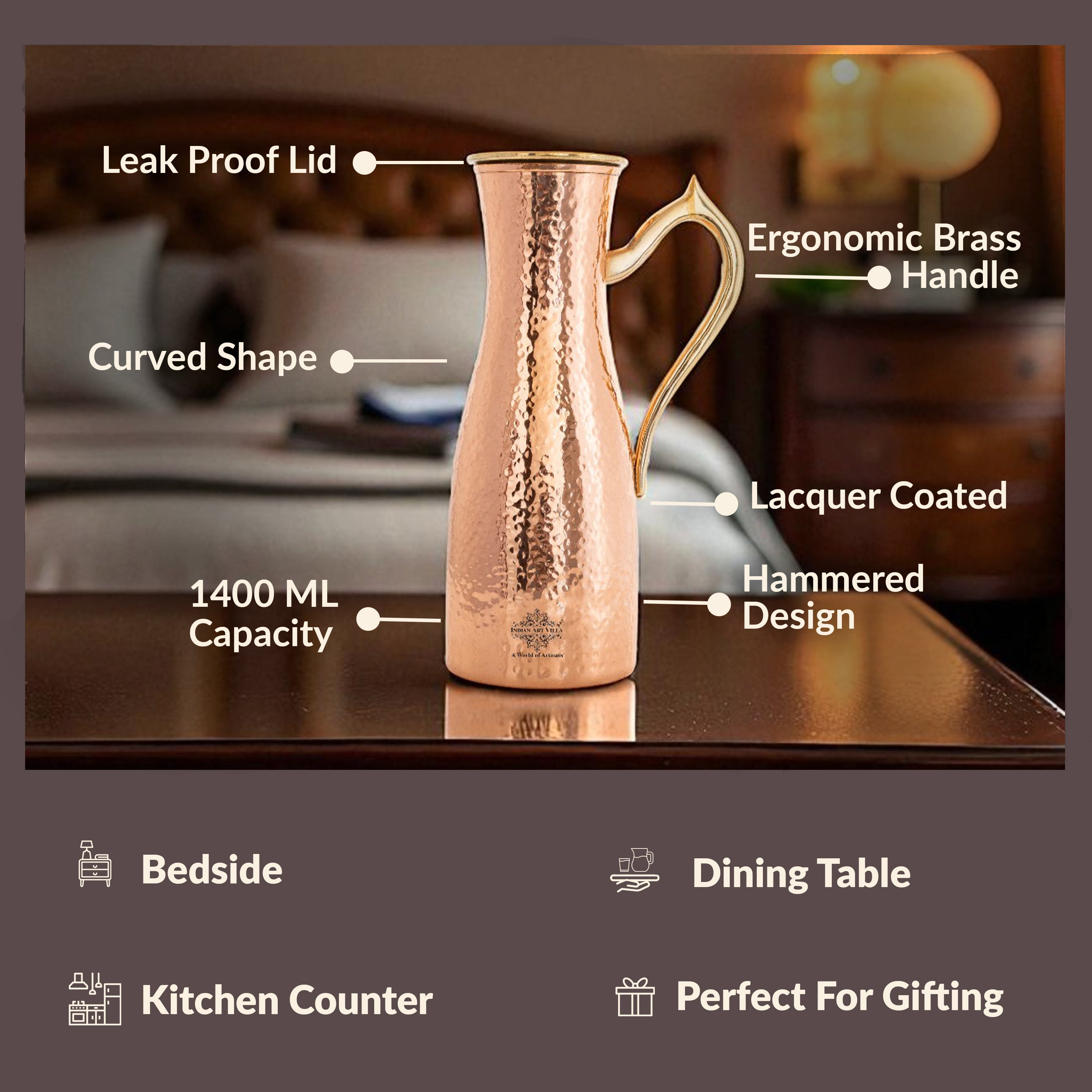 Copper Jug with Hammered Curve Design, Brass Handle & Lid – 1400 ML