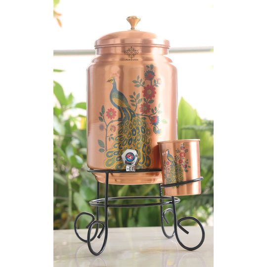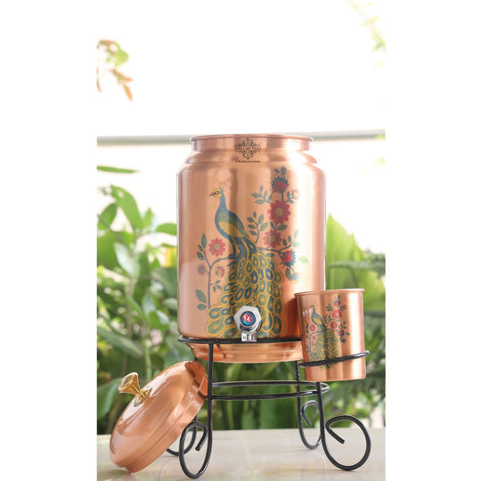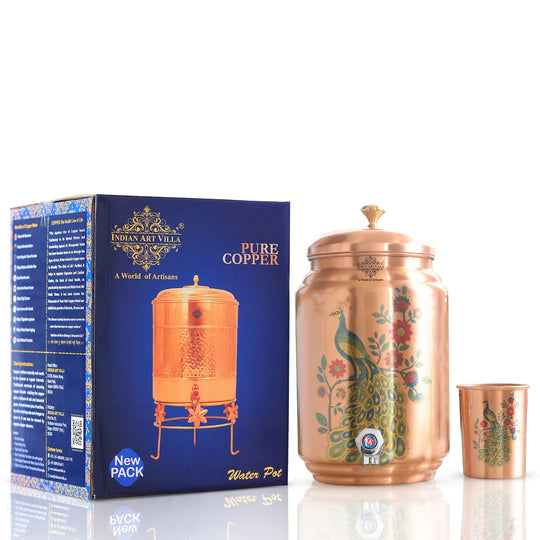 Indian Art Villa Copper Peacock Printed Design Water Pot with Stand & Glass, featuring a capacious 5-liter capacity, is a harmonious blend of tradition and functionality. This exquisite set not only serves a practical purpose but also adds a touch of elegance to your home with its unique design. Crafted from high-quality copper, the water pot is adorned with a captivating peacock print design. This intricate motif not only enhances the aesthetic appeal but also pays homage to Indian cultural heritage, making it a symbol of artistry and tradition. The set includes a matching stand and glass, creating a complete and coordinated serving ensemble. The stand not only adds stability but also elevates the water pot, allowing for easy dispensing without the need to lift the heavy vessel.