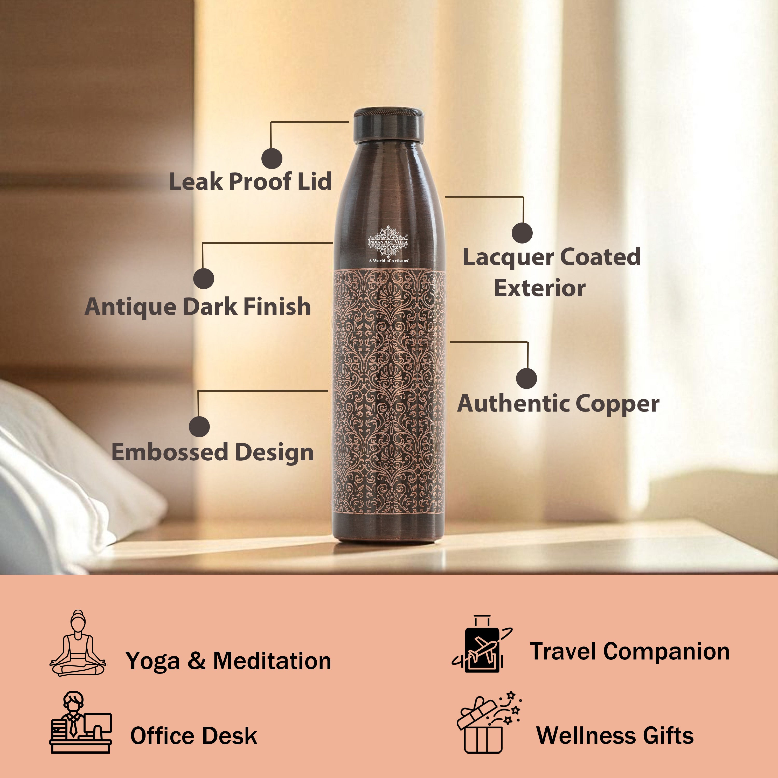 Antique Dark Embossed Design: The bottle features an intricate embossed design with an antique dark finish, adding a touch of elegance and sophistication to its appearance. This design enhances the aesthetic appeal of the bottle, making it a stylish accessory for carrying water or other beverages.