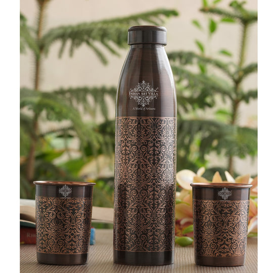 Pure Copper Antique Finished Embossed Design Bottle With Glass Set