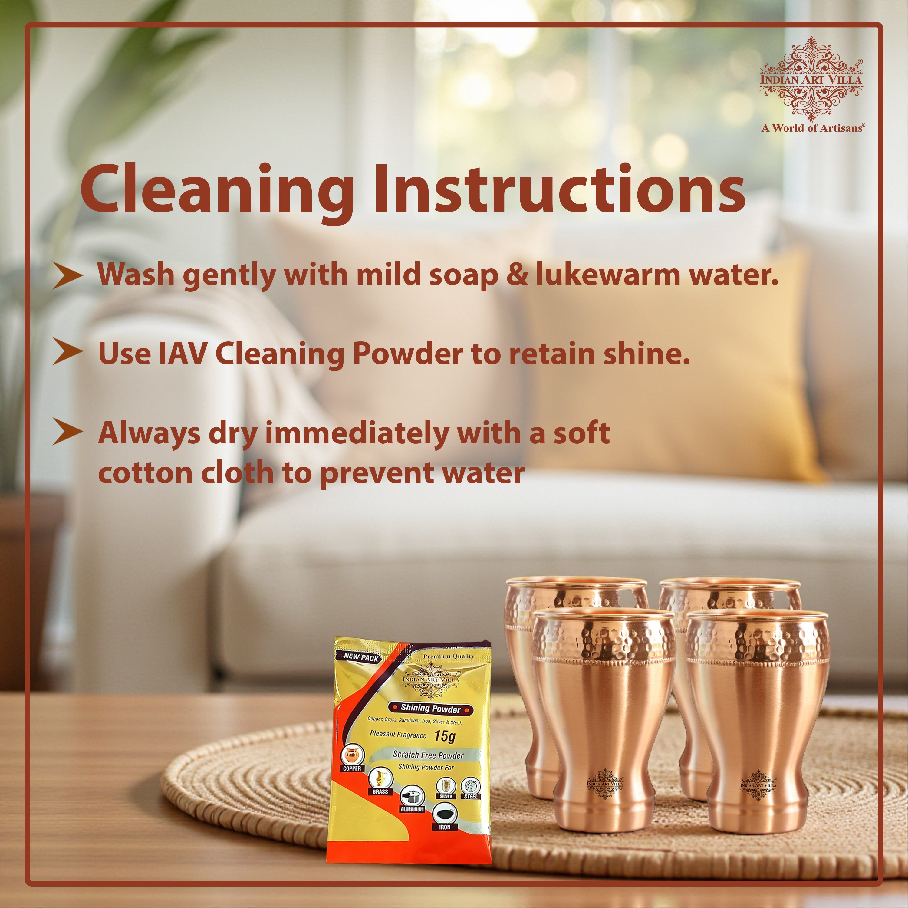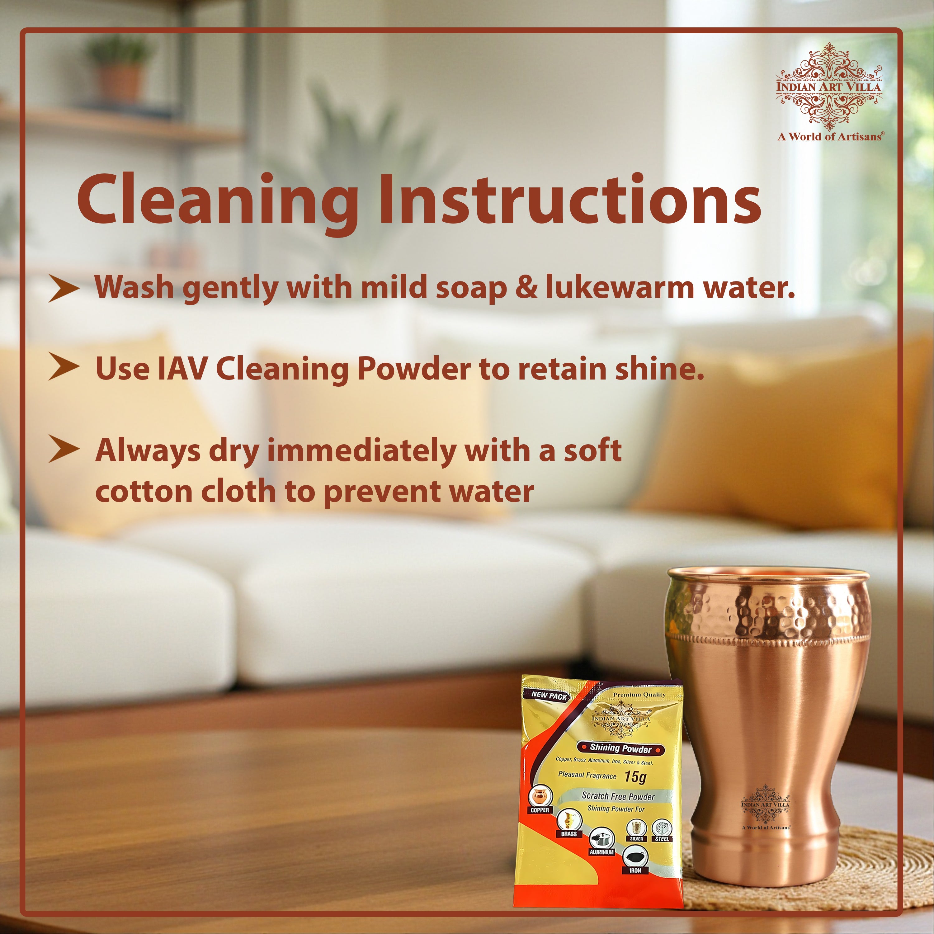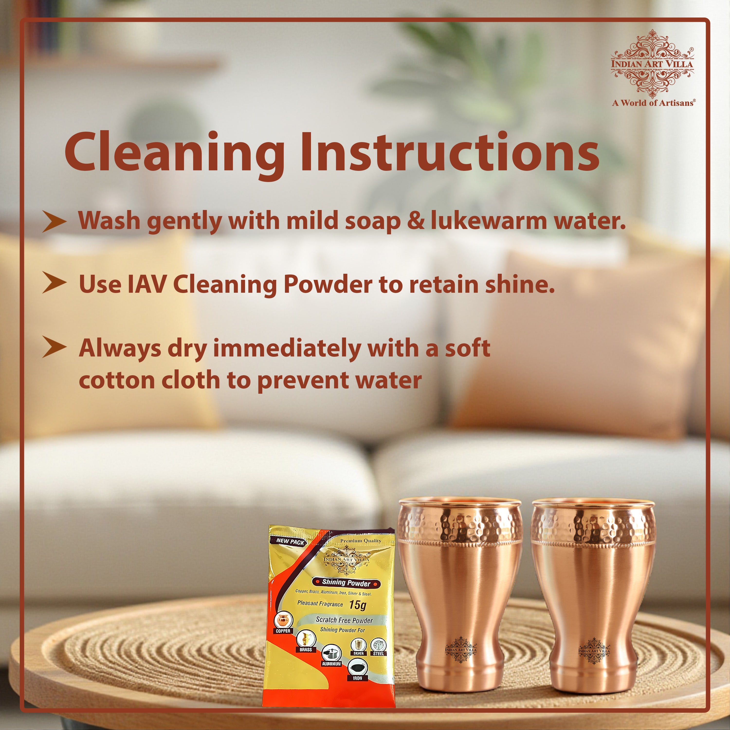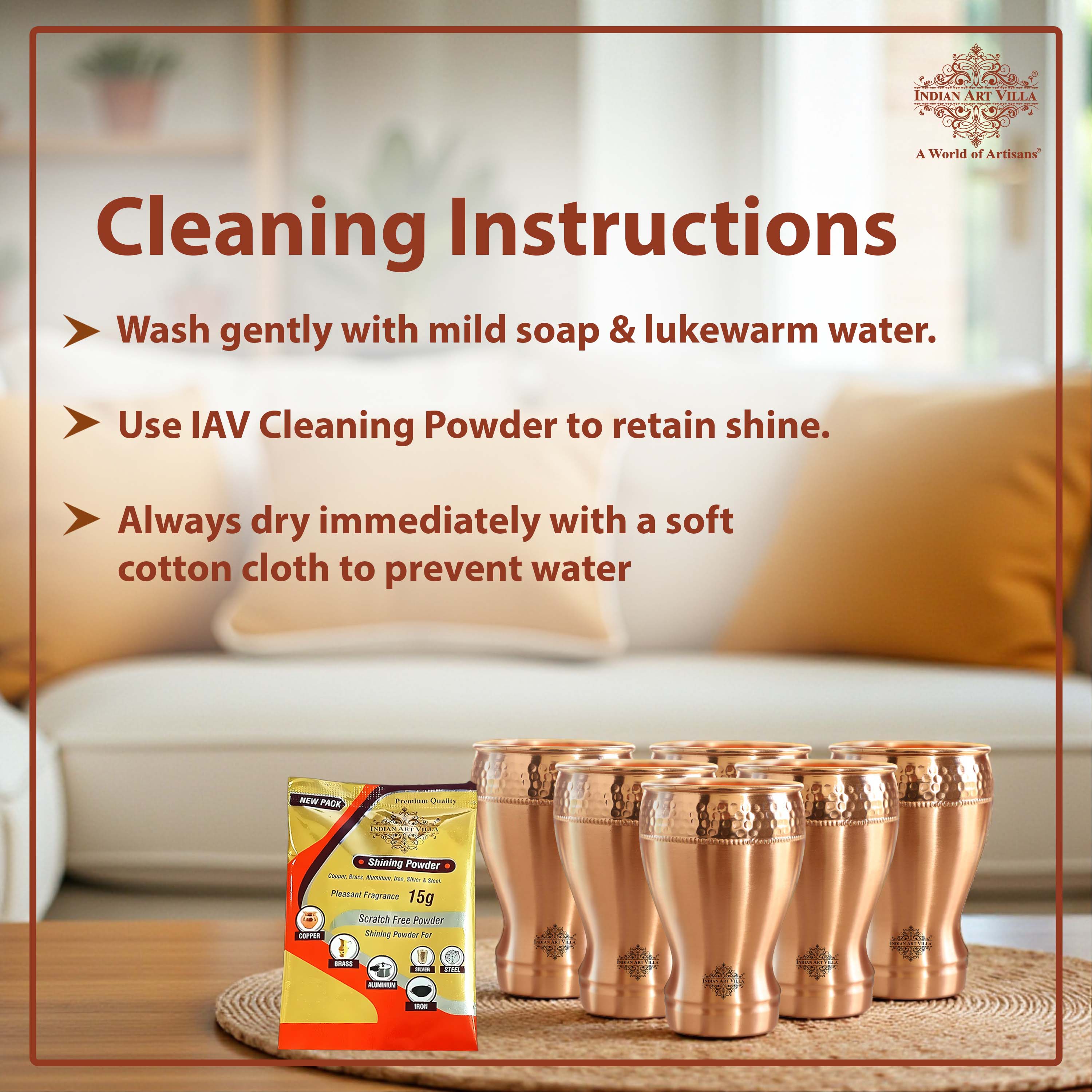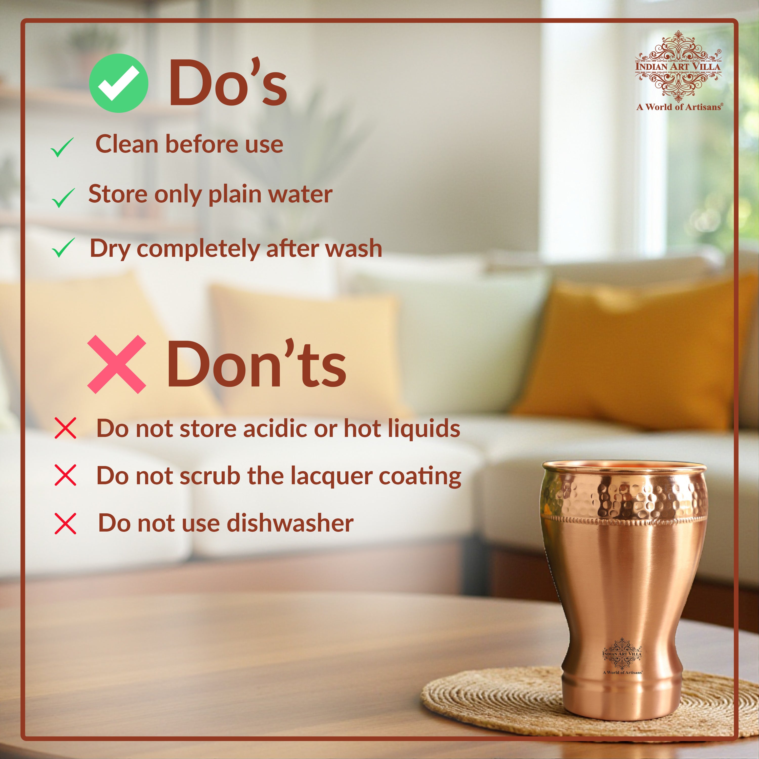 Indian Art Villa Presents Best Pure Copper Glass With Half Lecquer Hammered Design. We offer the best affordable prices. We also offer Easy returns & exchanges. T&C Applied. Water stored overnight in copper Utensils is essential for hemoglobin synthesis, bone strength, and immunity building. Copper helps in maintaining digestive health, healing wounds, and relieving pains. Copper is an Antioxidant and anti-carcinogenic that prevents cell damage and slows aging. Copper is the primary element to produces melanin (pigmentation of eyes, hair, and skin) in the human body. Something as simple as copper-treated water can help in improving your overall health greatly. It is a proven fact that water stored in copper Glass overnight is known to be purer and absolutely safe for drinking. Consumption of copper-charged water helps in curbing away several serious health ailments ranging from thyroid to cardiovascular diseases easily. Copper utensils need to be cleaned at regular intervals for removing the dark marks. Dark marks are formed due to the oxidization process. It is the basic nature of Pure Copper that it oxidizes when it comes in contact with air and water.Indian Art Villa Copper items have antique designs. The item is highly durable, elegan, and a wonderful addition to your Home Decor.