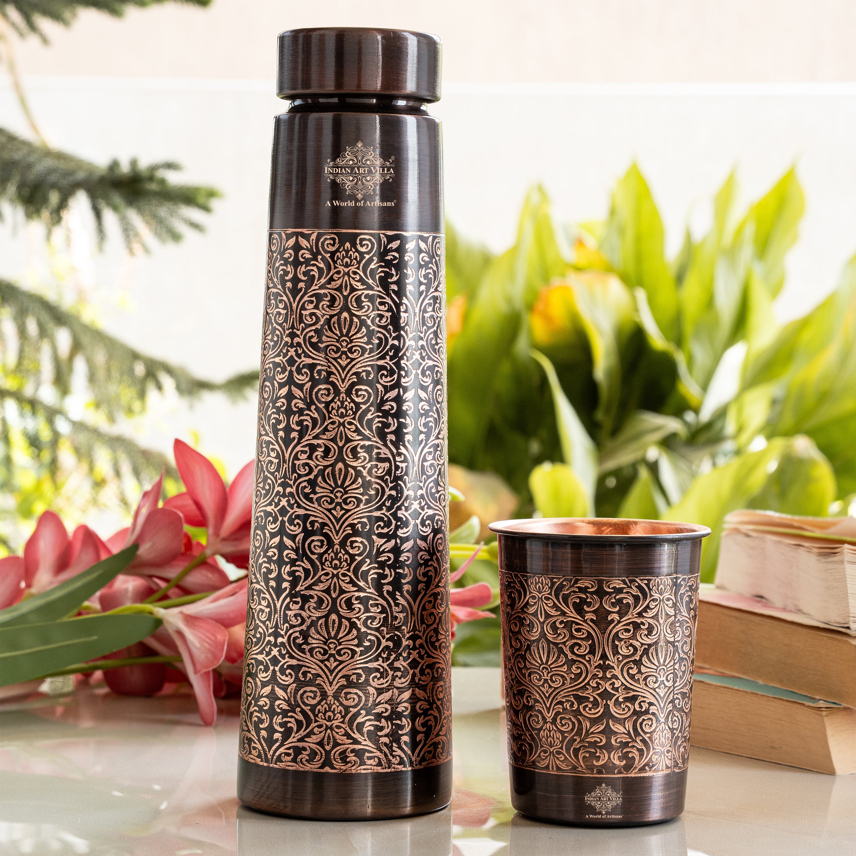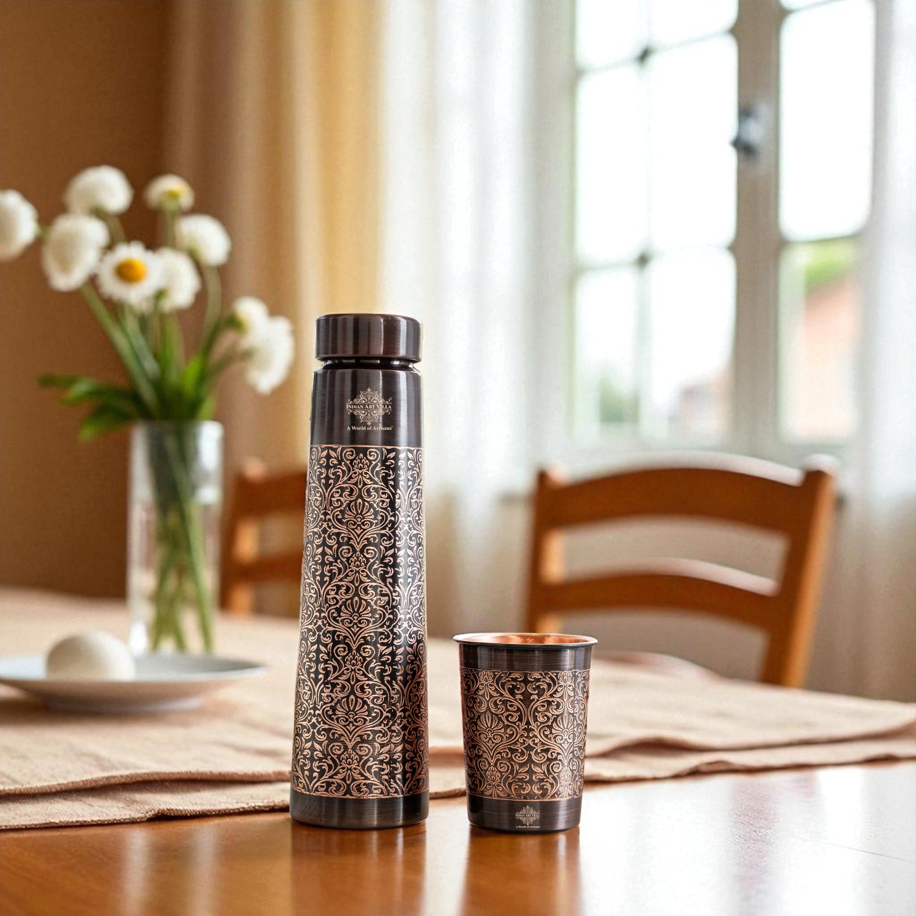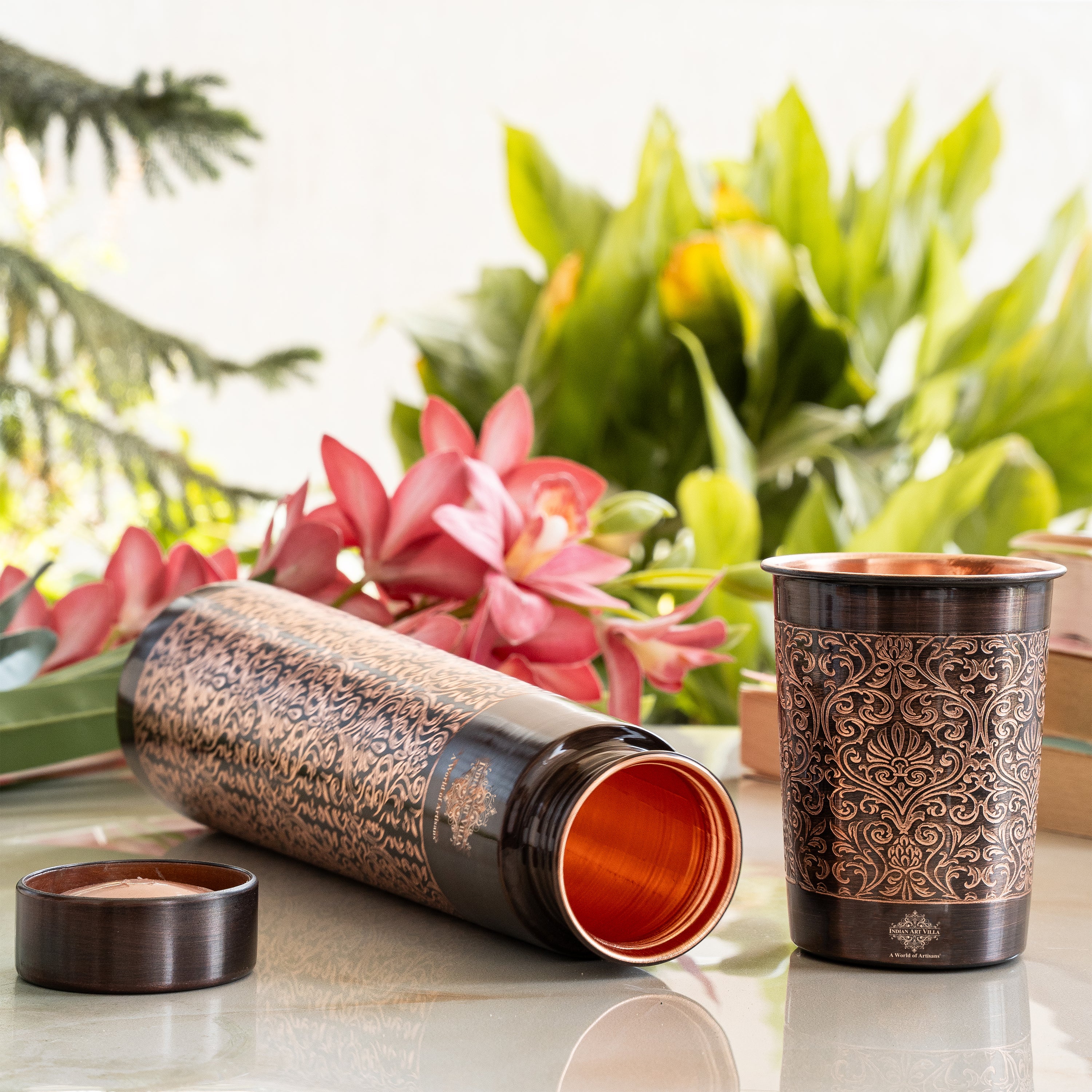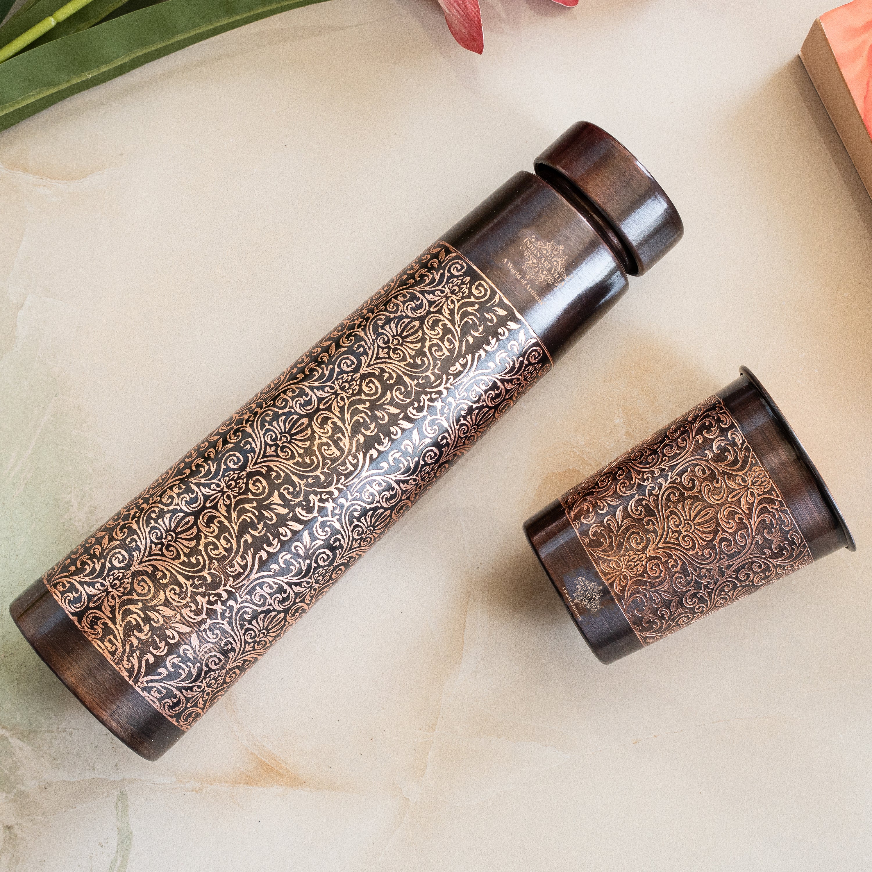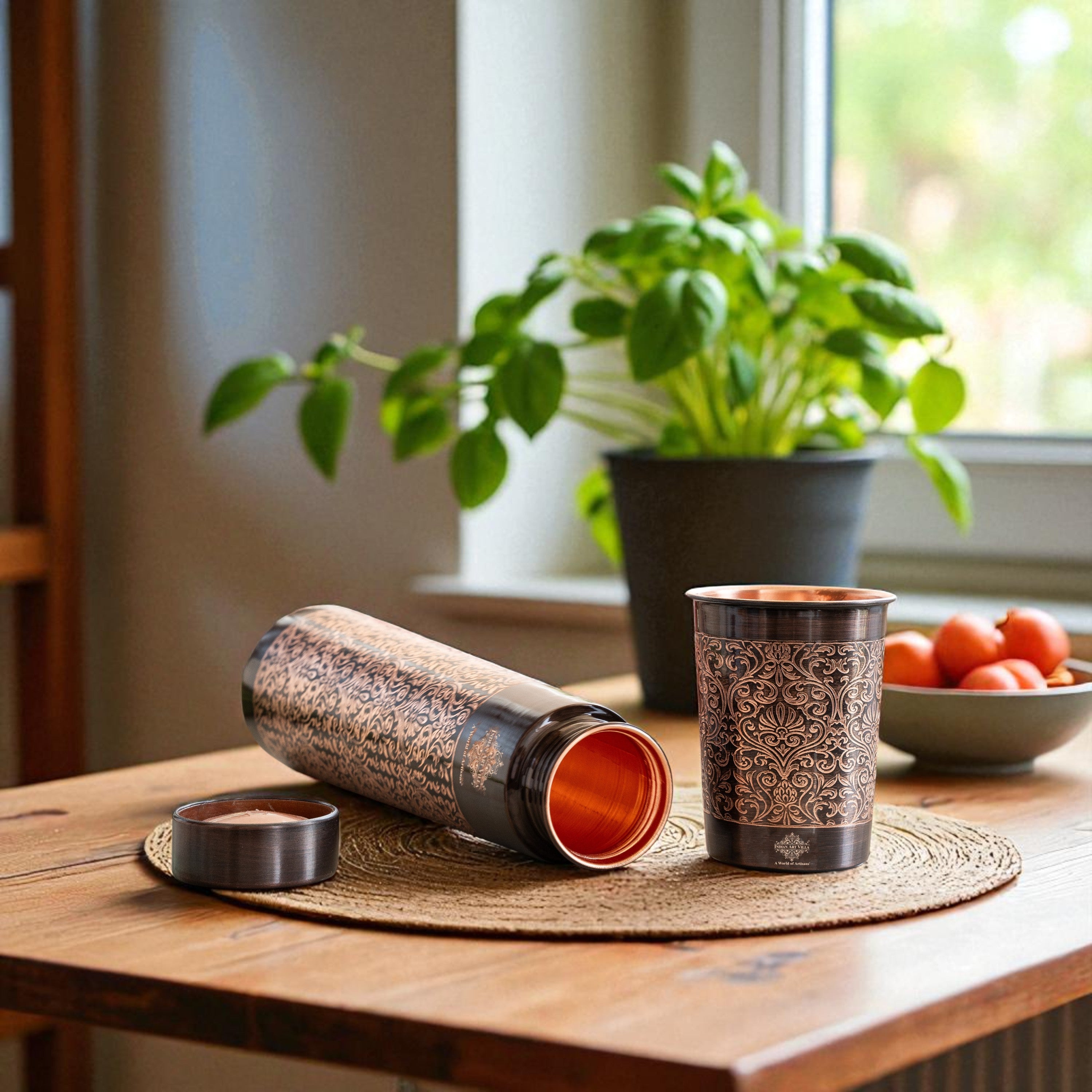 Add a touch of timeless elegance to your daily routine with the Indian Art Villa Copper Antique Finish Bottle and Glass Set. This premium set includes an 800 ML embossed copper water bottle and a matching 275 ML glass, both featuring a stunning antique dark finish with intricate floral patterns. Made from pure copper, this set not only exudes a regal aesthetic but also offers holistic health benefits rooted in Ayurveda —such as aiding digestion, improving metabolism, and enhancing immunity when water is stored overnight. The bottle’s leak-proof cap ensures safe use during travel or office commutes, while the compact yet stylish tumbler complements any table setting. Whether you're gifting someone special or upgrading your wellness routine, this embossed copper bottle and glass set makes a lasting impression.