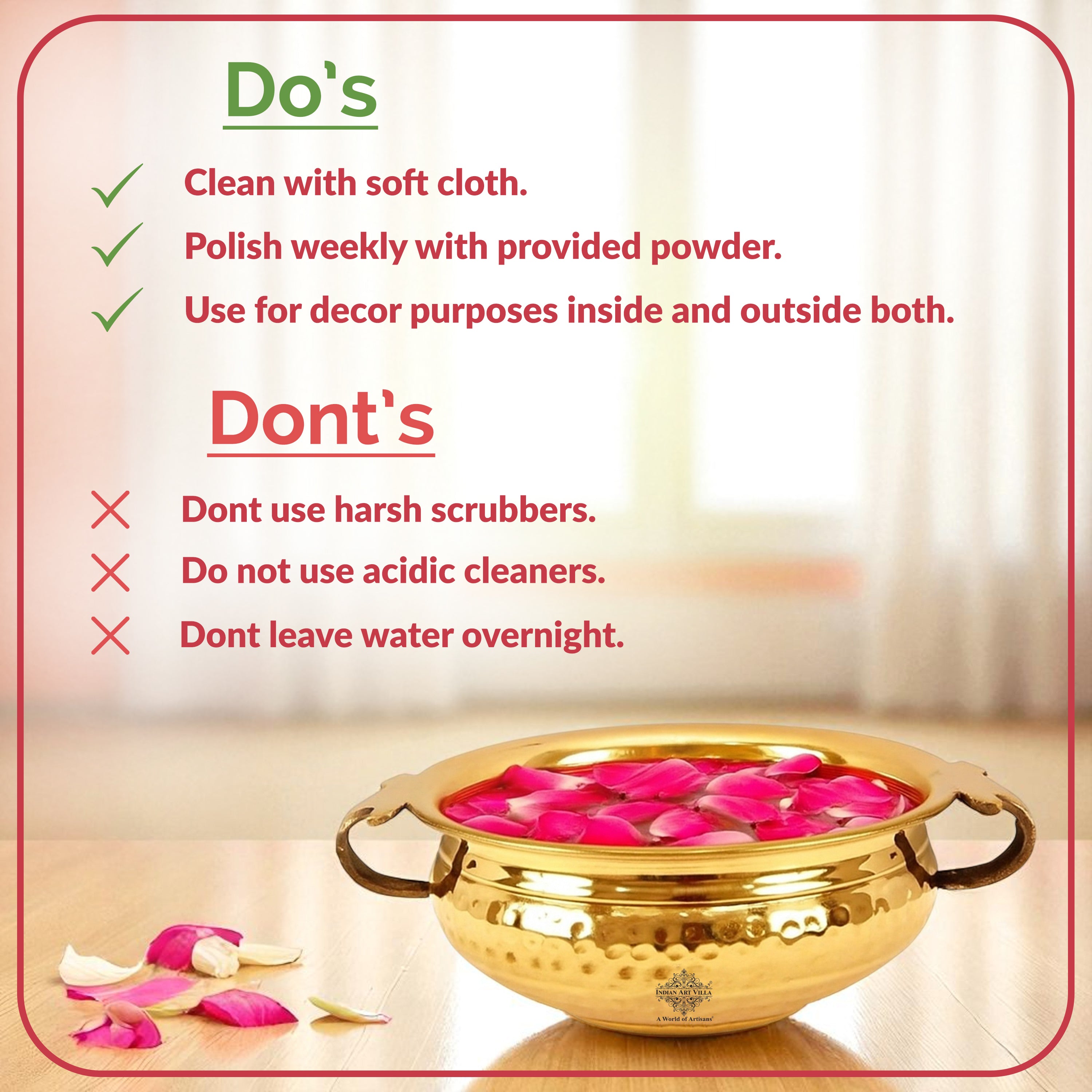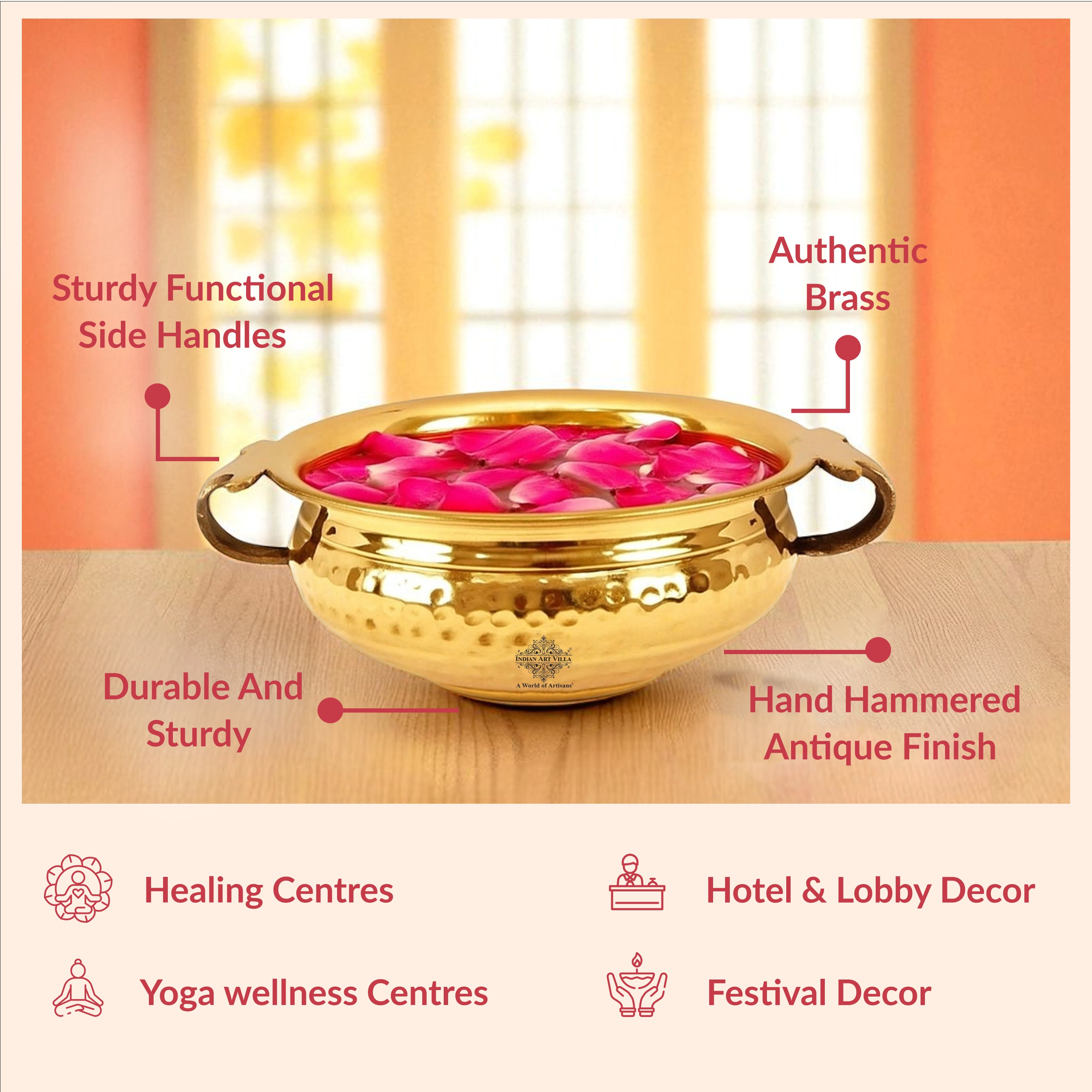 Indian Art Villa Presents Brass Hammered Urli Pot / Containers with Handles for Home Decor at the best price ever. Urlis were originally used in cooking, with a large Urli also being known as a ‘varpu’ in Kerala. The structure of the vessel makes it ideal for slow cooking, by spreading the heat evenly and retaining flavors. Besides cooking food, urlis are also used in making Ayurvedic medicines, Massage oils and other herbal concoctions are made in these urlis and left to brew in them for several hours. With so many uses, it’s only natural that the urli is associated with prosperity Brass is a material that has been used and cherished by our ancestors and it possesses some miraculous health benefits which have been proved scientifically as well. Brass Not only have health Benefits but also adds a Vintage / Royal look to your Space. Storing and cooking beverages in brass vessels help increase immunity and strength in your body. It helps in increasing haemoglobine, general skin condition, mental health, and pitta. This is why many people have started using brass utensils at home.