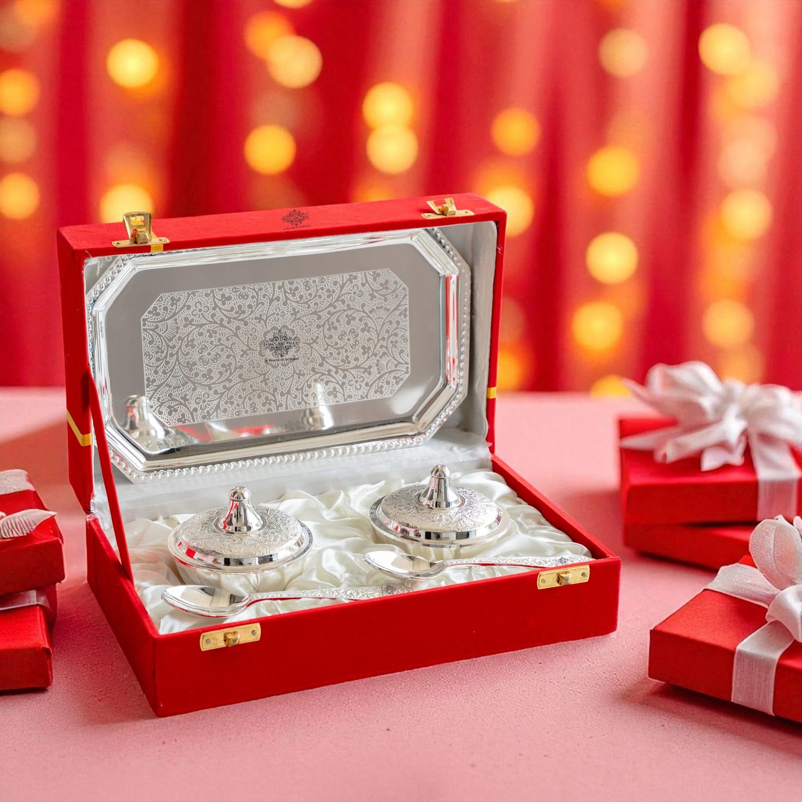 The set comprises two silver-plated betel-shaped bowls, each paired with a delicately engraved spoon. These pieces rest on a stunning silver-plated octagonal tray, accentuated with raised bead borders and embossed patterns for a refined and festive look.