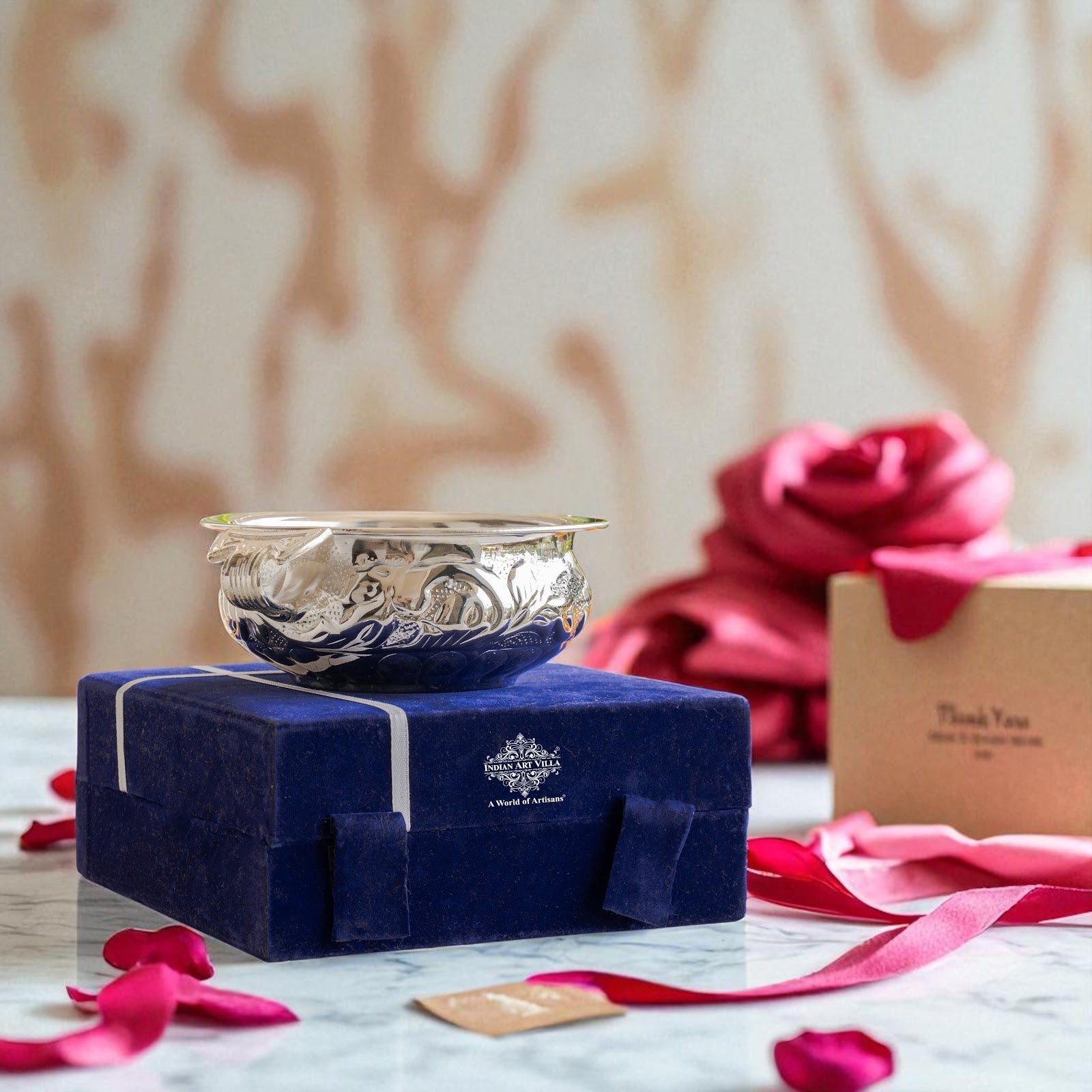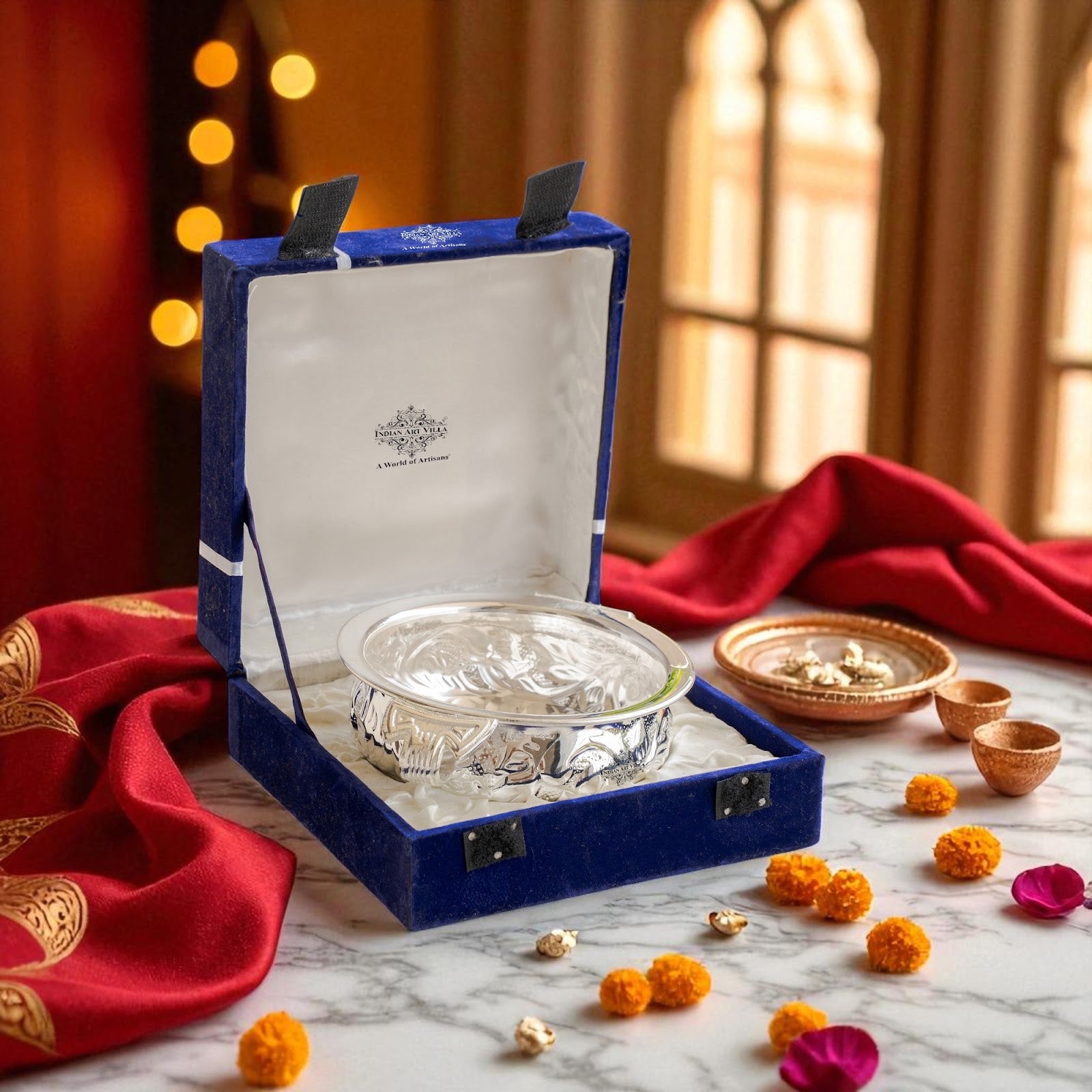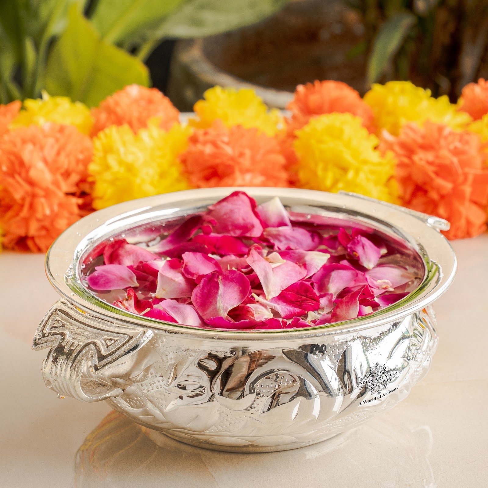Indian Art Villa Pure Silver Plated Urli is a stunning home decorative item that exemplifies the rich heritage and craftsmanship of traditional Indian artistry. Measuring 15.75 cm in width, this urli is the perfect size to make a significant impact without overwhelming your space. Crafted with meticulous attention to detail, the urli is handmade by skilled artisans, ensuring each piece is unique and of the highest quality. The pure silver plating gives it a luxurious and sophisticated appearance, adding a touch of opulence to your home decor. The silver finish not only enhances its aesthetic appeal but also ensures durability and longevity. This designer urli features intricate patterns and motifs that reflect the cultural richness of India. Its elegant design makes it a versatile decorative piece suitable for various settings, from living rooms and entryways to dining tables and mantels. Traditionally, urlis are used to hold water and floating flowers or candles, creating a serene and inviting ambiance. Indian Art Villa Pure Silver Plated Urli into your home decor brings a sense of tradition and elegance. It serves as a beautiful centerpiece that can enhance the aesthetic appeal of any room, making it a perfect addition for festive occasions or everyday use. This urli not only decorates your space but also connects you to the cultural traditions of India symbolizing prosperity and positivity.