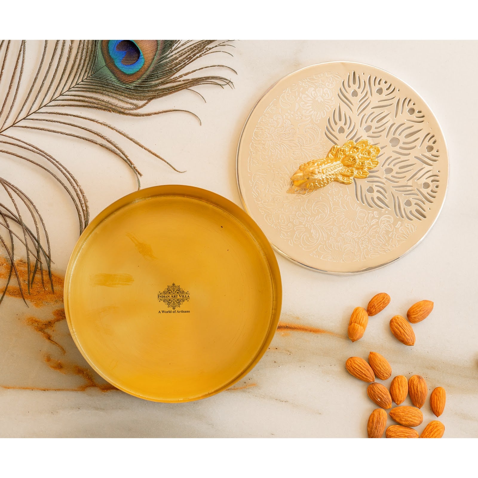 INDIAN ART VILLA Silver-Plated & Brass Multipurpose Box with Peacock Design Lid With its compact yet spacious size, this multipurpose box is perfect for storing dry fruits, sweets, spices, condiments, or even jewelry and small keep snakes. The gold and silver finish creates a striking contrast, making it a stunning centerpiece for your kitchen, dining table, or living space. Its versatile design makes it ideal for serving during gatherings or simply adding a decorative touch to your home. This elegant box also makes a thoughtful gift for loved ones on special occasions like weddings, housewarmings, anniversaries, and festivals. Handcrafted by skilled Indian artisans, the Indian Art Villa Silver-Plated & Brass Multipurpose Box is more than just a storage container – it’s a timeless piece of art that combines heritage, style, and practicality. Perfect for personal use, gifting, or as a decorative addition to your home, this box is a must-have for those who appreciate fine craftsmanship and elegance.