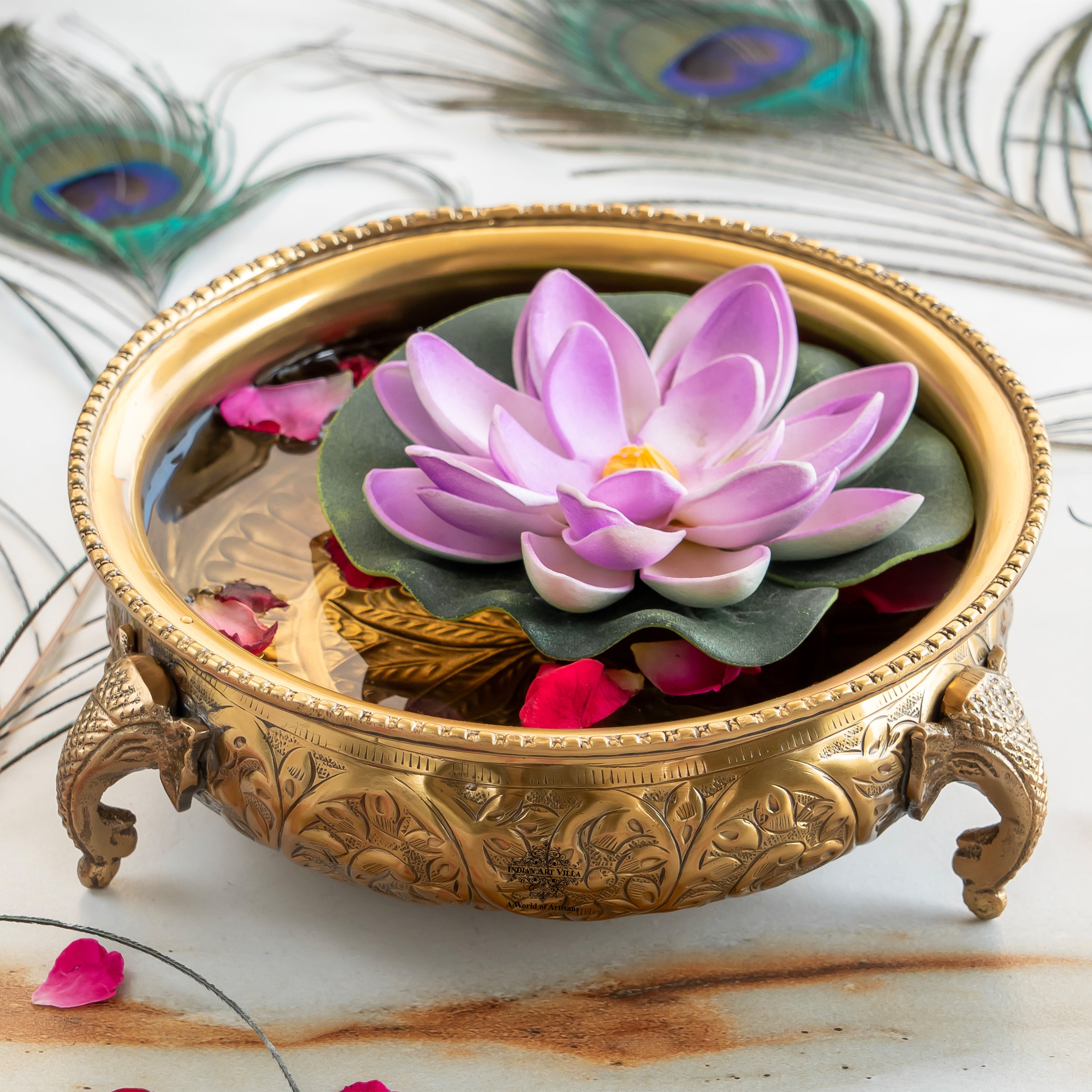 Made from pure brass, this urli showcases exquisite hand-embossed floral and vine patterns across its round bowl. Its standout feature lies in the three elephant trunk-shaped legs, each sculpted with intricate detailing that symbolizes strength, wisdom, and prosperity in Indian culture. This majestic design not only adds visual appeal but also provides a stable and elevated base to enhance its presence wherever placed.