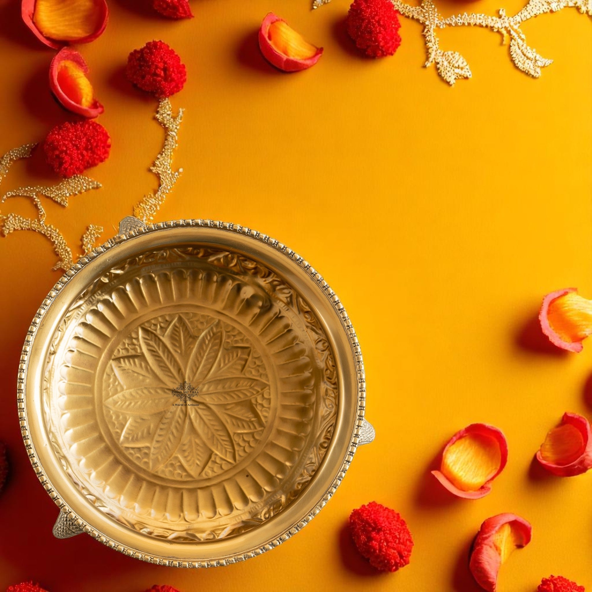 Bring home a touch of tradition and timeless artistry with the Indian Art Villa Brass Urli with Elephant Trunk Legs and Embossed Design. Carefully handcrafted by skilled Indian artisans, this urli combines symbolic beauty with functional elegance—making it an ideal addition to your festive décor or sacred space.