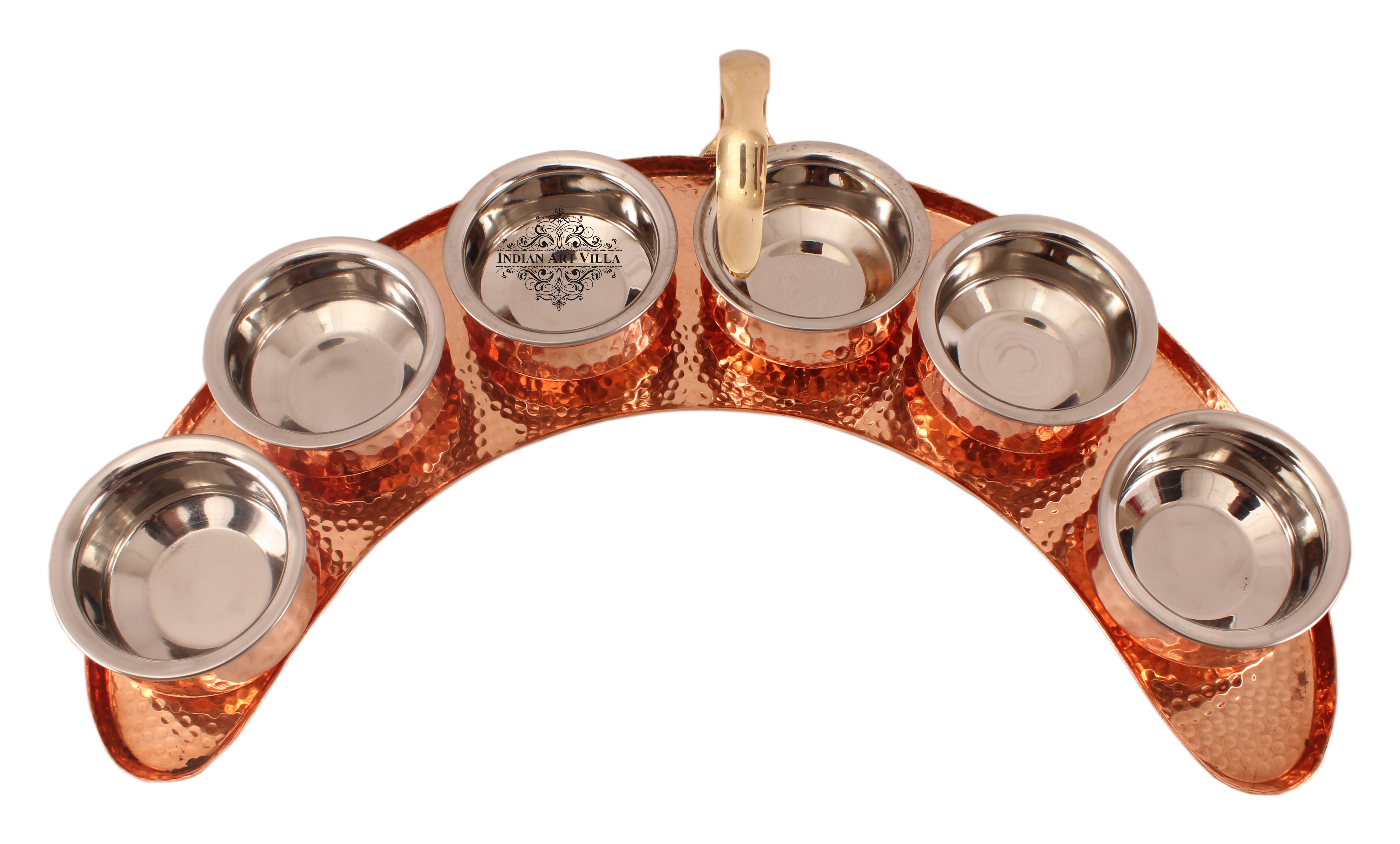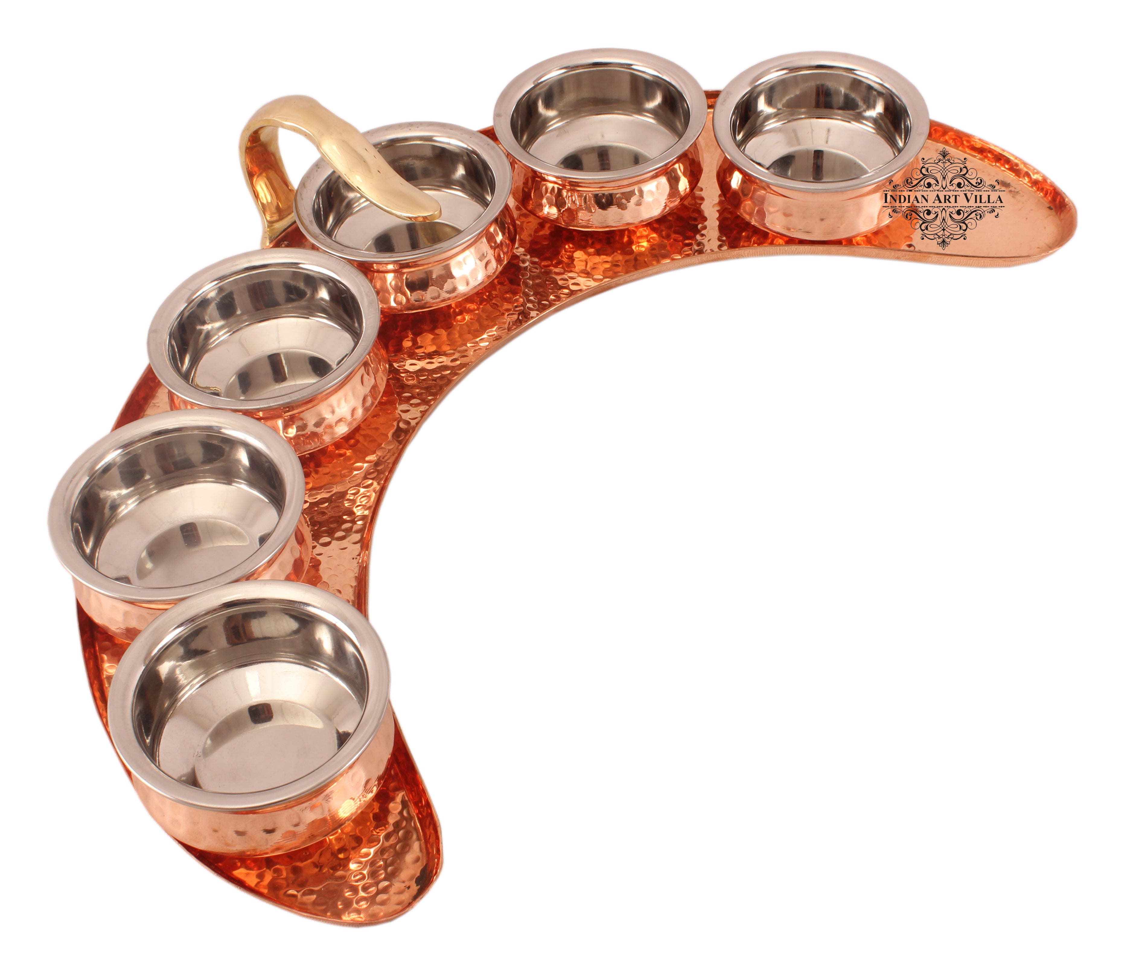 - Indian Art Villa Pure Copper Maharaja Style Full Moon Tray Plate with 6 Serving Sauce Pots, it was almost impossible to find one that came in a design other than the plain one. Indian Art Villa Provide You with different designs to choose from, allowing you to pick your favorite design or collect them all for those who want a variety of options.