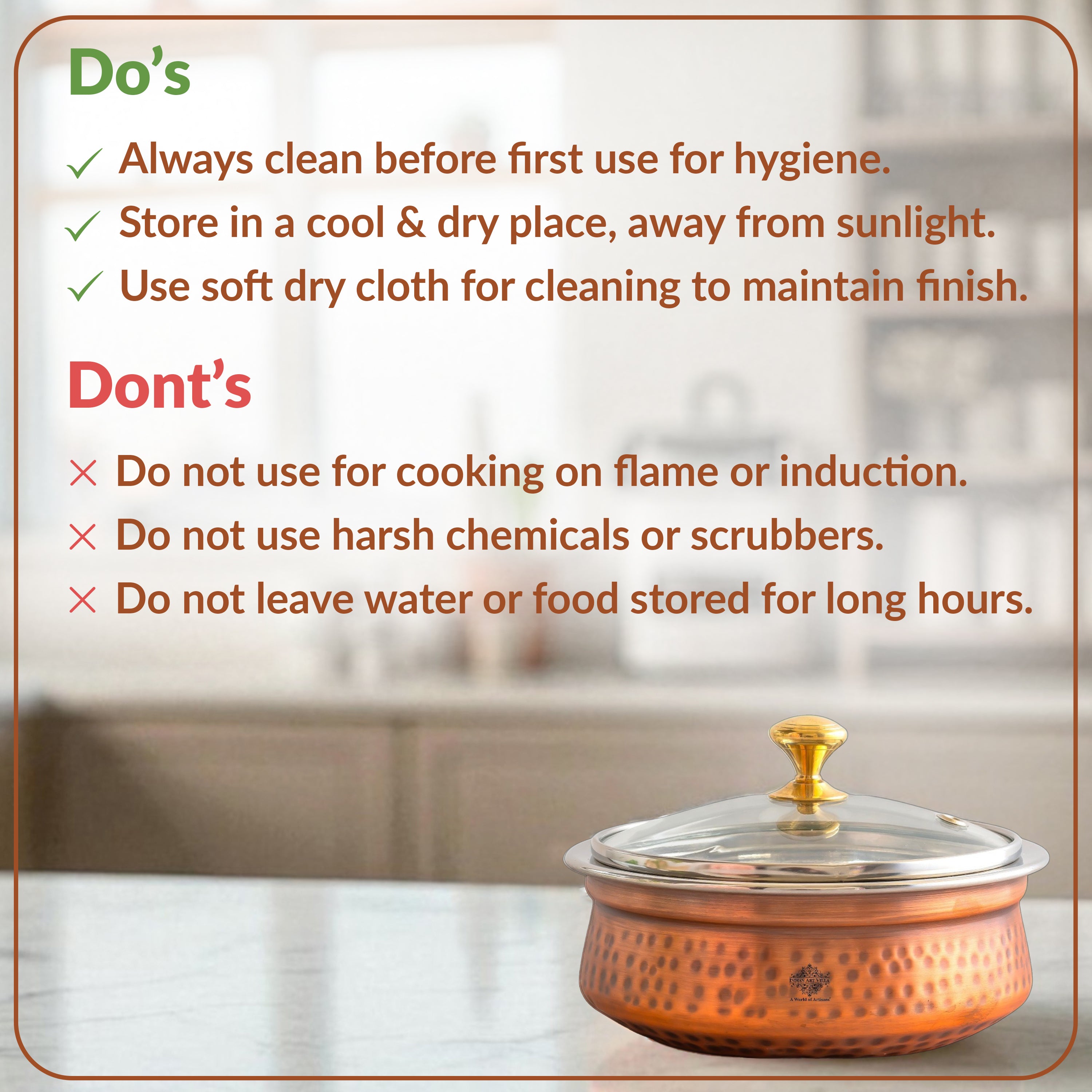 Our Products come with INDIAN ART VILLA Care instruction Booklet & Sample Cleaning Powder, so our customer cum family faces no problem while using the product.