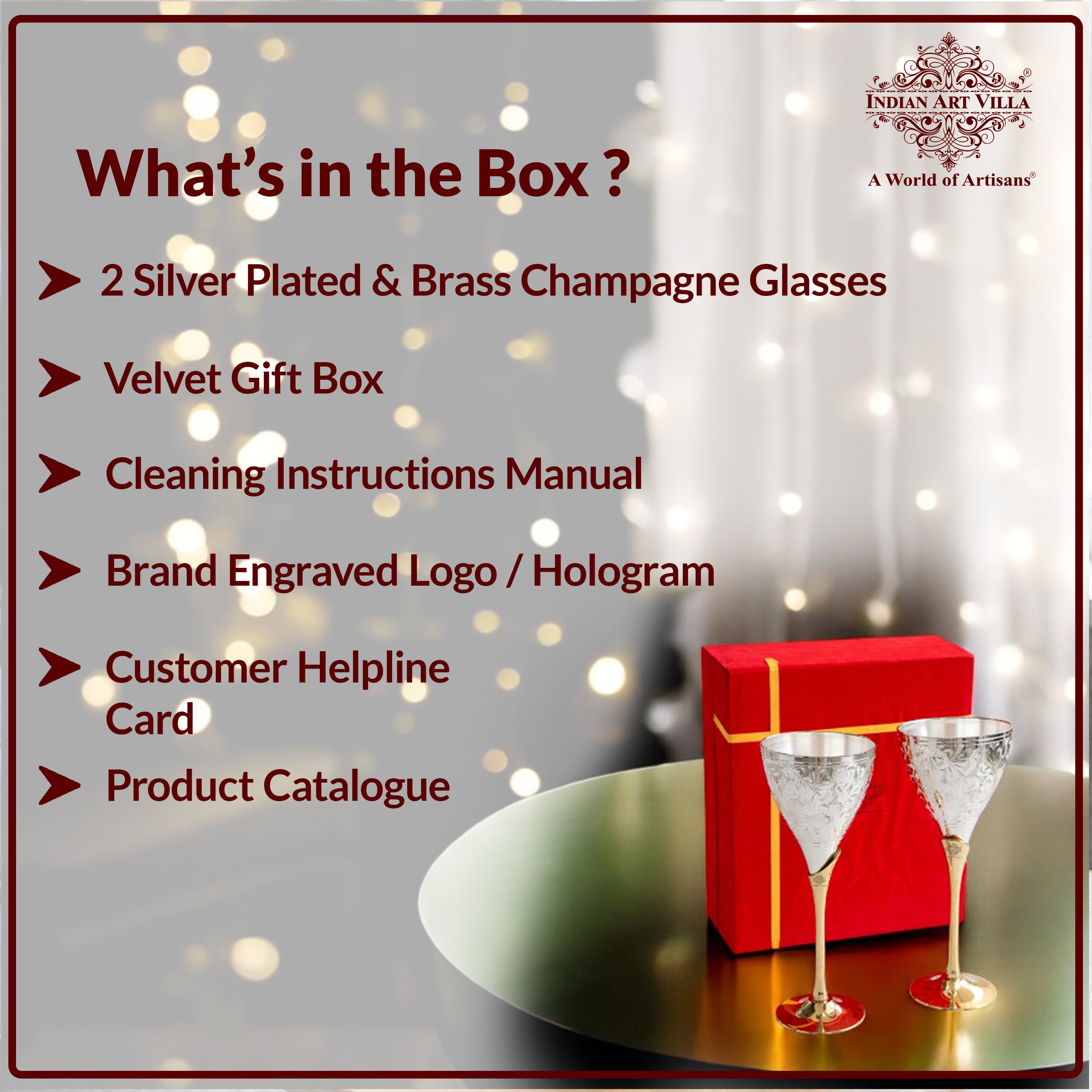 Set of 2 Silver Plated & Brass Champagne Engraved Wine Glass With Red Box