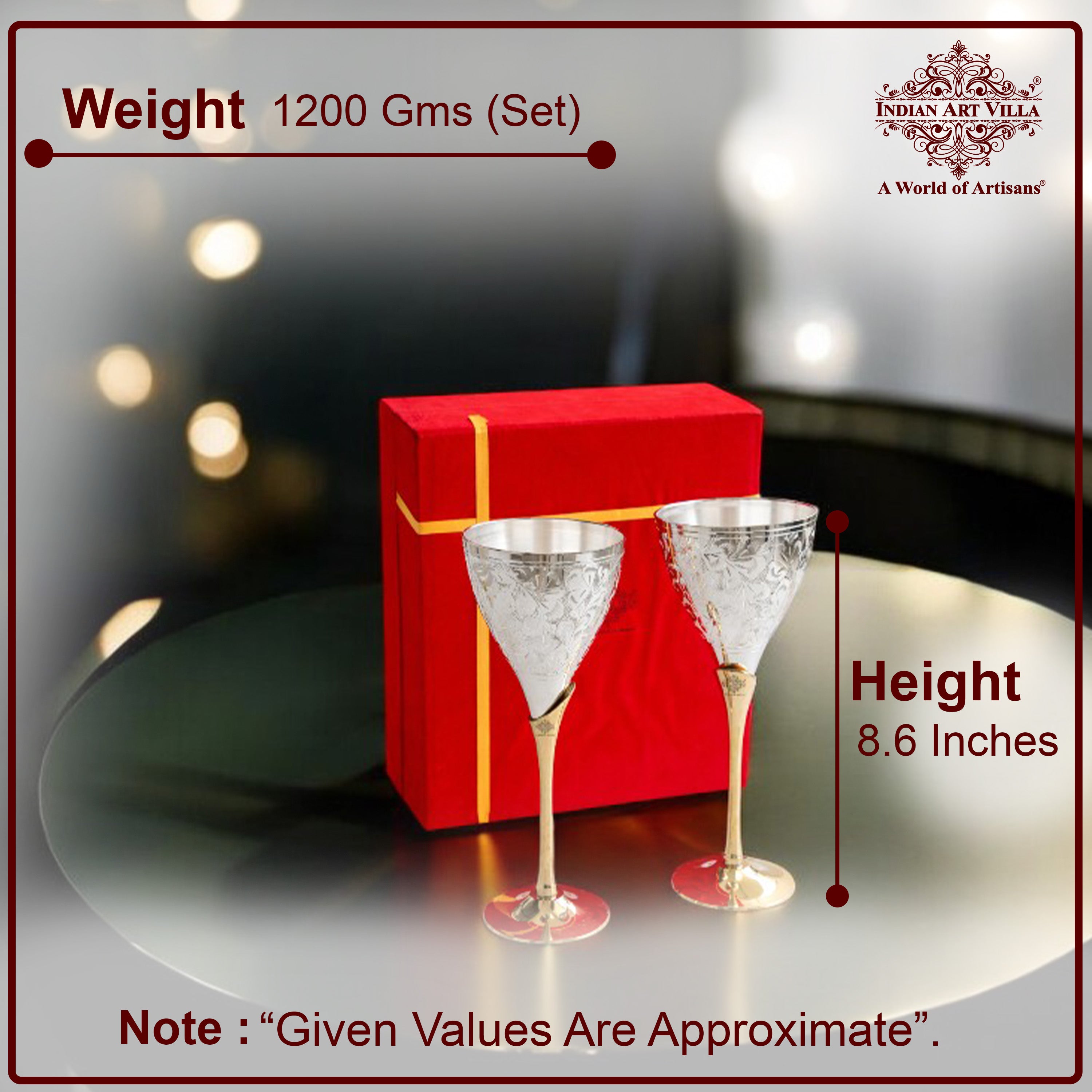 Indian Art Villa Pure Silver Plated Engraved Goblet Flute Wine Glass, accompanied by a stunning red box, perfect for adding a touch of elegance to your parties and special gatherings. Crafted with precision and artistry, this wine glass boasts a timeless design, featuring intricate engravings that showcase the rich heritage of Indian craftsmanship. The silver-plated finish adds a glimmer of sophistication, making it a striking centerpiece on any table setting. Whether you're celebrating with friends, hosting a formal dinner, or simply indulging in a relaxing evening, this goblet flute is the epitome of refinement and style. With its ergonomic shape, the wine glass fits comfortably in your hand, enhancing your sipping experience. Ideal for serving sparkling wines, champagne, and other celebratory spirits, this piece is bound to impress your guests and leave a lasting impression. Unlock the allure of luxury and elevate your entertaining with the Indian Art Villa Pure Silver Plated Engraved Goblet Flute Wine Glass - a true symbol of opulence and grace.