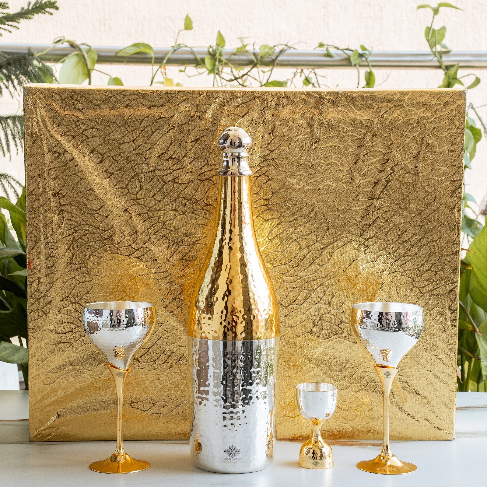 • Indian Art Villa Silver & Gold Plated Champagne Bottle, 2 Wine Glass & Peg Measure, it was almost impossible to find one that came in a design other than the plain one. Indian Art Villa Provide You with different designs to choose from, allowing you to pick your favorite design or collect them all for those who want a variety of options.