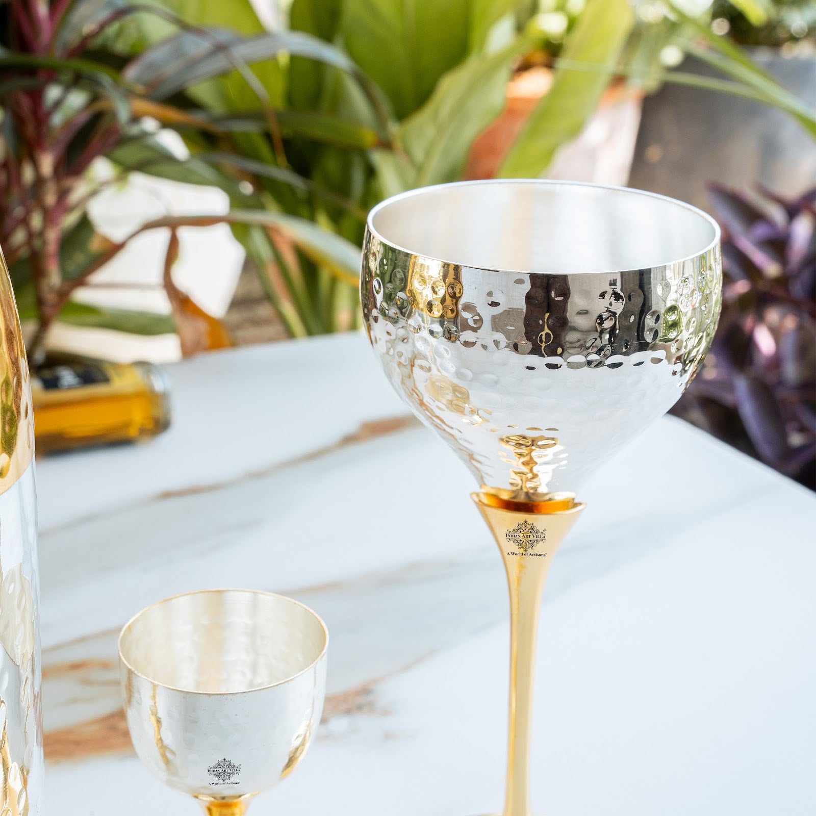 Indian Art Villa Silver & Gold Plated Champagne Bottle Set, a stunning barware gift for those who appreciate the finer things in life. This exquisite set includes a champagne bottle, two wine glasses, and a peg measure, all beautifully crafted with silver and gold plating. The champagne bottle and wine glasses showcase intricate detailing and a luxurious shine, adding an elegant touch to any celebration or special occasion. The peg measure ensures precise pours, allowing you to savor your favorite spirits with style and sophistication. Whether you're hosting a lavish party or looking for a memorable gift, this barware set is sure to impress. It combines timeless aesthetics with exceptional craftsmanship, creating a statement piece that exudes opulence and refinement. Elevate your drinking experience and indulge in the artistry of the Indian Art Villa Silver & Gold Plated Champagne Bottle Set, a true symbol of luxury and prestige.