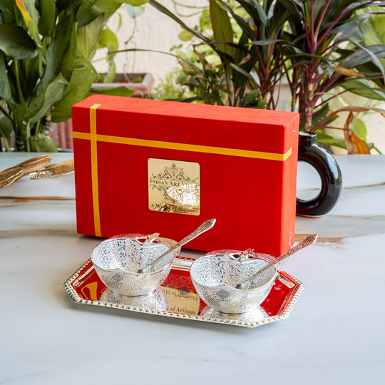 Pure Brass With Silver Plating & Gold Polished 2 Bowl, 2 Spoon & 1 Tray Set With Red Velvet Gift Box