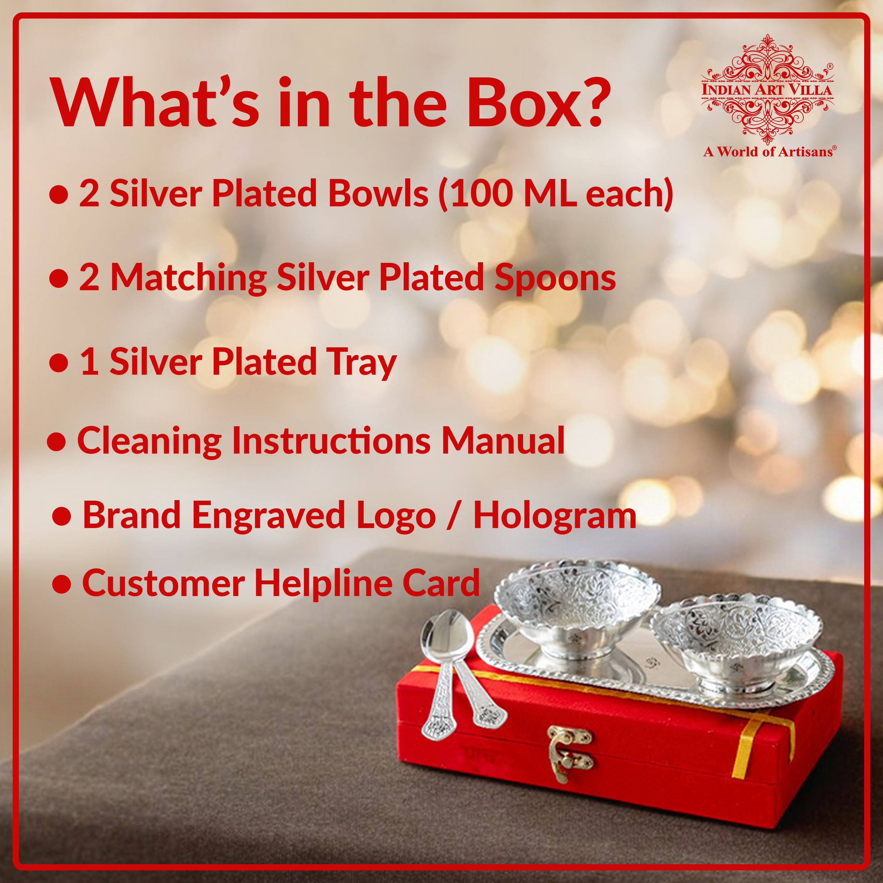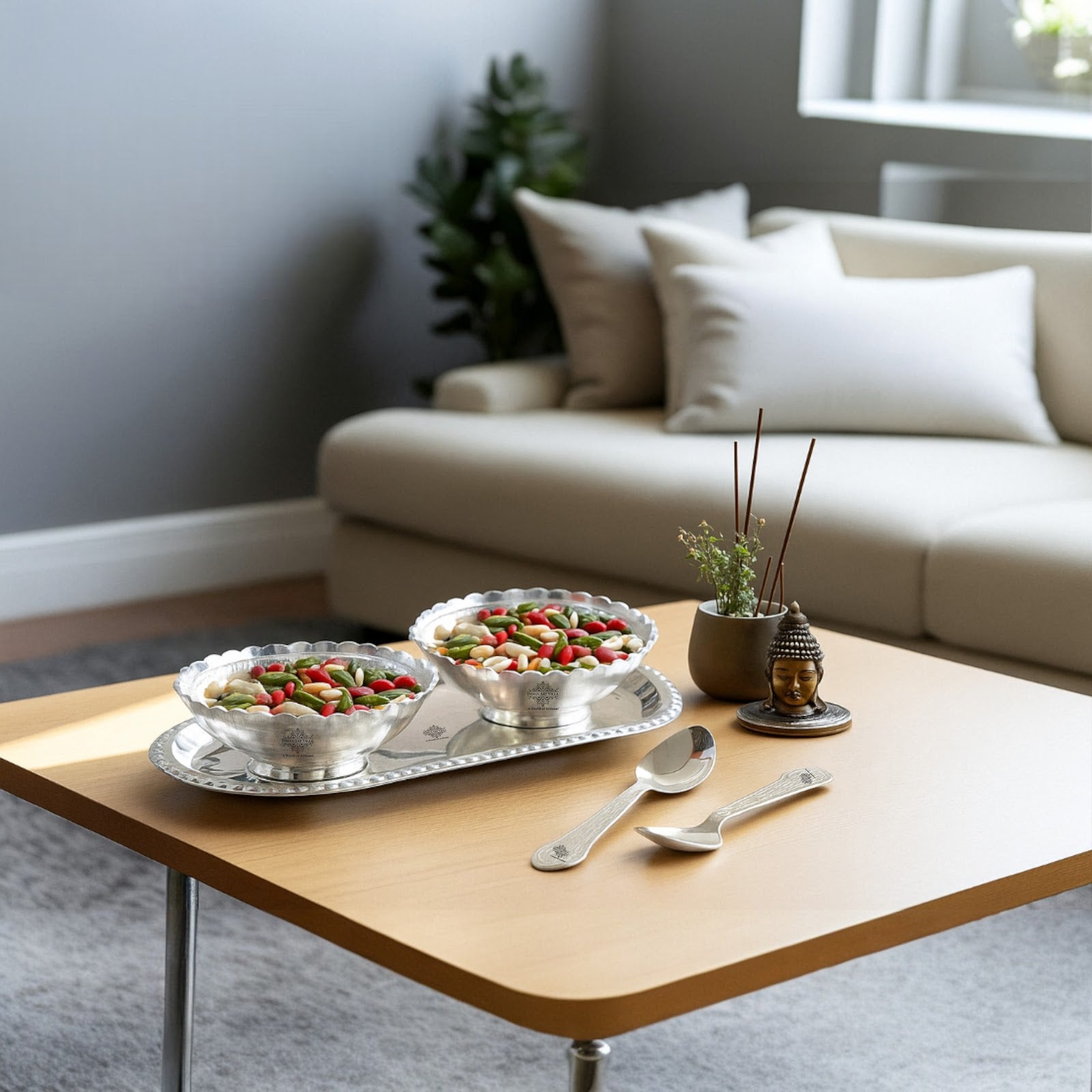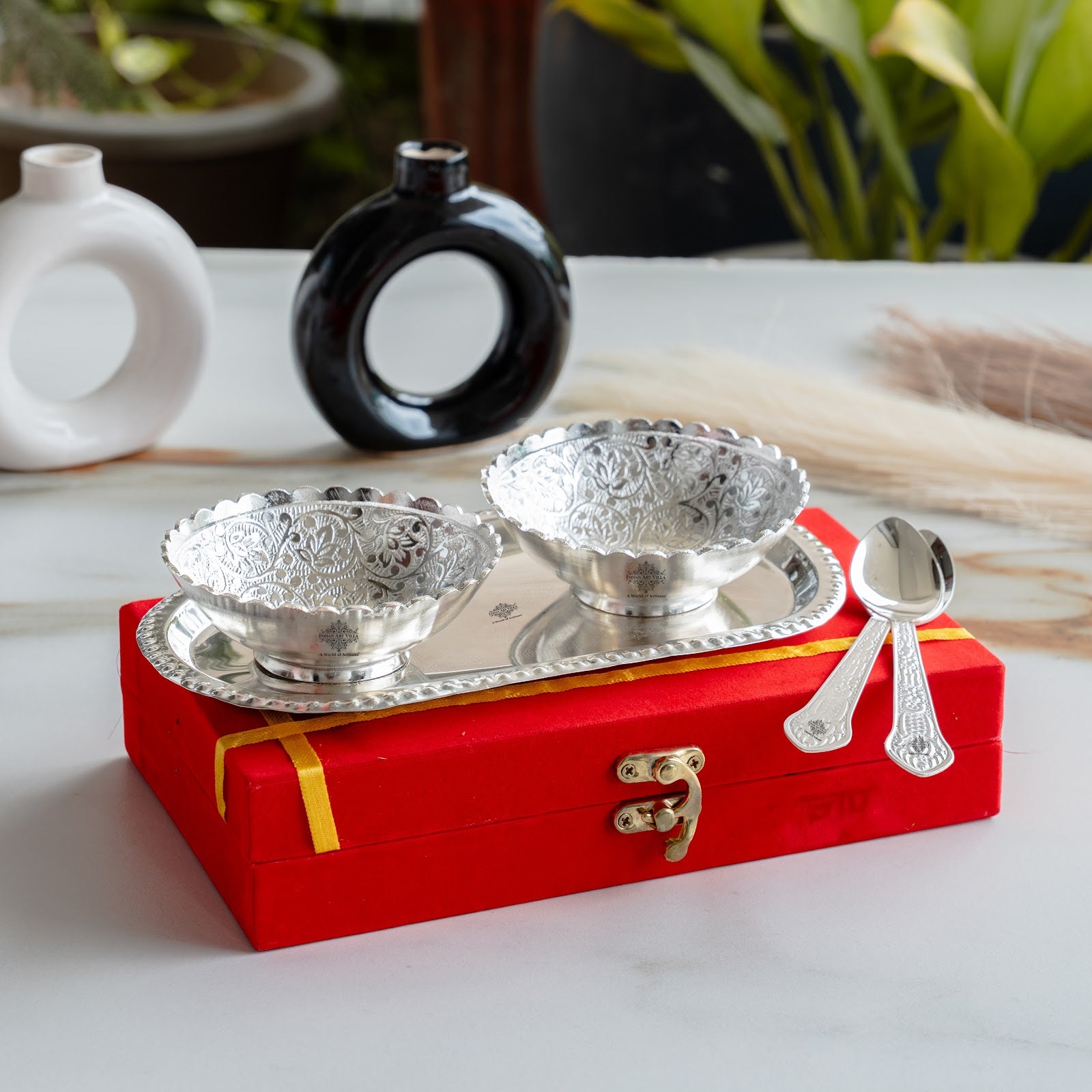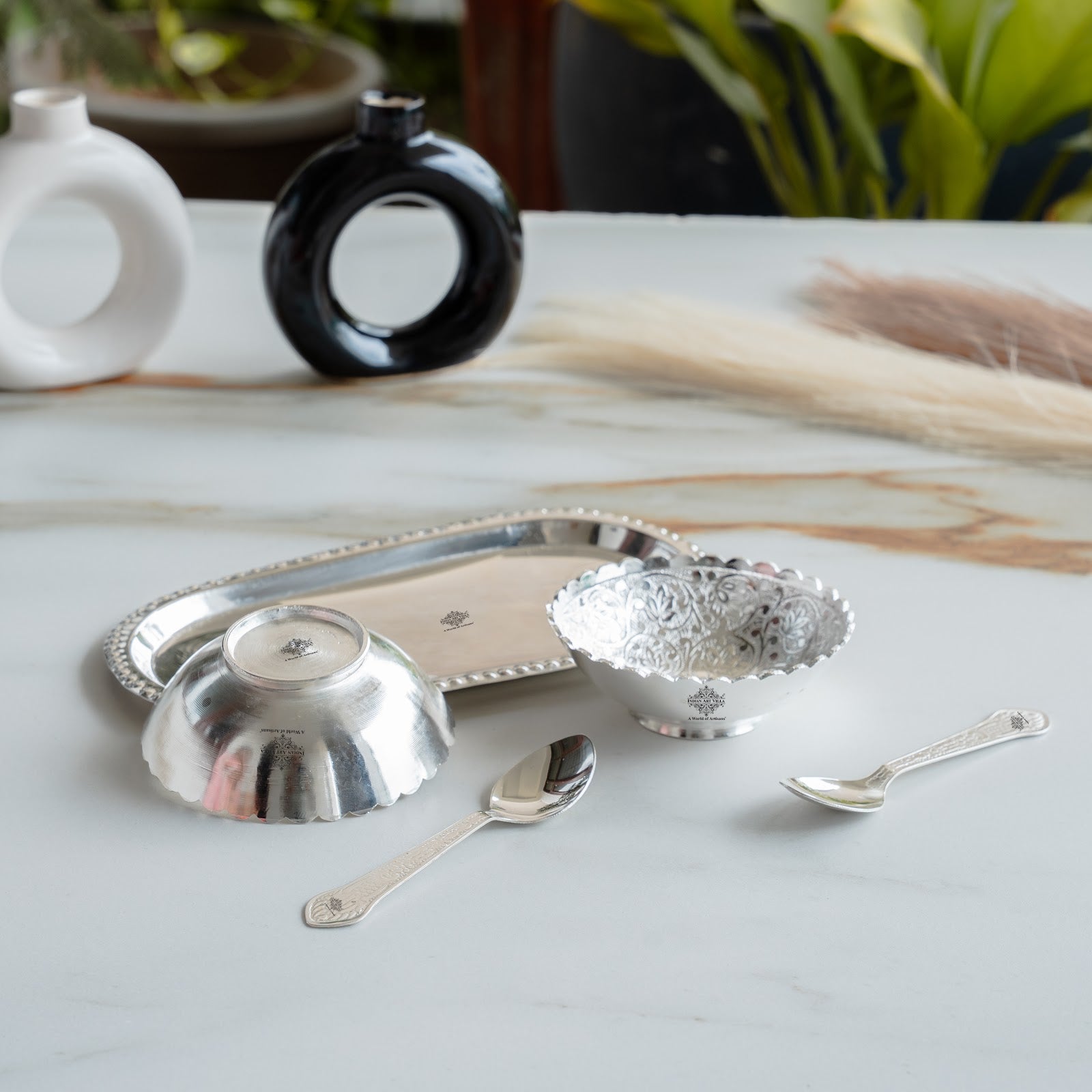 Handcrafted Silver Plated Designer Bowl Set with 2 Bowl, 2 Spoon, 1 Tray