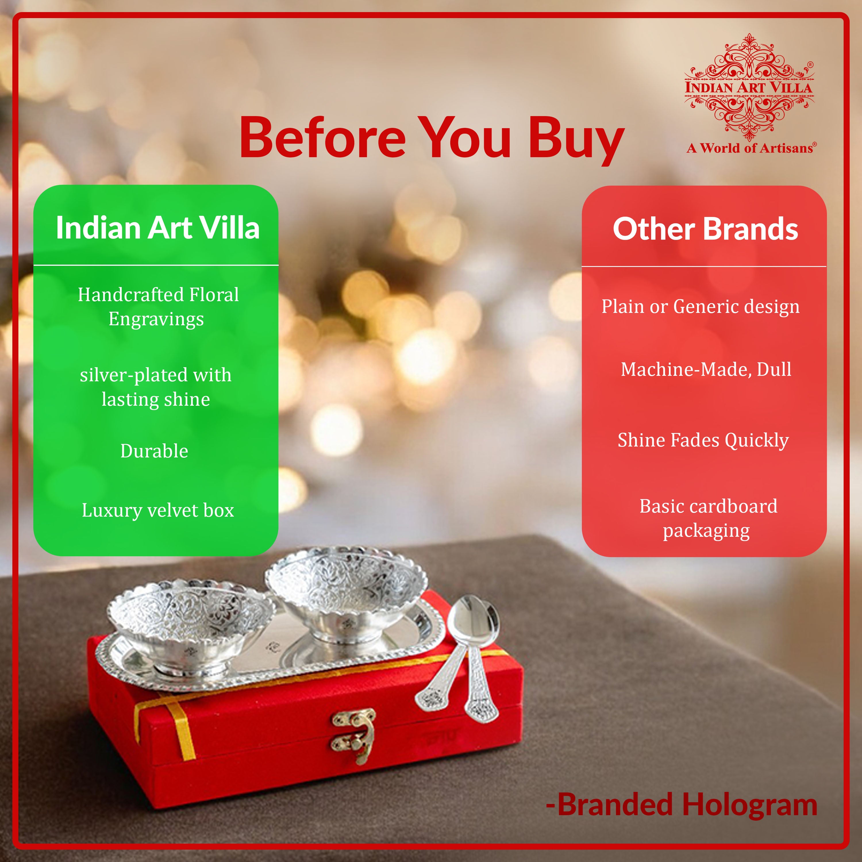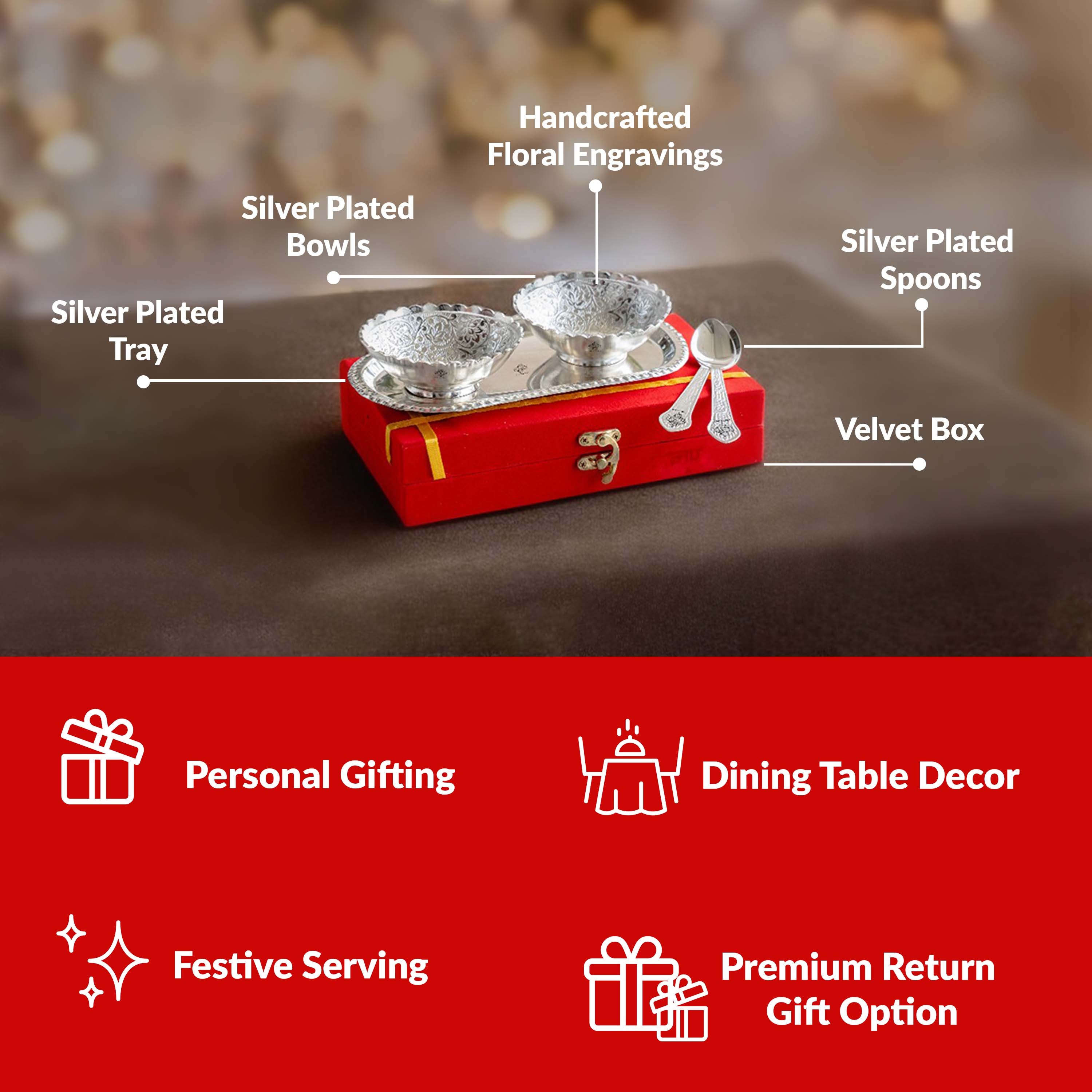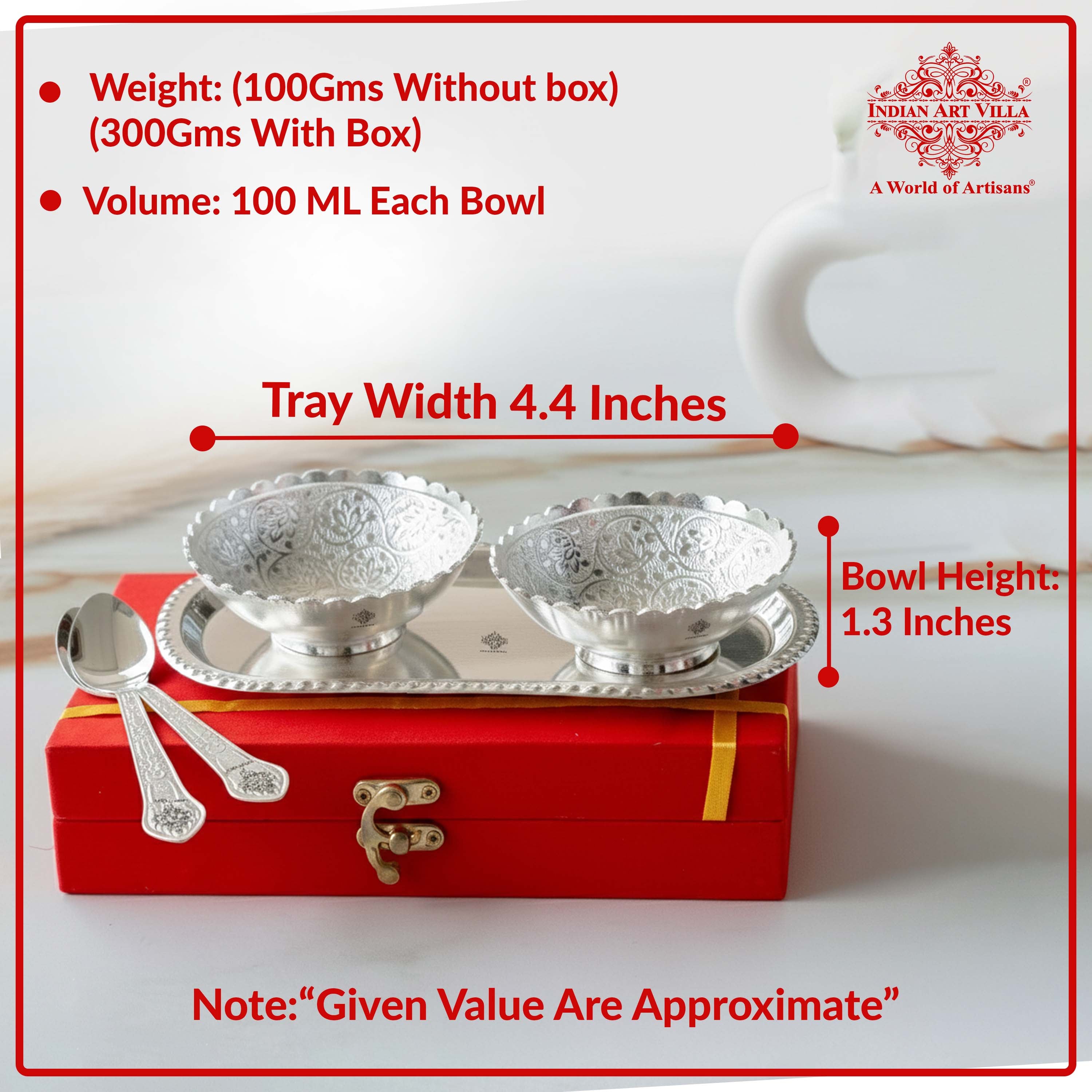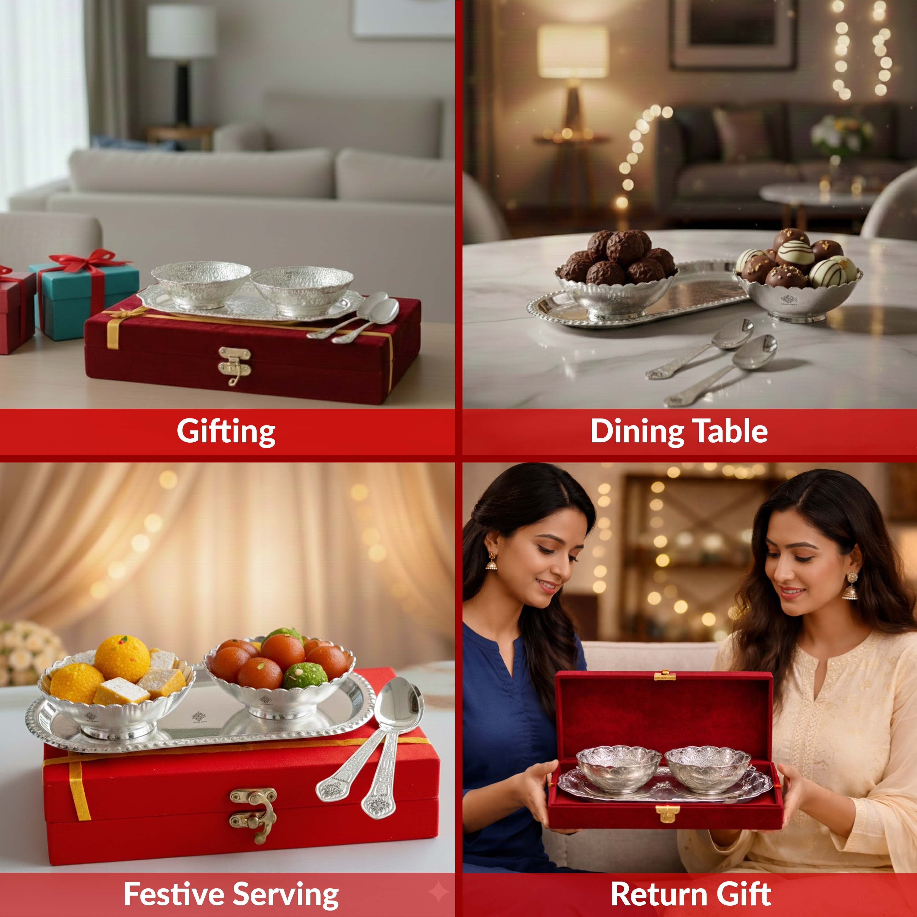 Handcrafted Silver Plated Designer Bowl Set with 2 Bowl, 2 Spoon, 1 Tray